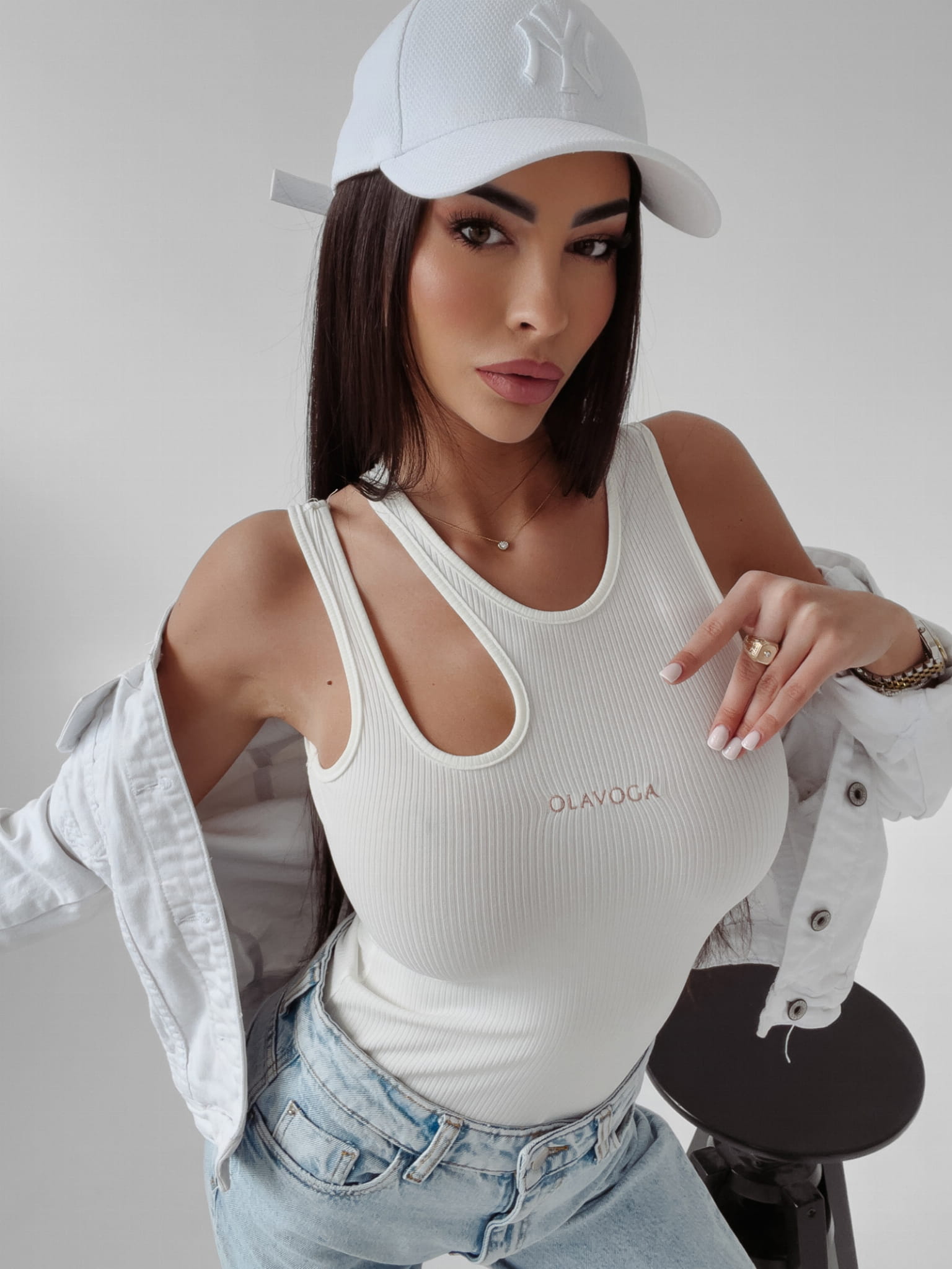 Body uszyte z prążkowanej, miękkiej bawełny. Model z asymetrycznym, fantazyjnym dekoltem. Idealnie sprawdzi się do jeansów, szortów czy dopasowanej spódniczki.
