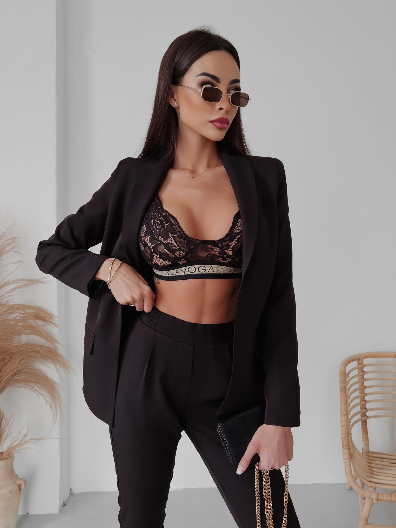 Casualowy, prosty garnitur składający się z gładkiego żakietu i spodni typu cygaretki. Na ramionach wszyte cienkie poduszki, ozdobne klapy oraz klapki imitujące kieszenie dodają stylizacji elegancji. Spodnie o długości 7/8, z kieszeniami i gumą w pasie świetnie układają się na sylwetce.