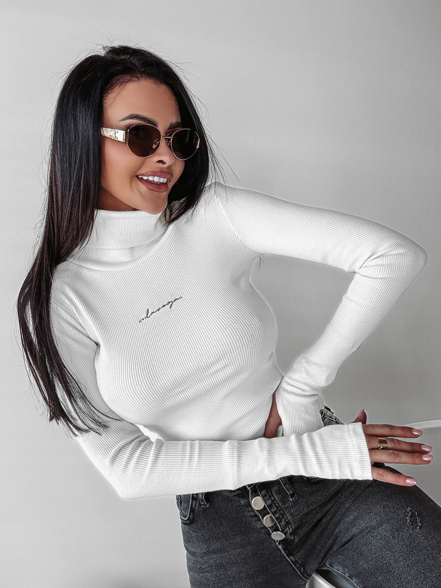 Golf z prążkowanej, bardzo dobrze układającej się dzianiny. Długi rękaw z wycięciem na palec. Na przodzie haft z pisanym logo marki w kolorze kontrastowej nitki.