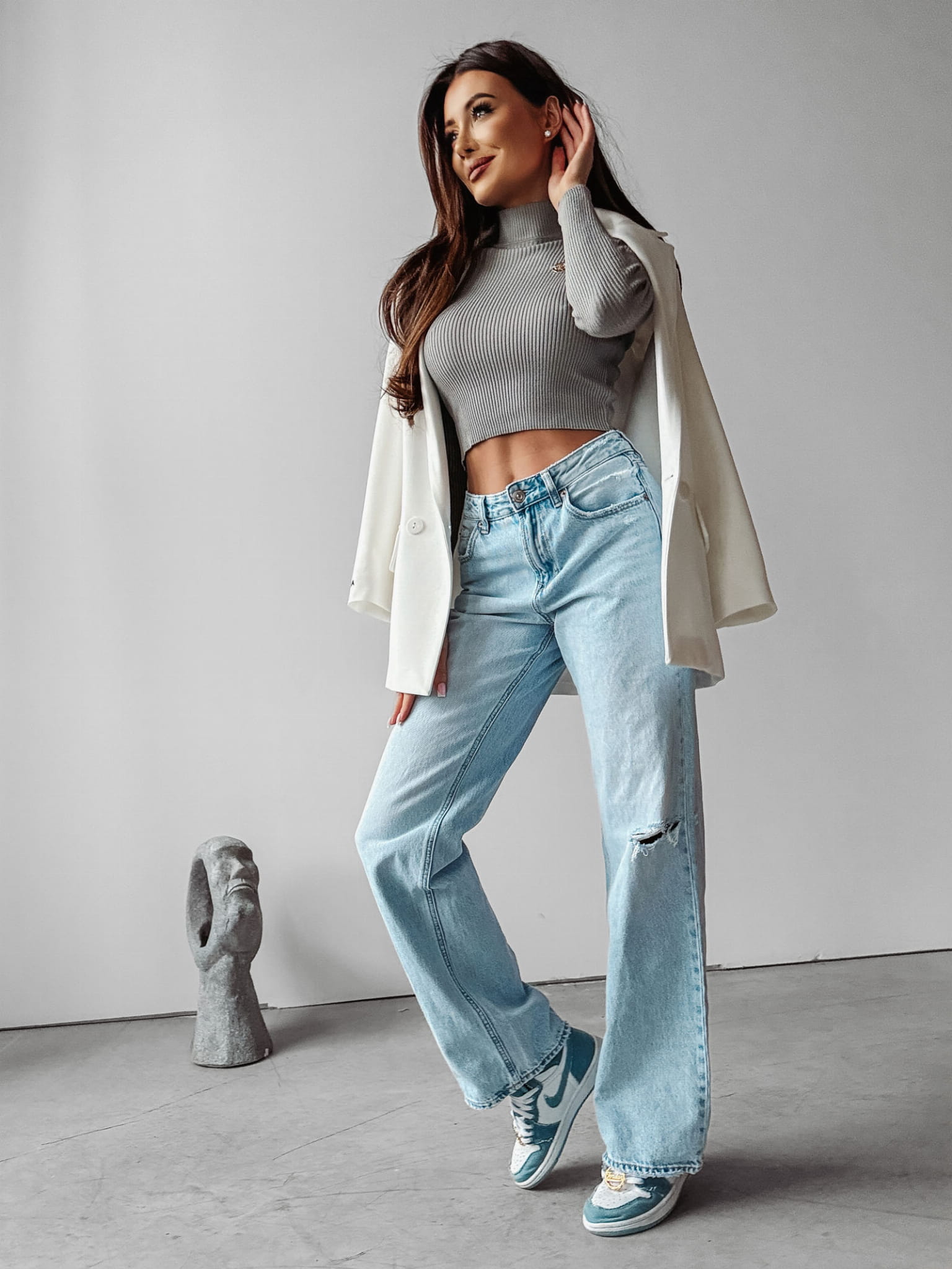Gładki, basicowy golf, uszyty z miękkiej, prążkowanej dzianiny o ciekawej teksturze. Na przodzie złoty pin z symbolem brandu.