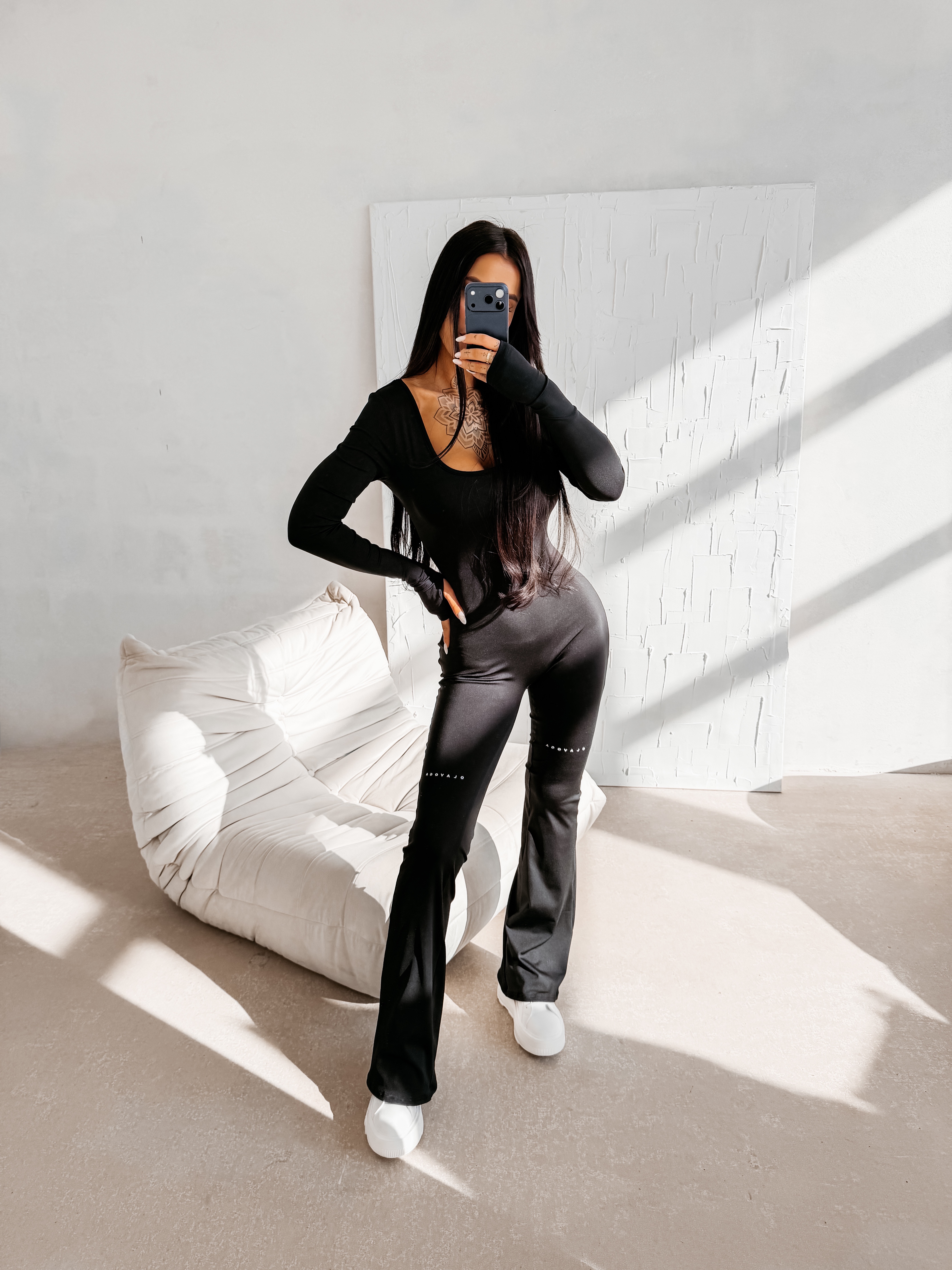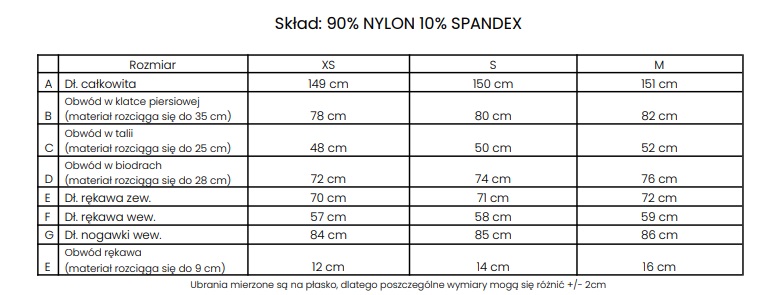 Dopasowany krój - elastyczna tkanina - modelujący sylwetkę - długi rękaw zakończony otworem na kciuk - dekolt typu scoop - rozszerzana nogawka - asymetryczne wycięcie na plecach - marszczenie na pośladkach podkreślające sylwetkę - subtelne logo 3D na plecach i nogawkach