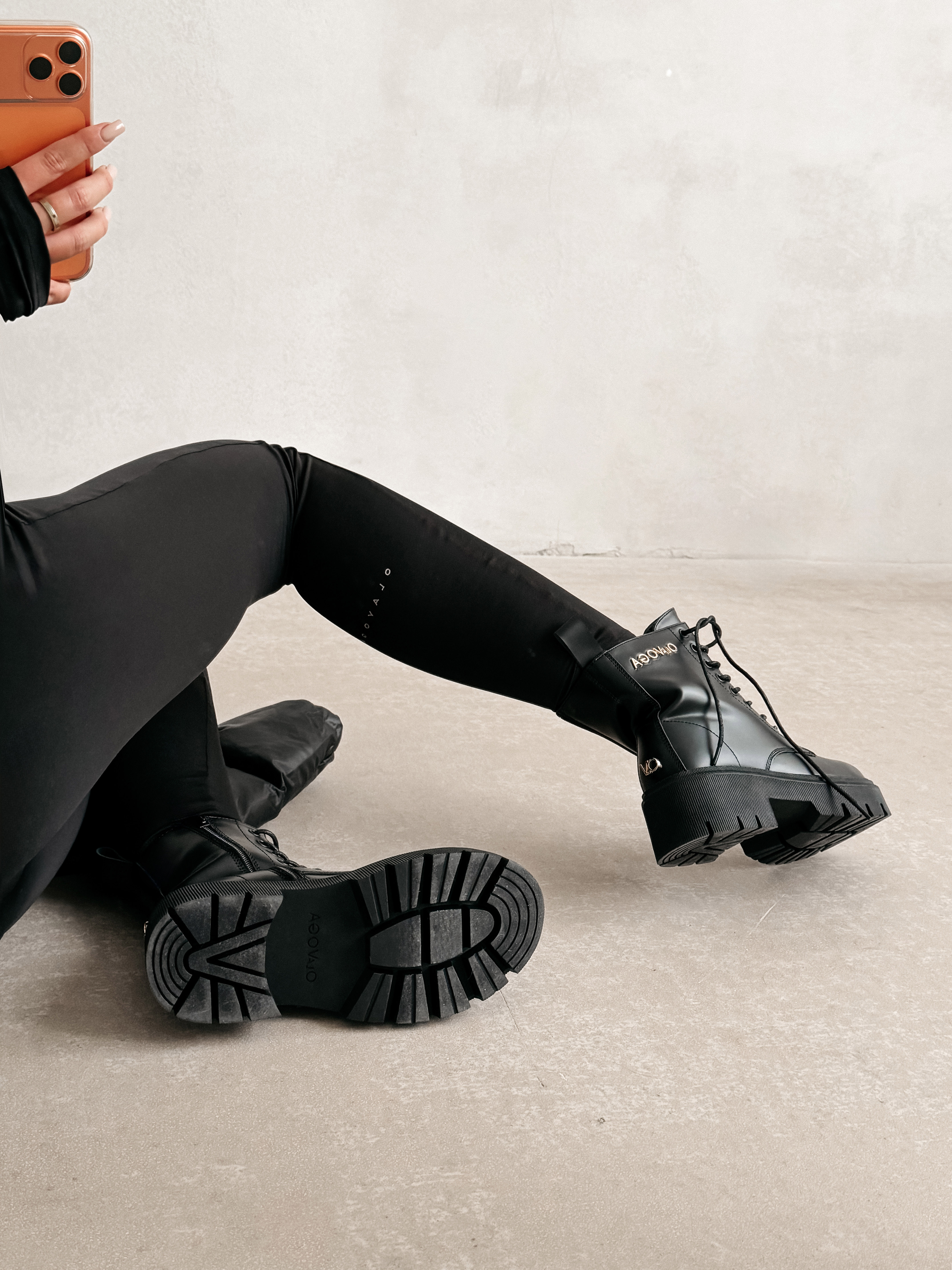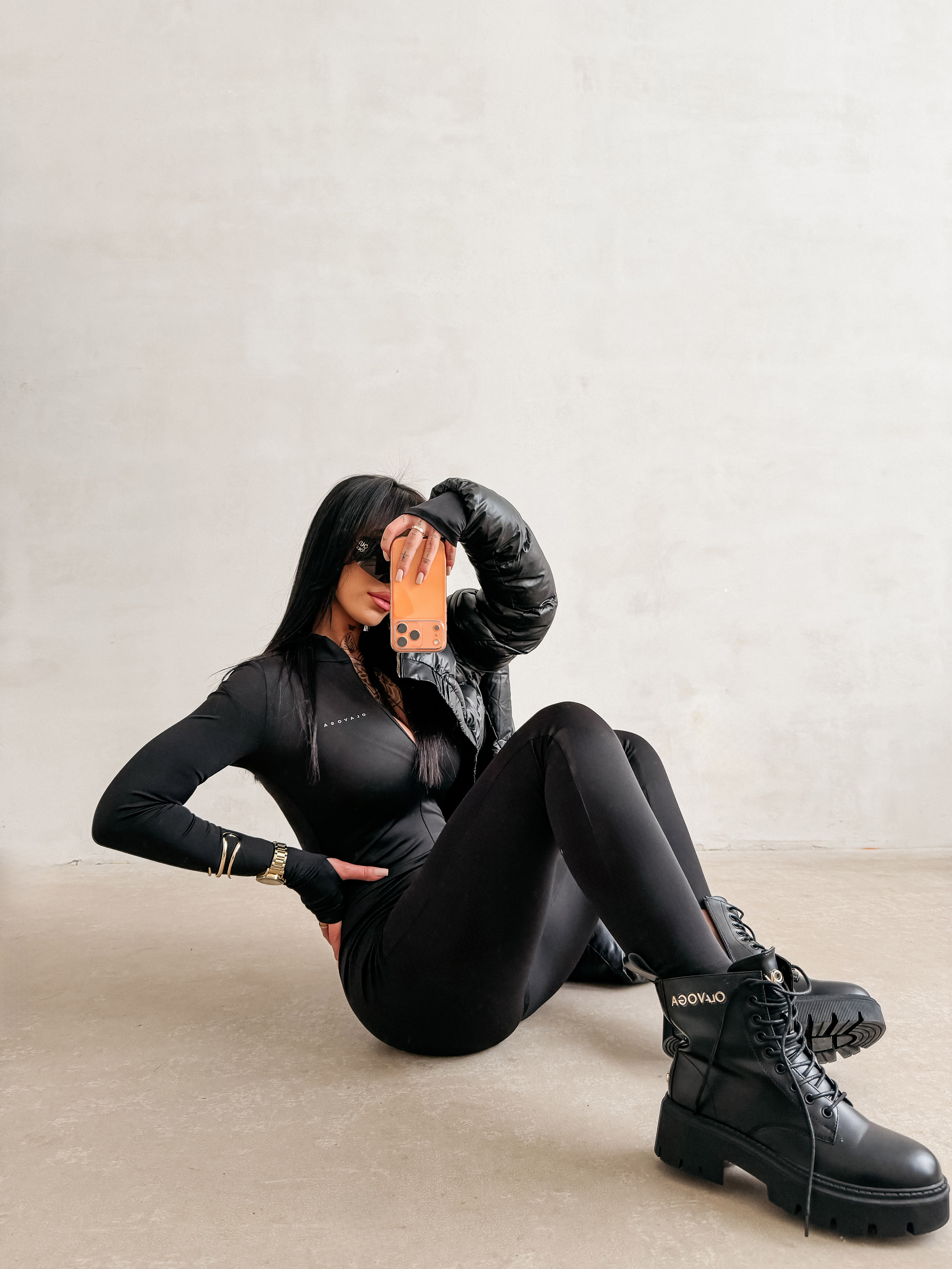 Idealnie dopasowany kombinezon o elastycznym, gładkim materiale. Model posiada długi rękaw oraz delikatnie podwyższoną stójkę zapinaną na subtelny zamek. Jednolita, czarna kolorystyka. Dyskretne logo marki OLAVOGA na przodzie.