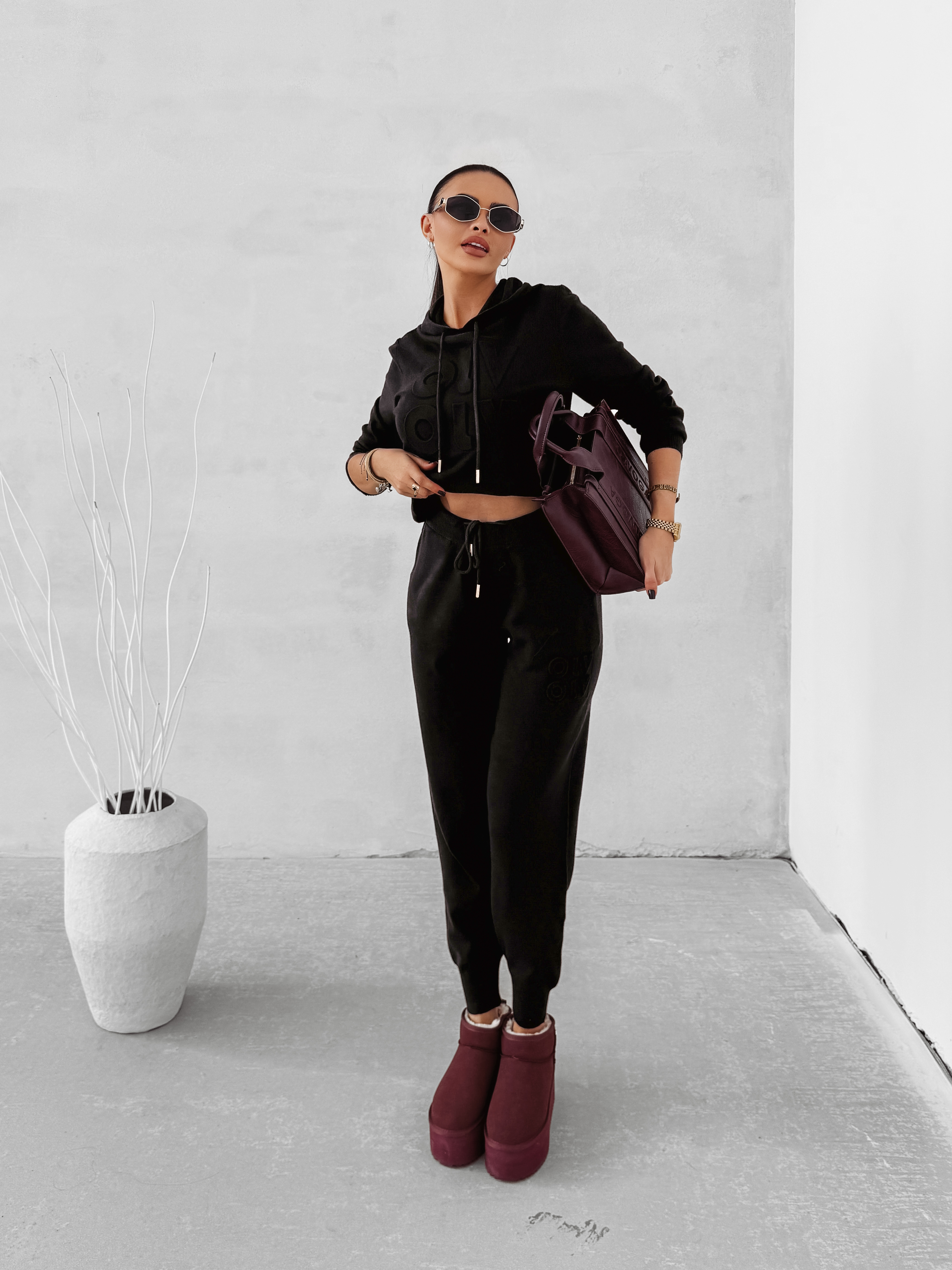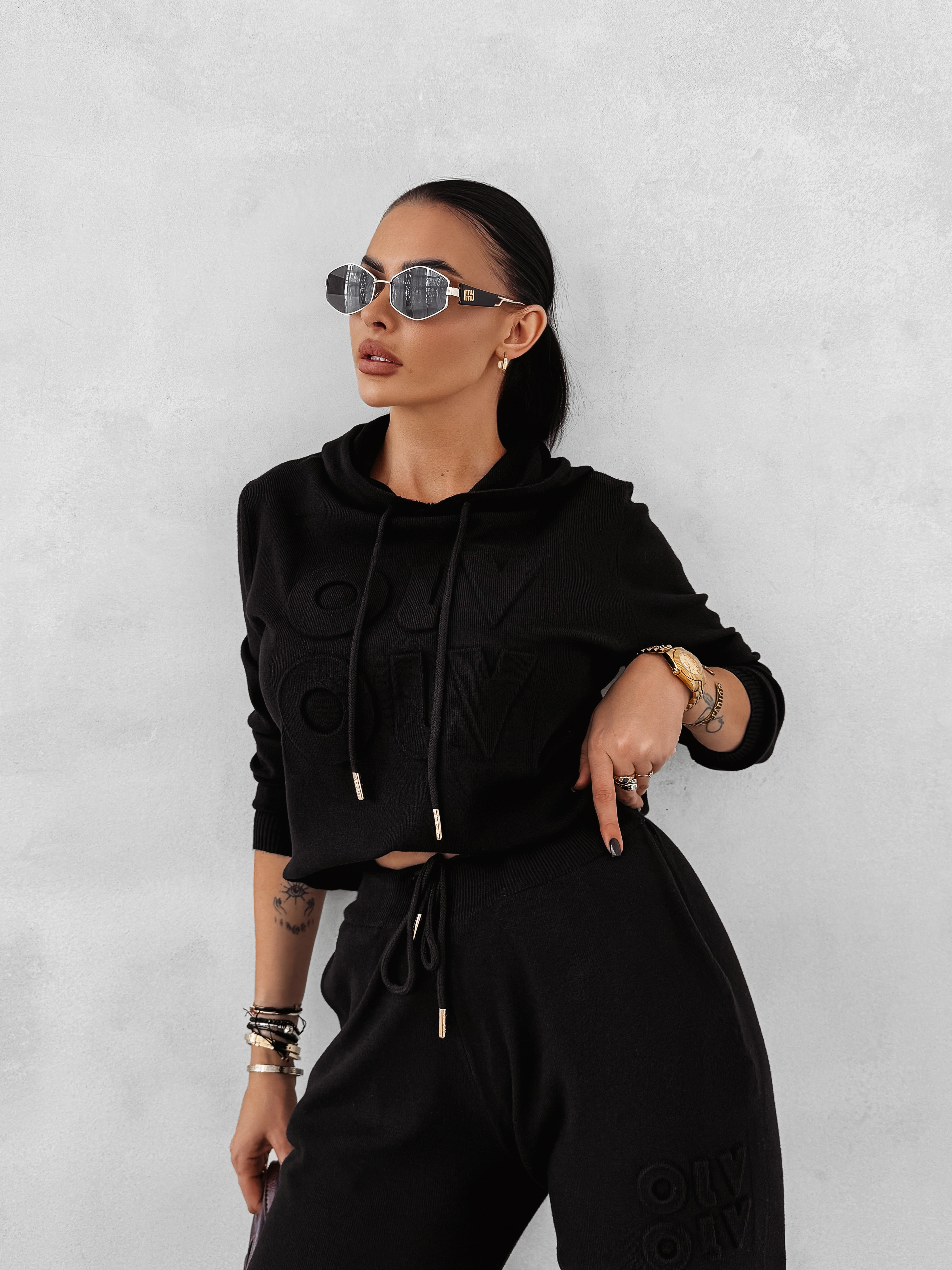 Sportowy komplet damski, wykonany z wysokiej jakości elastycznego materiału z domieszką wiskozy. Góra - bluza z regulowanym. Na brzegach prążkowane ściągacze. Logowane aglety. Na przodzie obszerny, tłoczony napis OLV. Dół - spodnie o zwężanym kroju i elastycznym, regulowanym pasie. Logowane, złote aglety. Na boku tłoczone logowanie.