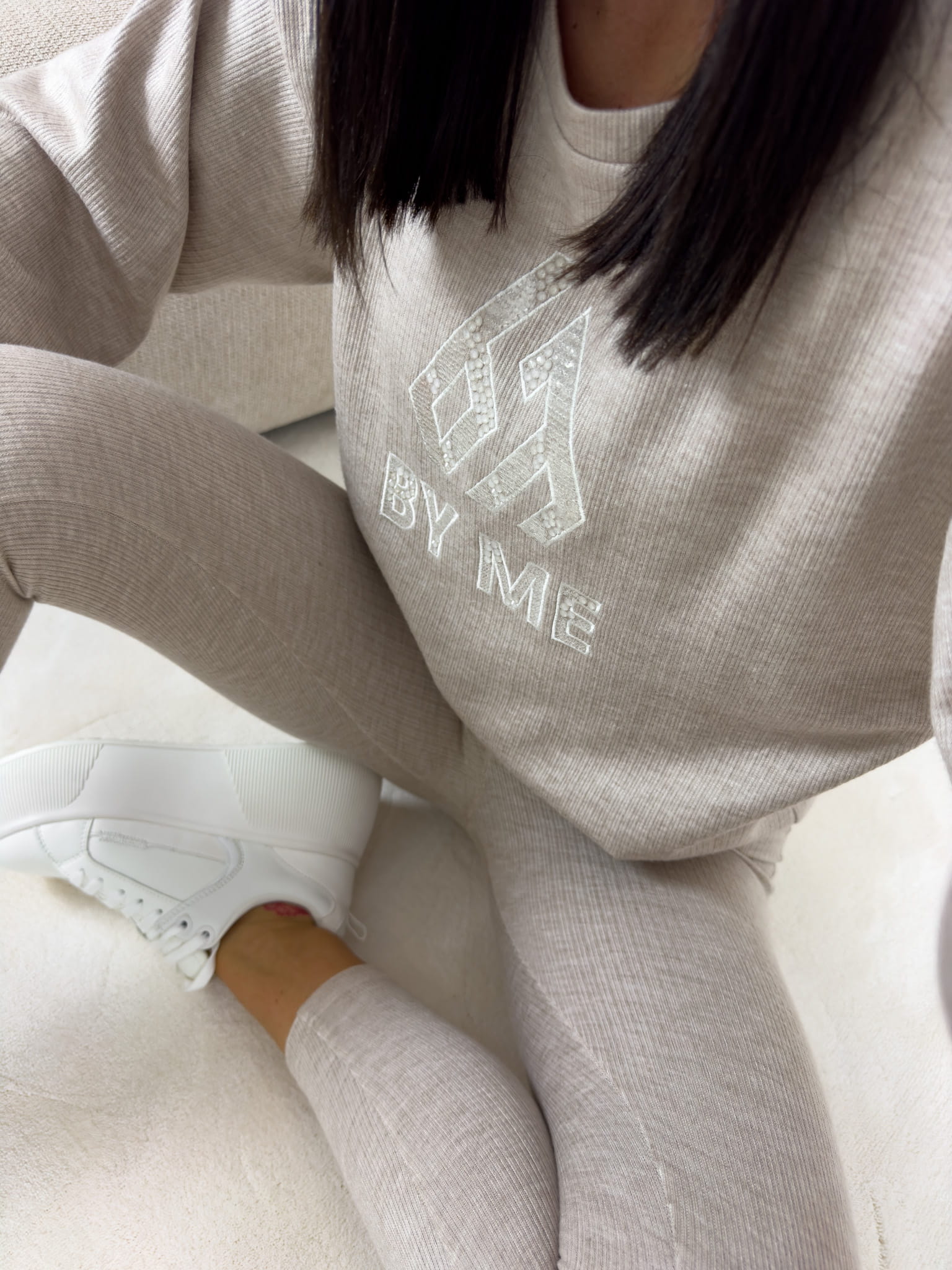 Komplet Addict składający się z bluzy wkładanej przez głowę oraz dopasowanych legginsów z gumką w pasie. Materiał sweterkowy.