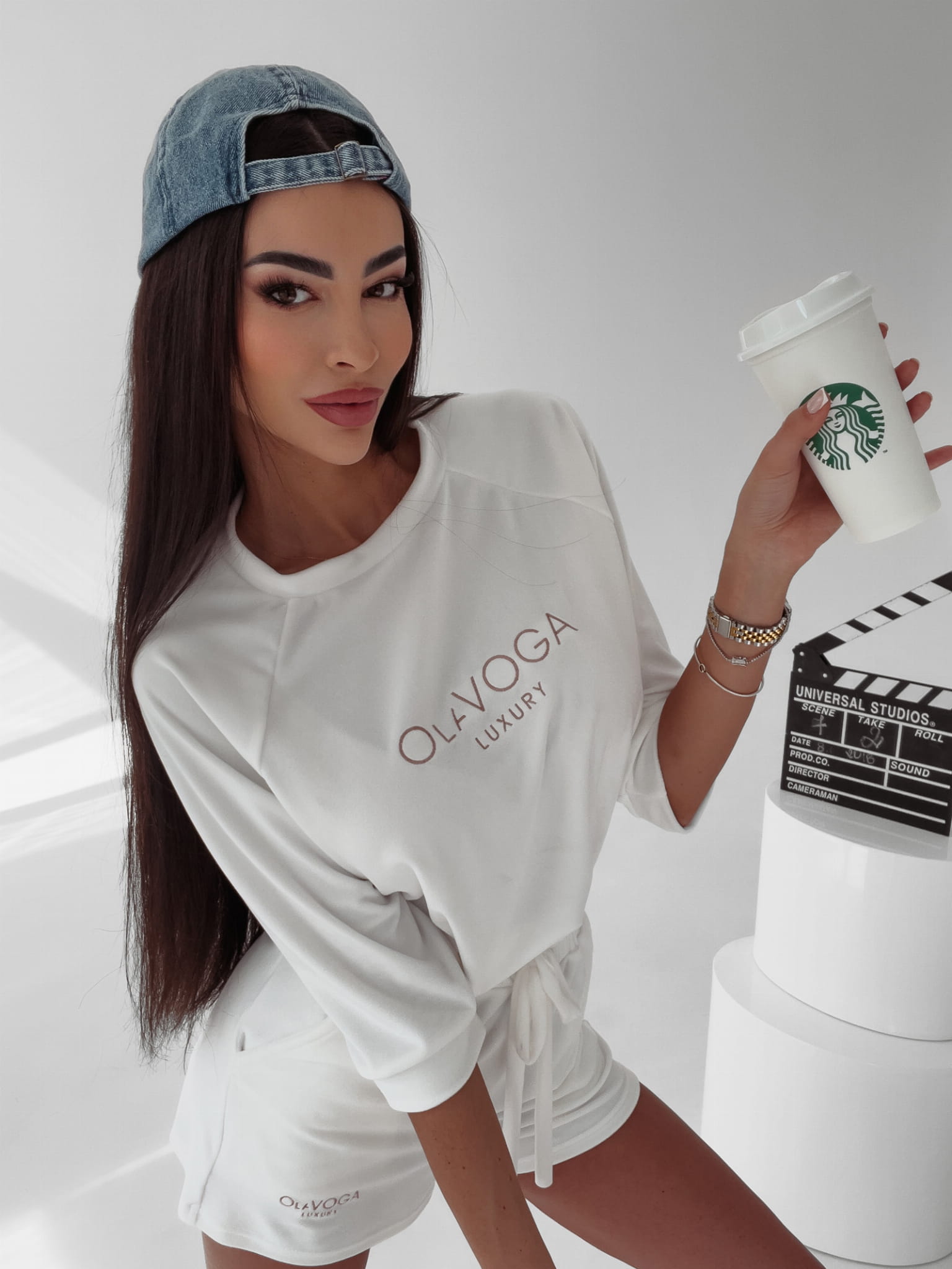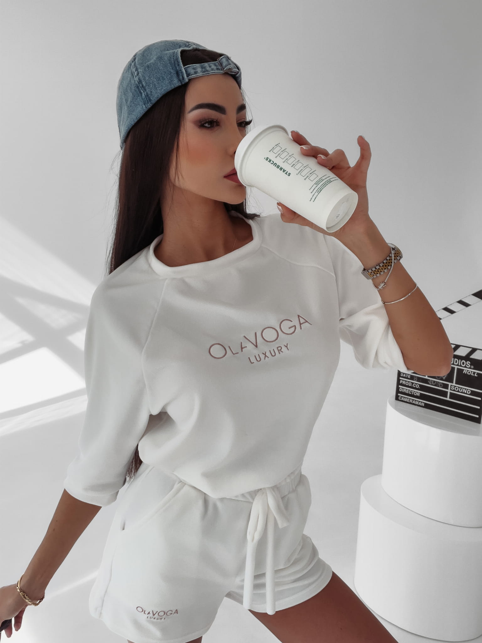 Welurowy komplet składający się z oversizowej góry i luźnych szortów. Na przodzie dwa hafty OLAVOGA LUXURY. Spodenki z kieszeniami i wiązaniem w pasie. Uszyte z przyjemnego w dotyku, dobrze układającego się materiału.