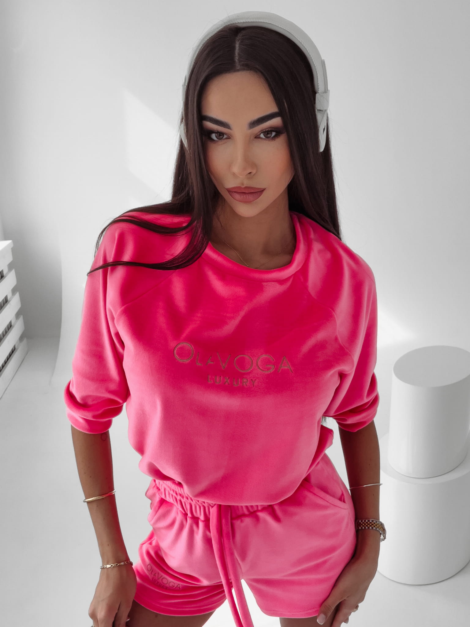 Welurowy komplet składający się z oversizowej góry i luźnych szortów. Na przodzie dwa hafty OLAVOGA LUXURY. Spodenki z kieszeniami i wiązaniem w pasie. Uszyte z przyjemnego w dotyku, dobrze układającego się materiału.