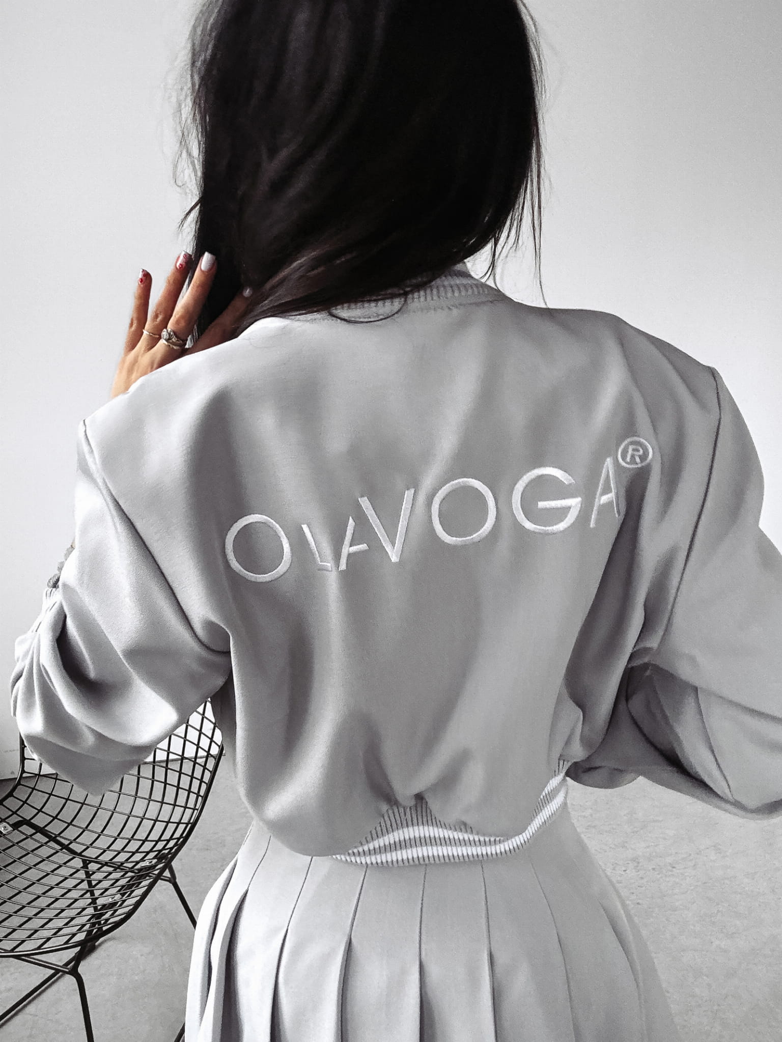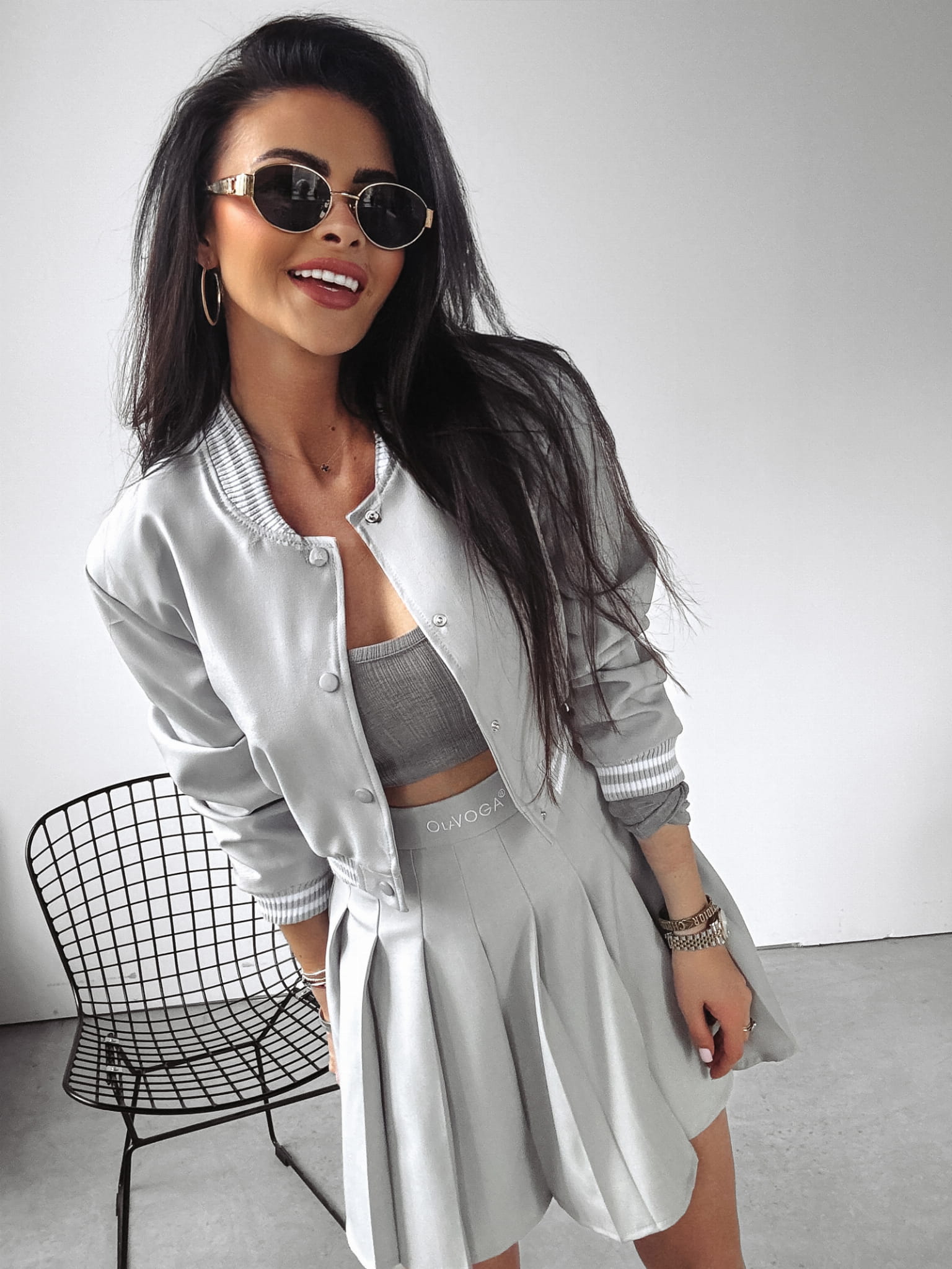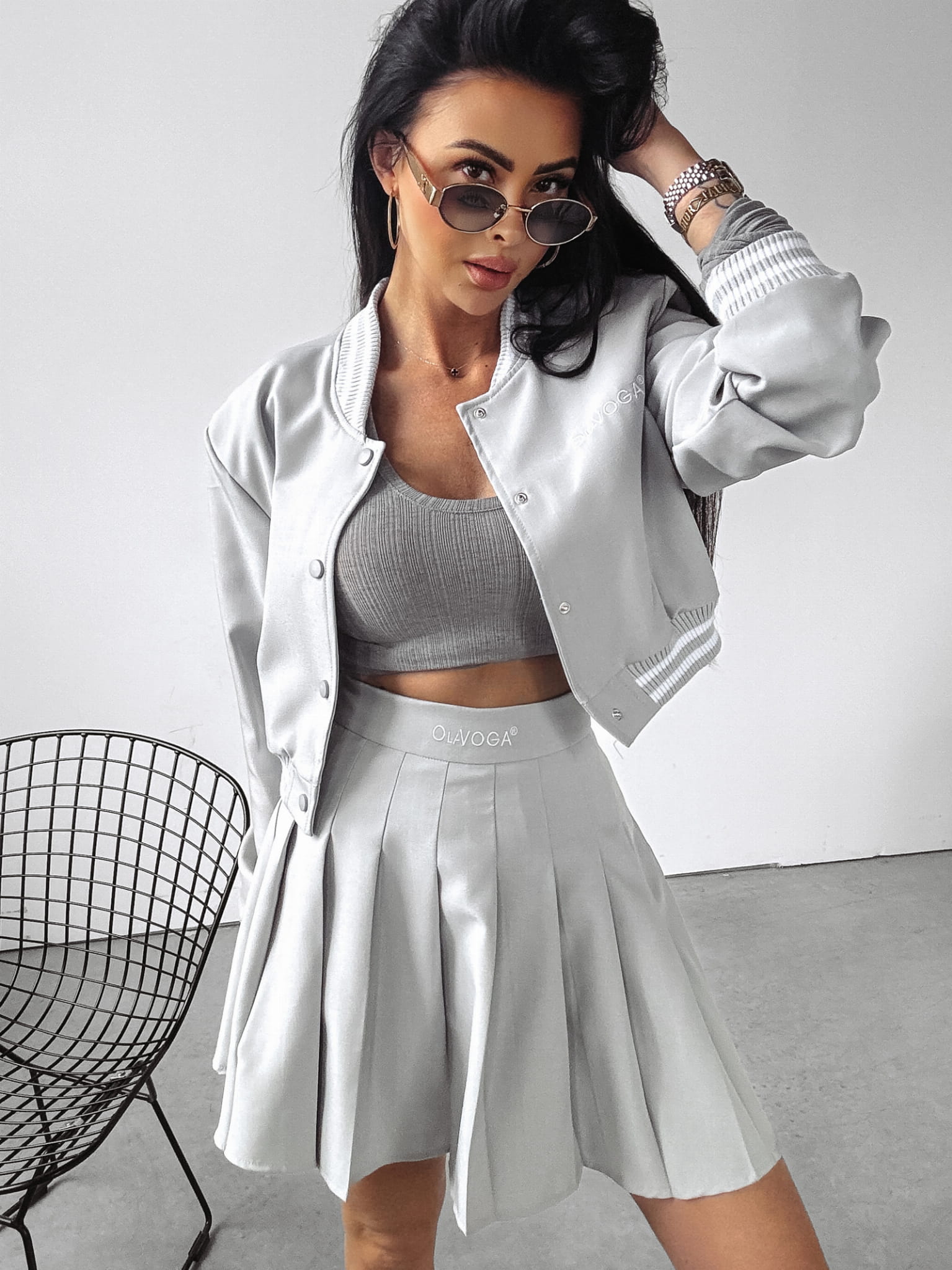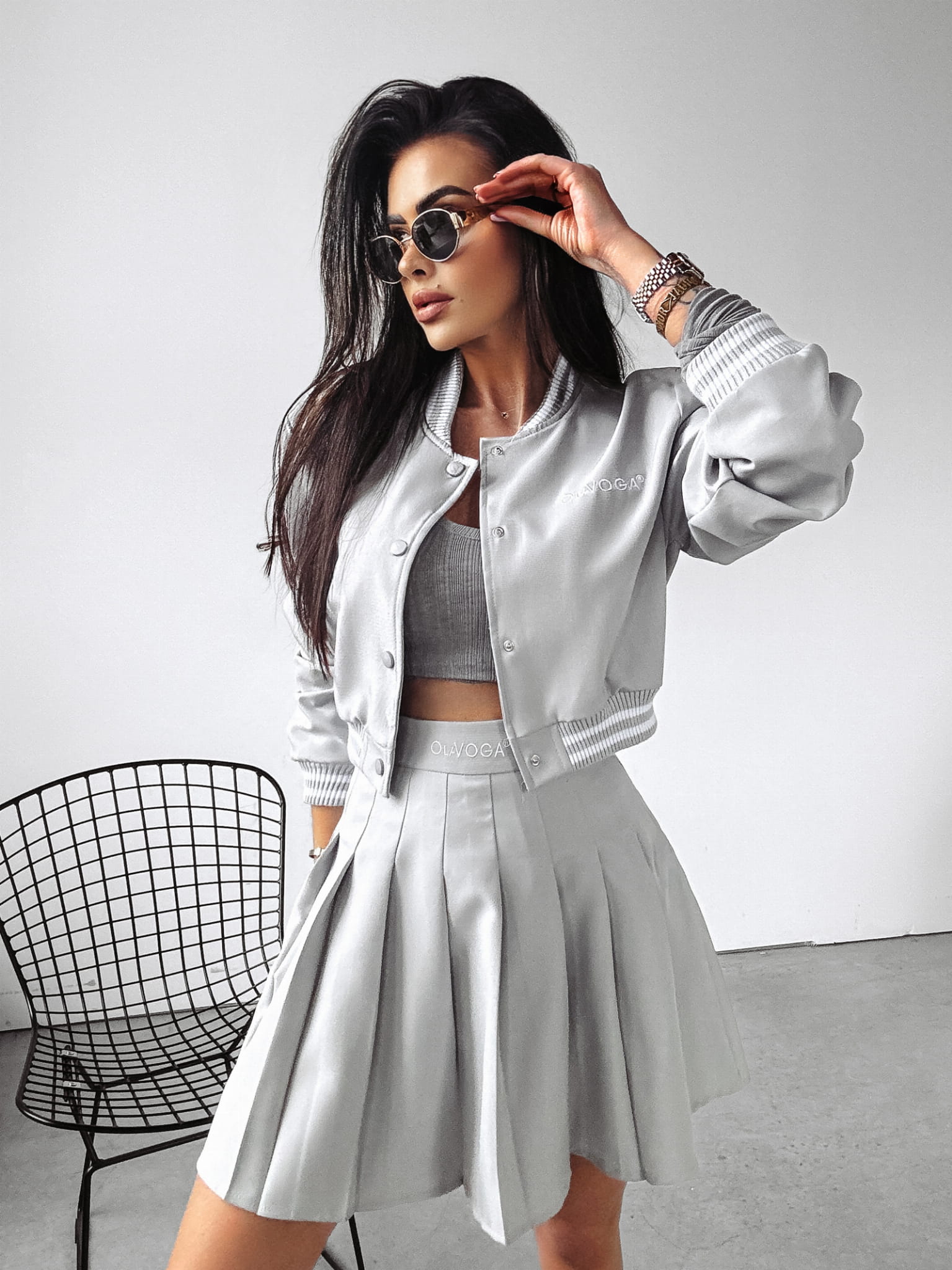 Komplet składający się z bomberki o krótszym kroju, na brzegach ściągacze z lampasem z haftowanym logo marki. Dół zaś to plisowana spódnica z logowaną gumą.