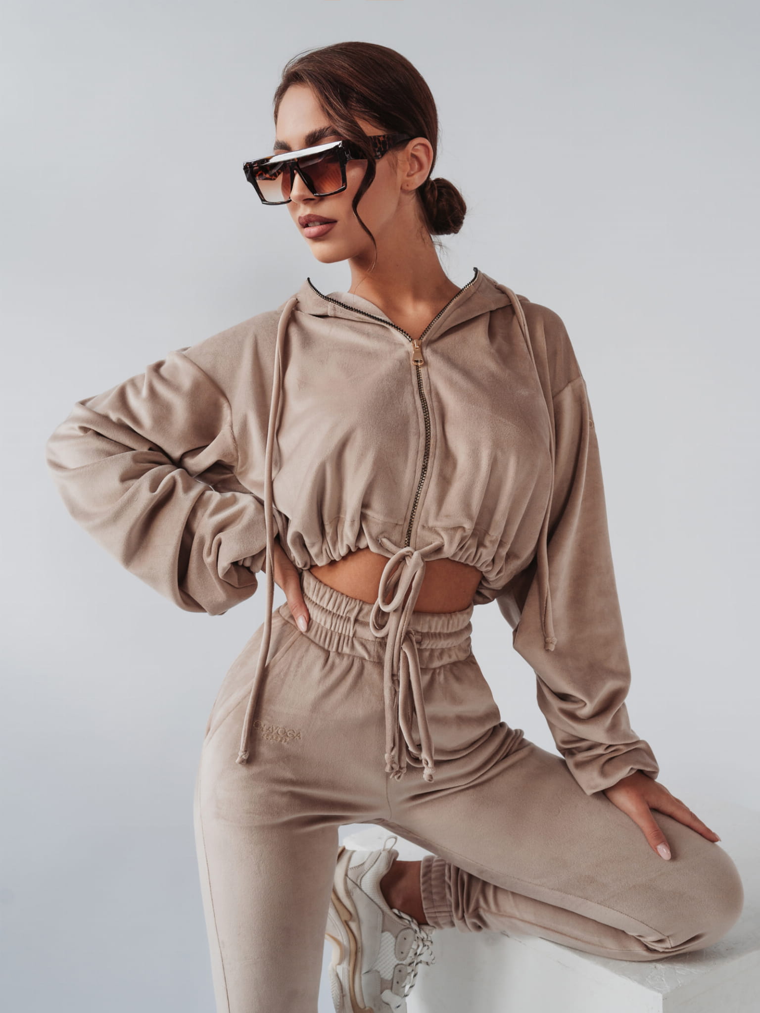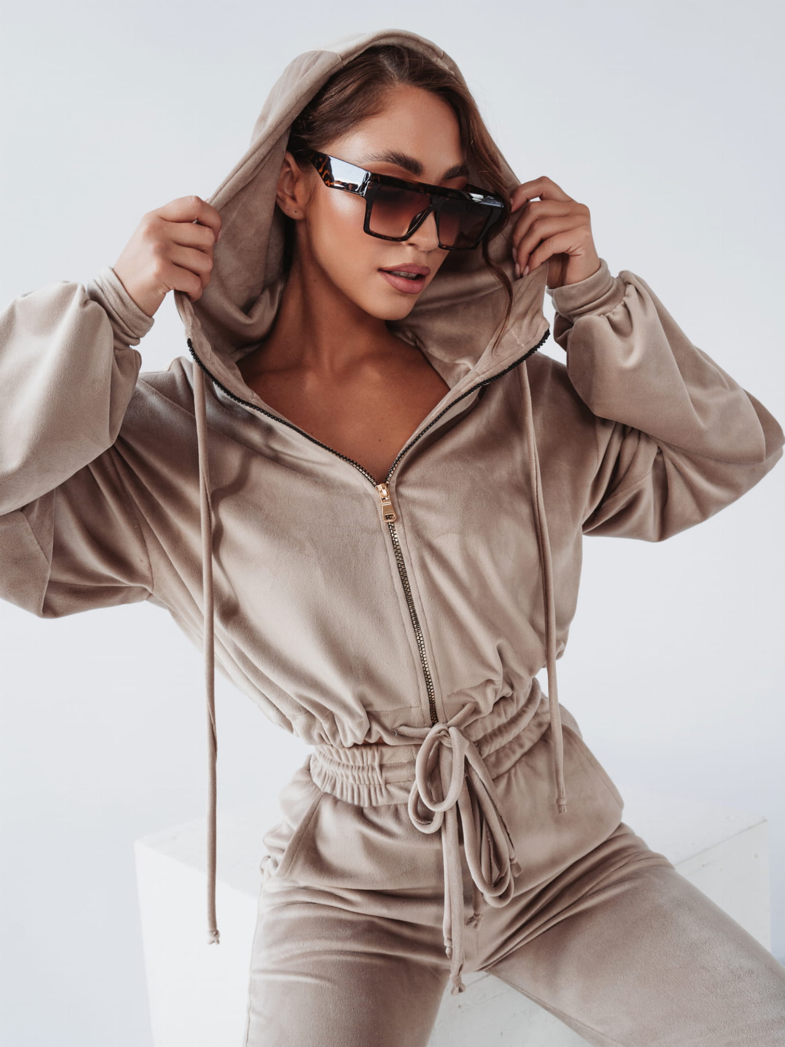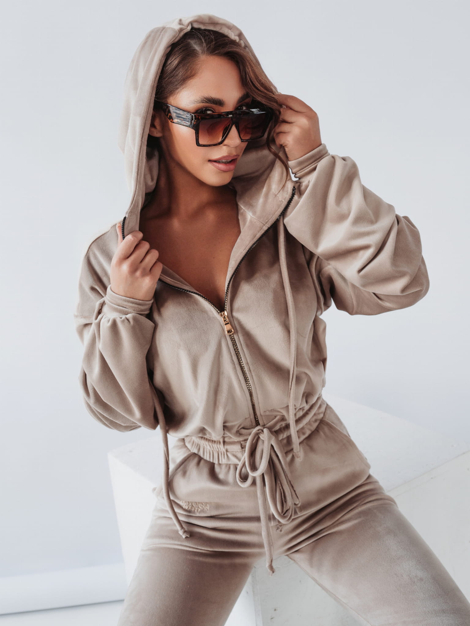 Komplet welurowy, na który składa się rozpinana bluza plus spodnie o kroju slim. Komplet wykonany z niezwykle miłego w dotyku materiału. Bluza o krótkim kroju, z obszernym luźnym kapturem i kieszeniami po bokach. Złote, eleganckie suwaki z logowanym zapięciem.