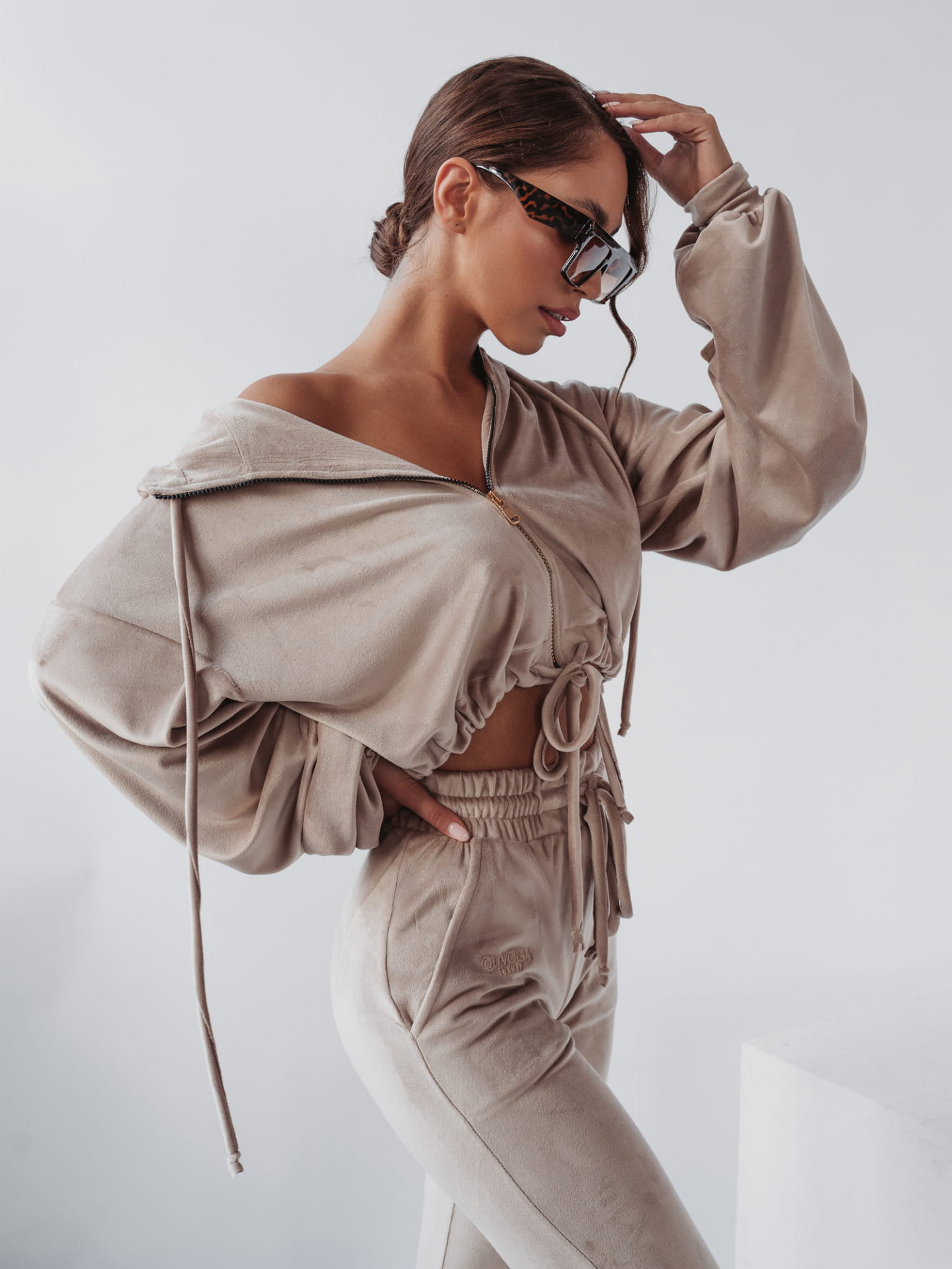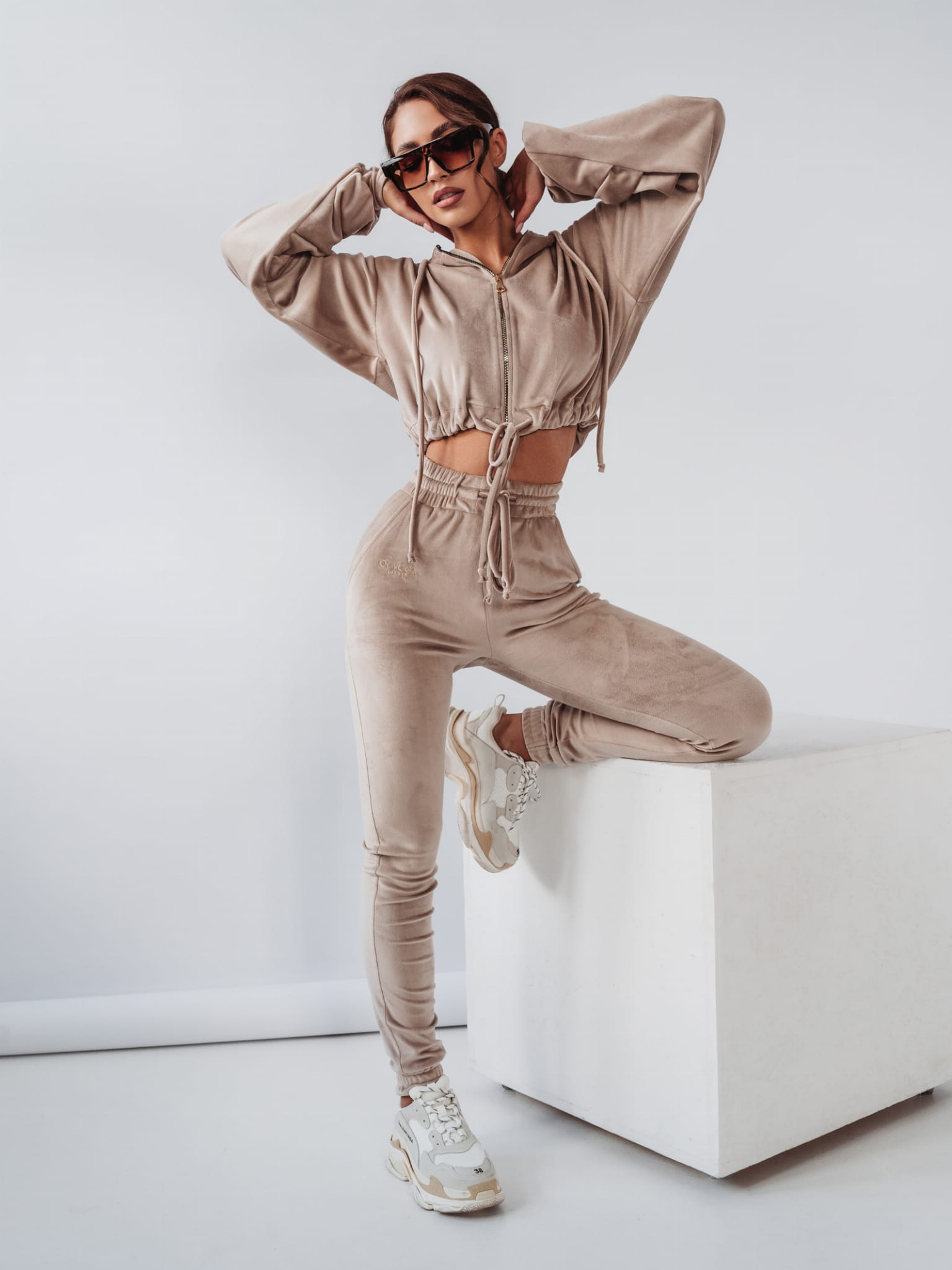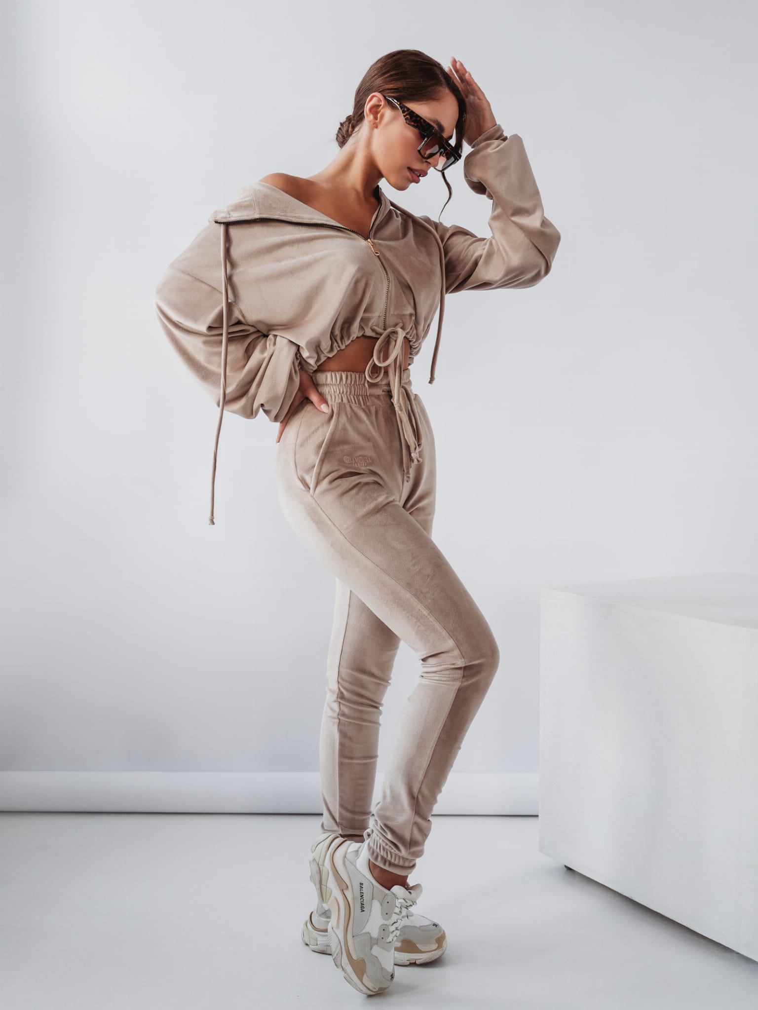Komplet welurowy, na który składa się rozpinana bluza plus spodnie o kroju slim. Komplet wykonany z niezwykle miłego w dotyku materiału. Bluza o krótkim kroju, z obszernym luźnym kapturem i kieszeniami po bokach. Złote, eleganckie suwaki z logowanym zapięciem.