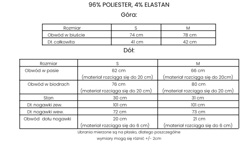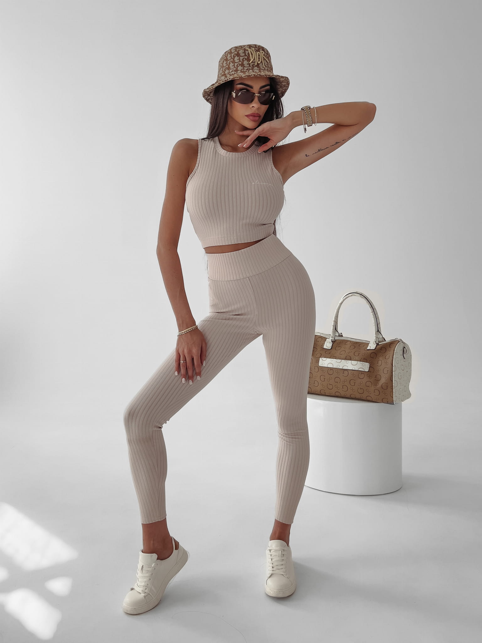 Sportowy, dopasowany komplet uszyty z prążkowanego materiału. Top bez rękawów, długa nogawka legginsów. Na przodzie topu i legginsów delikatny haft. Uniwersalny i ponadczasowy stanowi bazę do wielu sportowych i casualowych stylizacji.