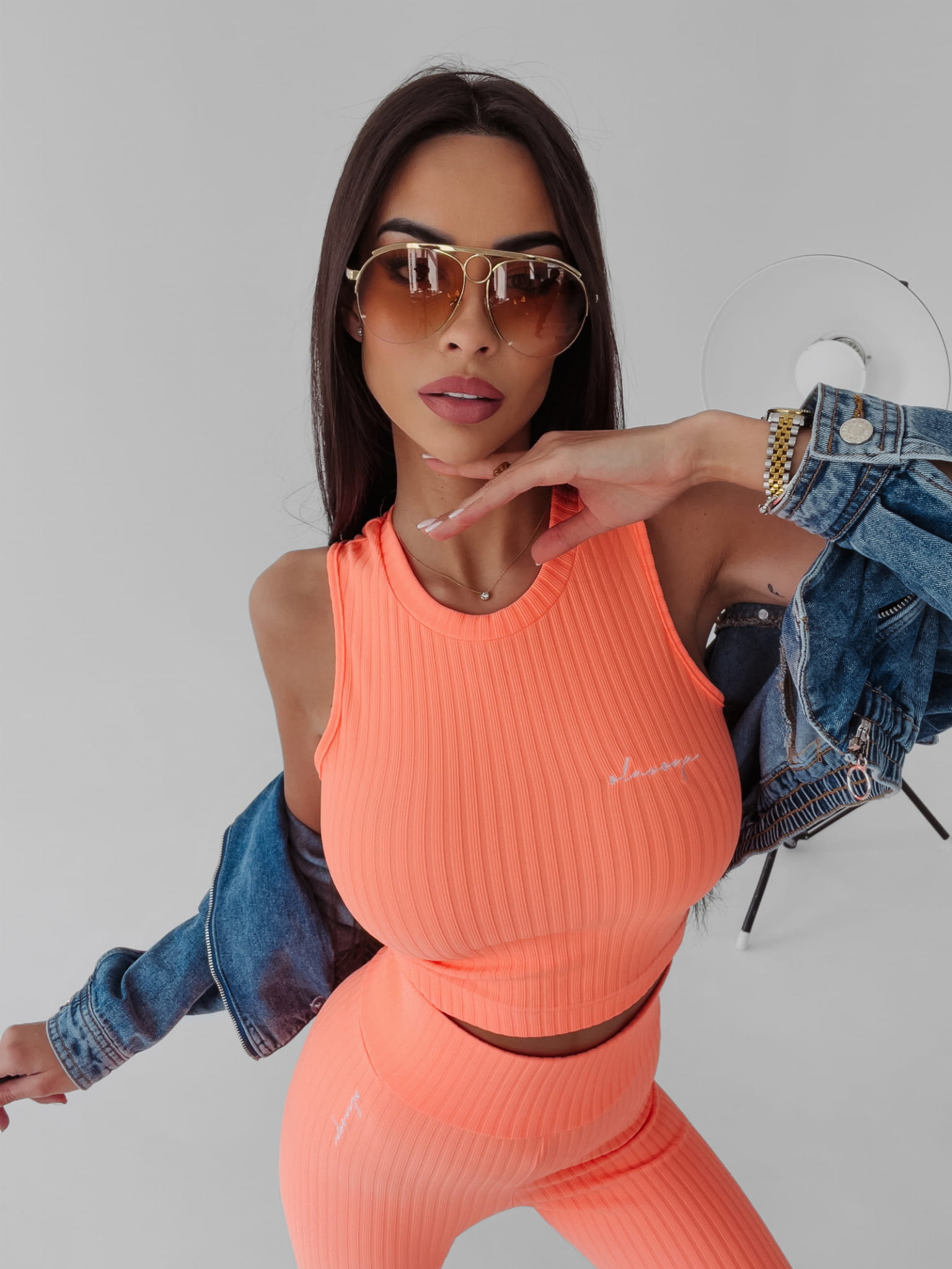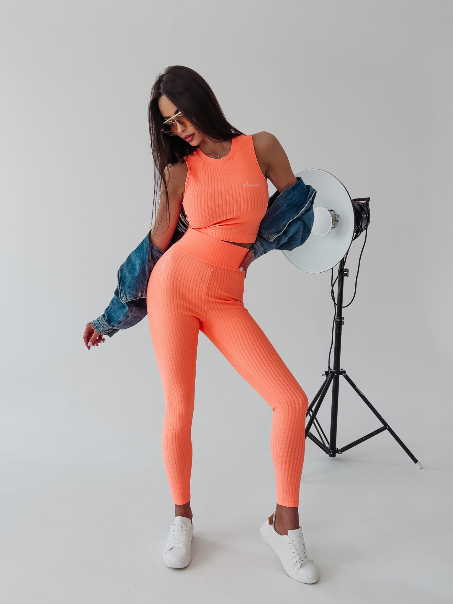 Sportowy, dopasowany komplet uszyty z prążkowanego materiału. Top bez rękawów, długa nogawka legginsów. Na przodzie topu i legginsów delikatny haft. Uniwersalny i ponadczasowy stanowi bazę do wielu sportowych i casualowych stylizacji.