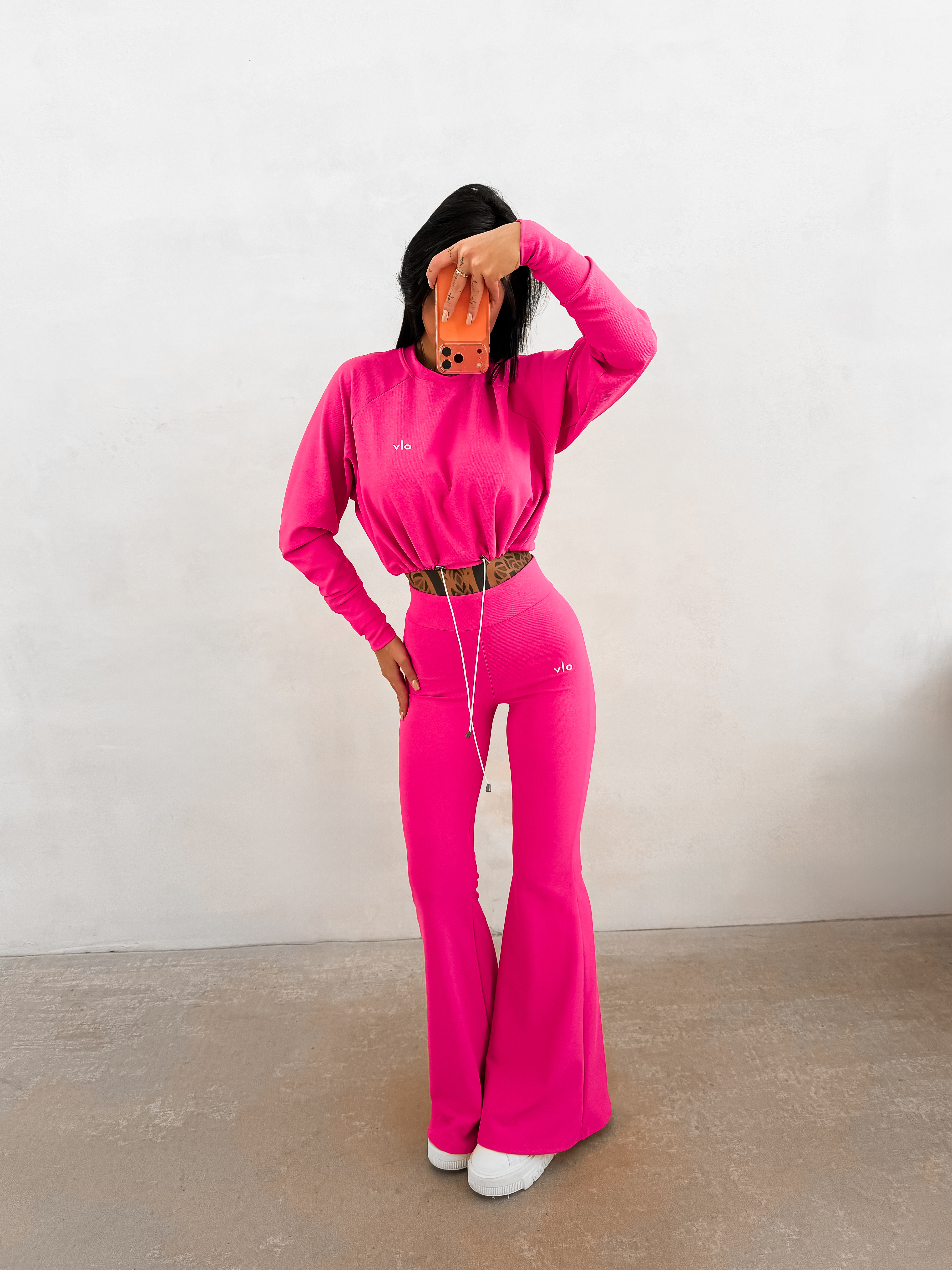Casualowy komplet wykonany z prążkowanego, elastycznego materiału. Góra – krótka bluza o klasycznym kroju. Model z długim rękawem, wykończonym delikatnymi mankietami. Dół bluzy regulowany za pomocą cienkich troczków. Na przodzie minimalistyczne logo OLV. Dół – spodnie z wysokim stanem. Model o dopasowanym kroju. Nogawki rozszerzane ku dołowi. Na nogawce umieszczone subtelne logo OLV, spójne stylistycznie z górą.