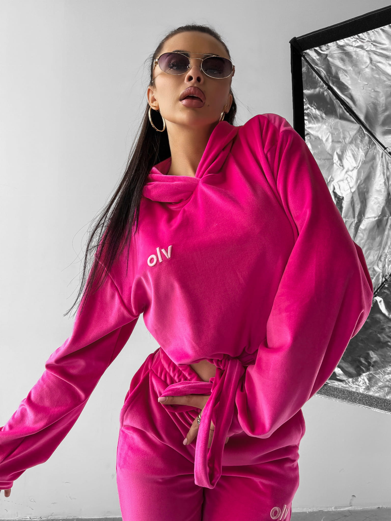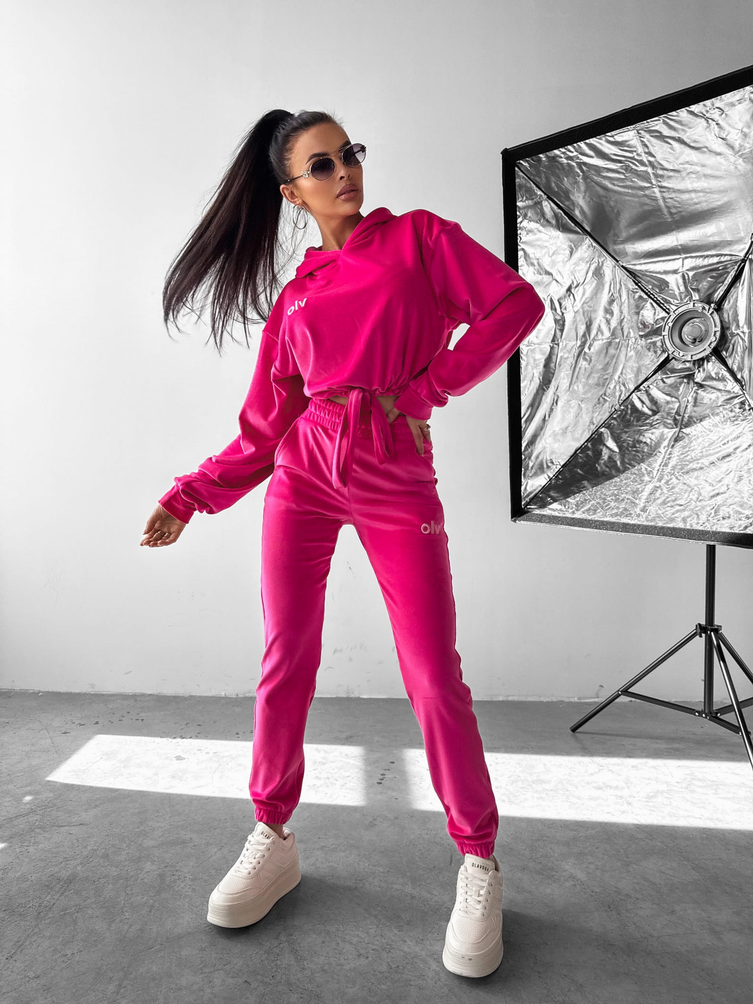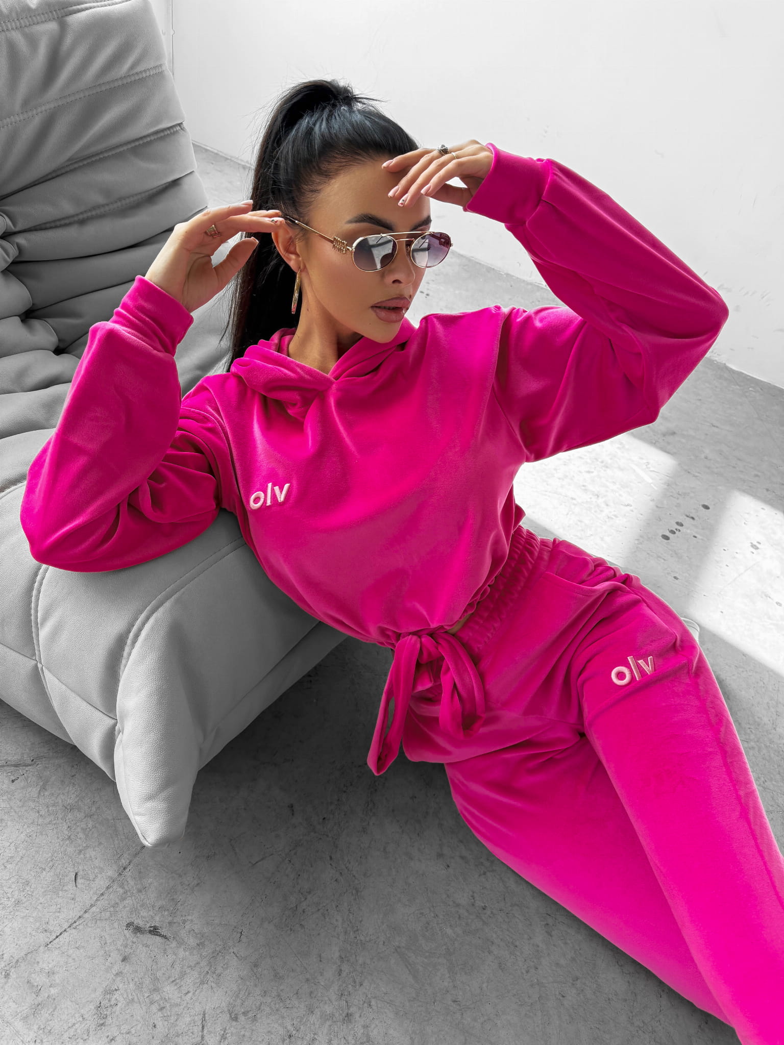 Komplet damski wykonany z miękkiego w dotyku weluru. Góra - casualowa bluza z kapturem. Talia regulowana poprzez sznurek. Na przodzie haft 3D z OLV. Dół - sportowe spodnie ze ściągaczem na brzegach. Po bokach kieszenie. Na przodzie haft 3D z OLV