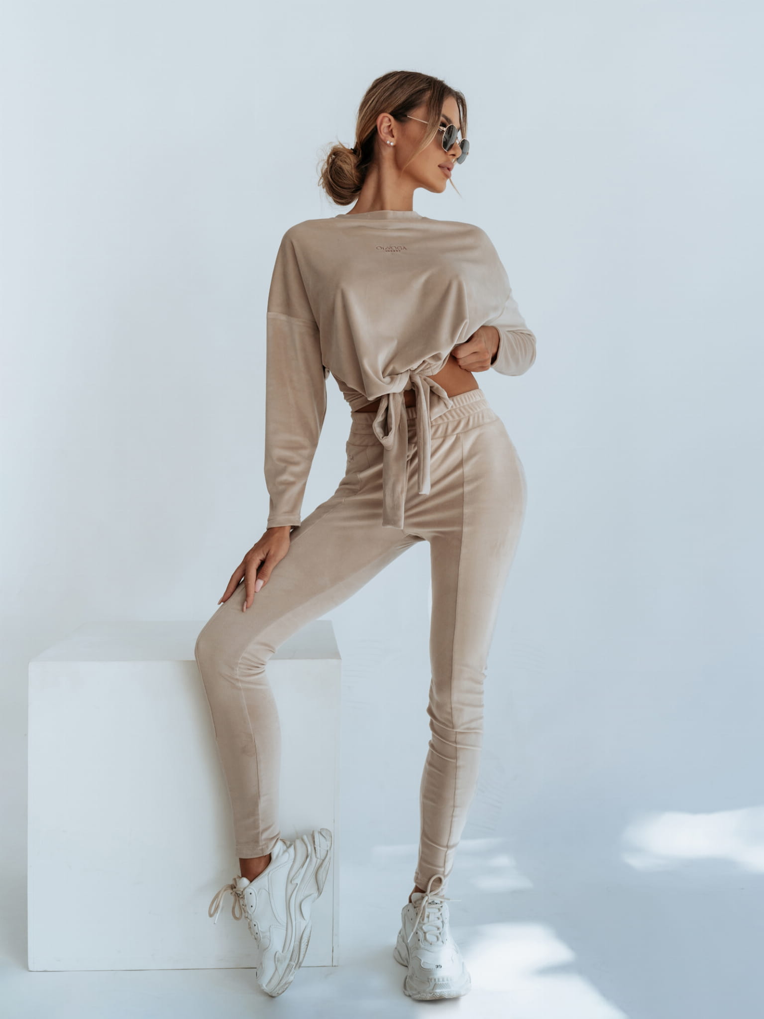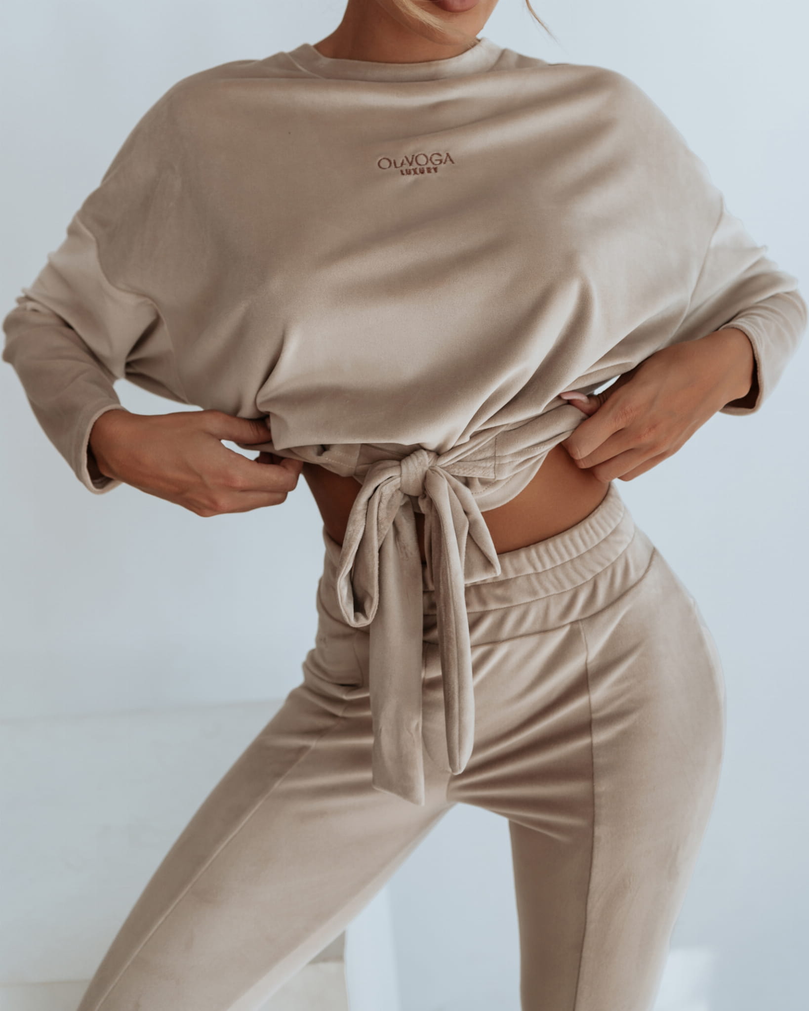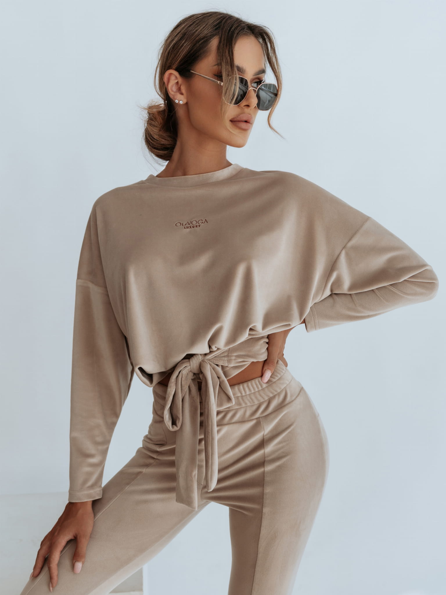 Welurowy komplet z wiązaniem. Na przodzie bluzy haftowane logo marki O`LA Voga. Spodnie z wyższym stanem z haftem na boku.