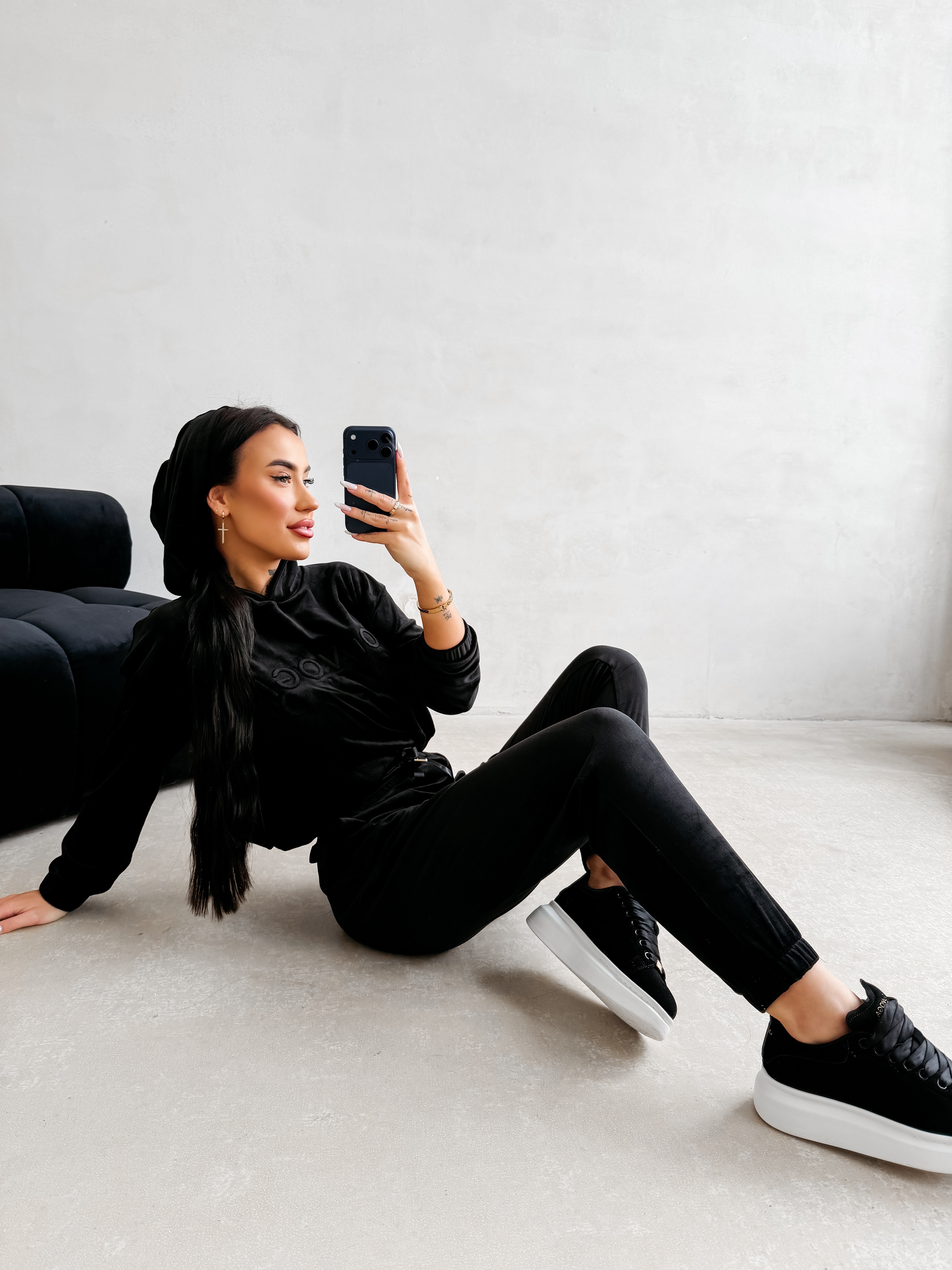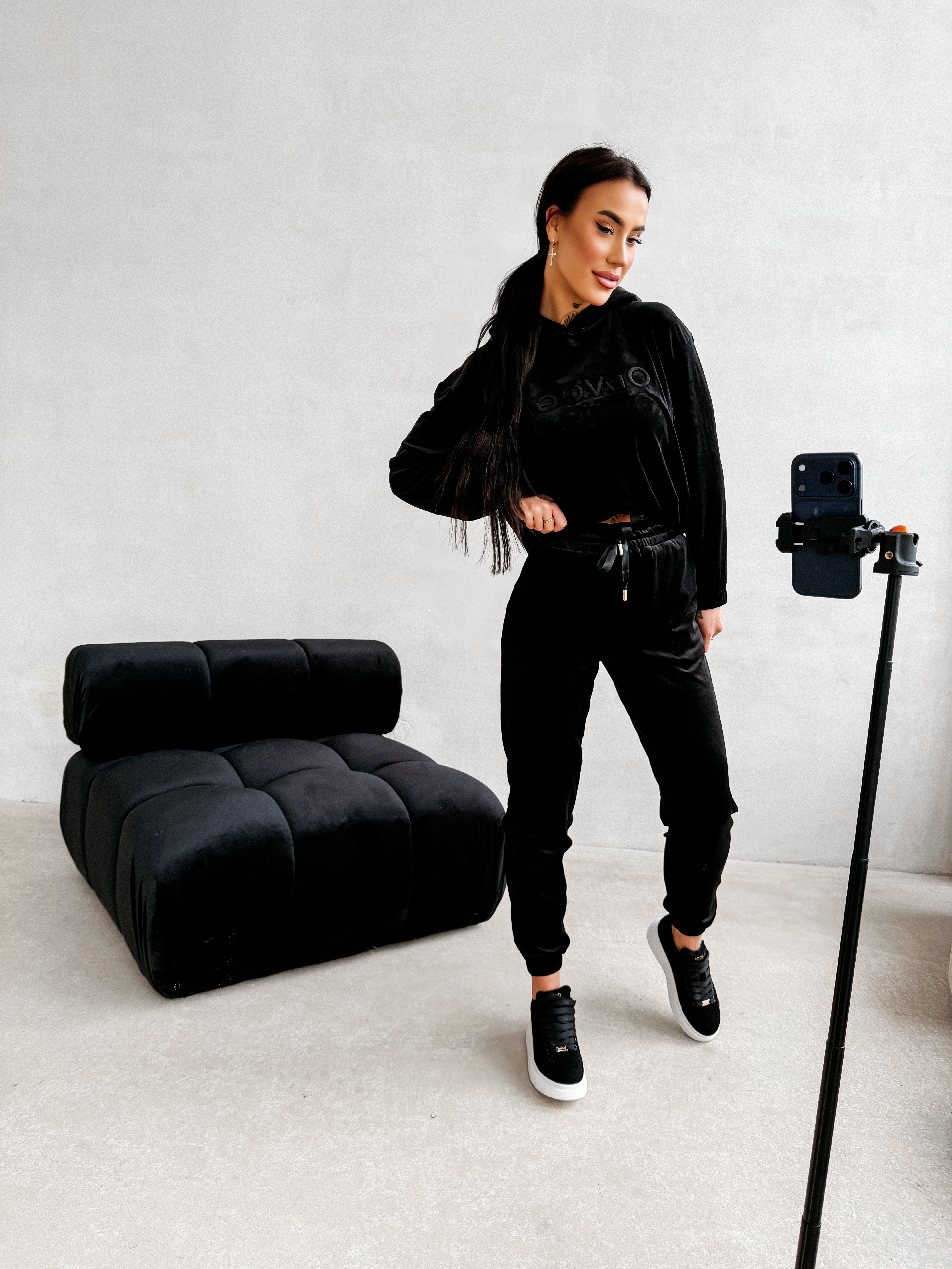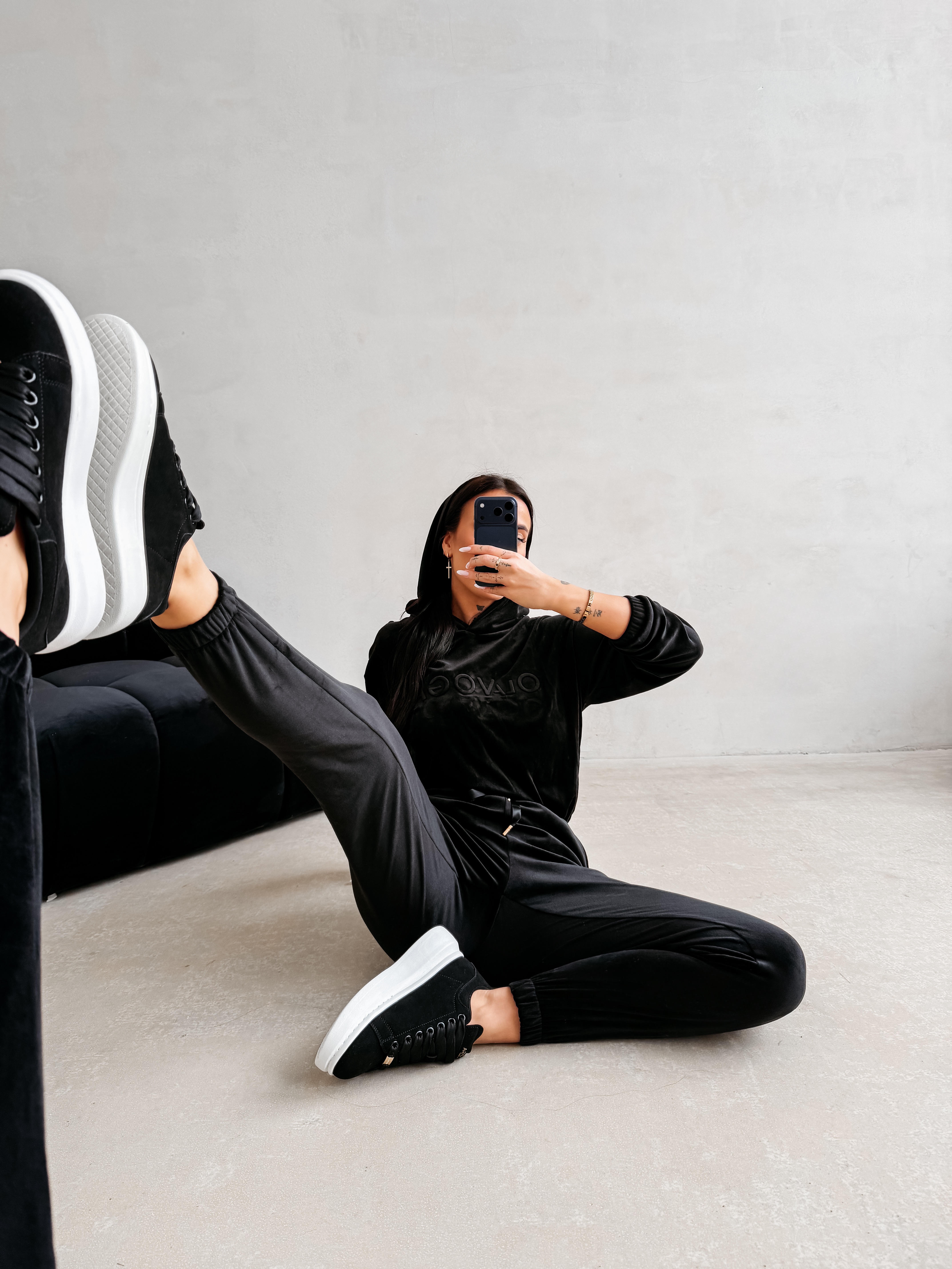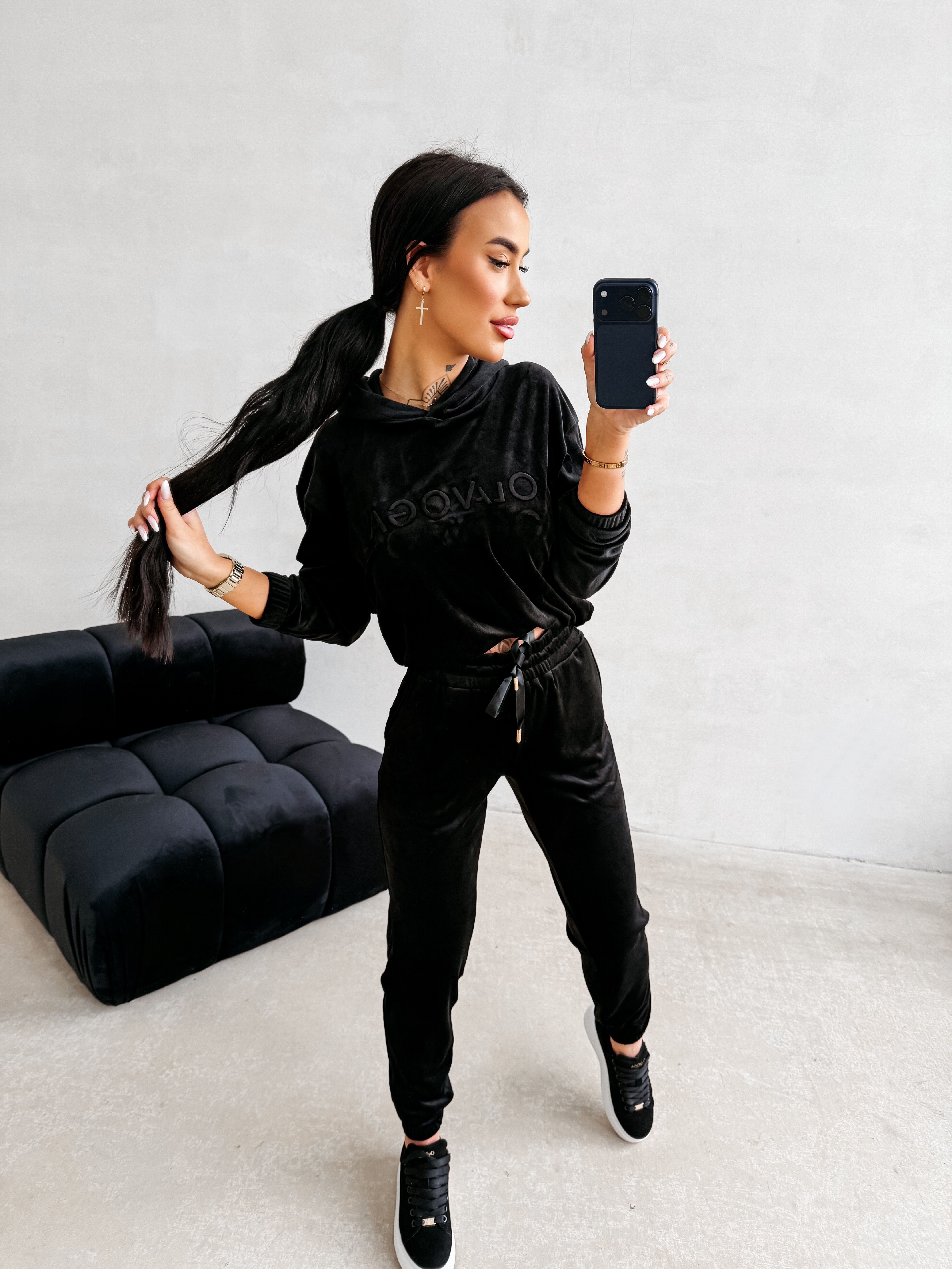 Komplet o swobodnym, luksusowym charakterze wykonany z miękkiego weluru o przyjemnej w dotyku strukturze. Bluza z kapturem i delikatnym tłoczonym logo OLAVOGA, a regulowany dół. Spodnie z elastycznym pasem i ściągaczami przy nogawkach gwarantują wygodę i nowoczesny, casualowy styl. Ważne aspekty: miękki welur, kaptur, tłoczone logo OLAVOGA, regulowany dół bluzy, elastyczny pas, ściągacze przy nogawkach, komfortowy fason, premium casual.