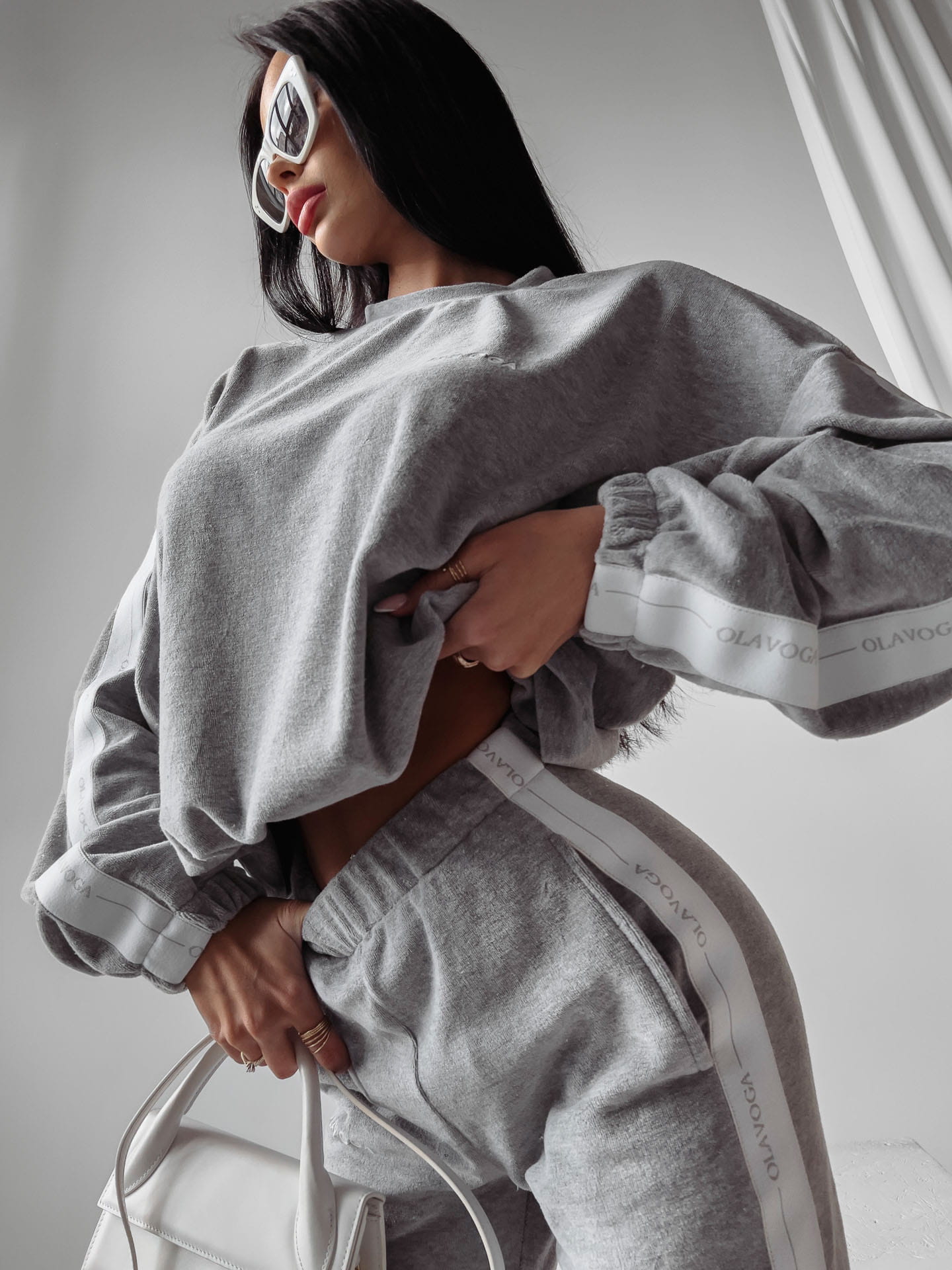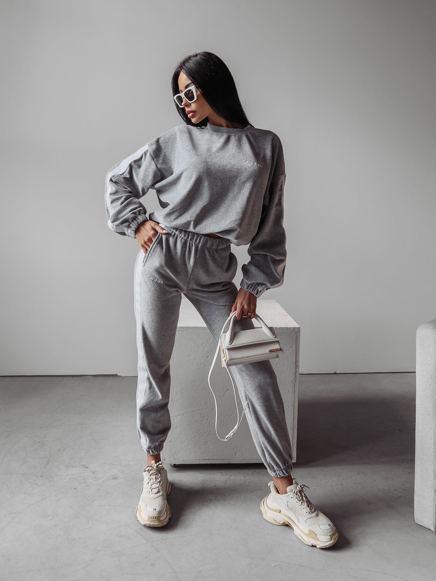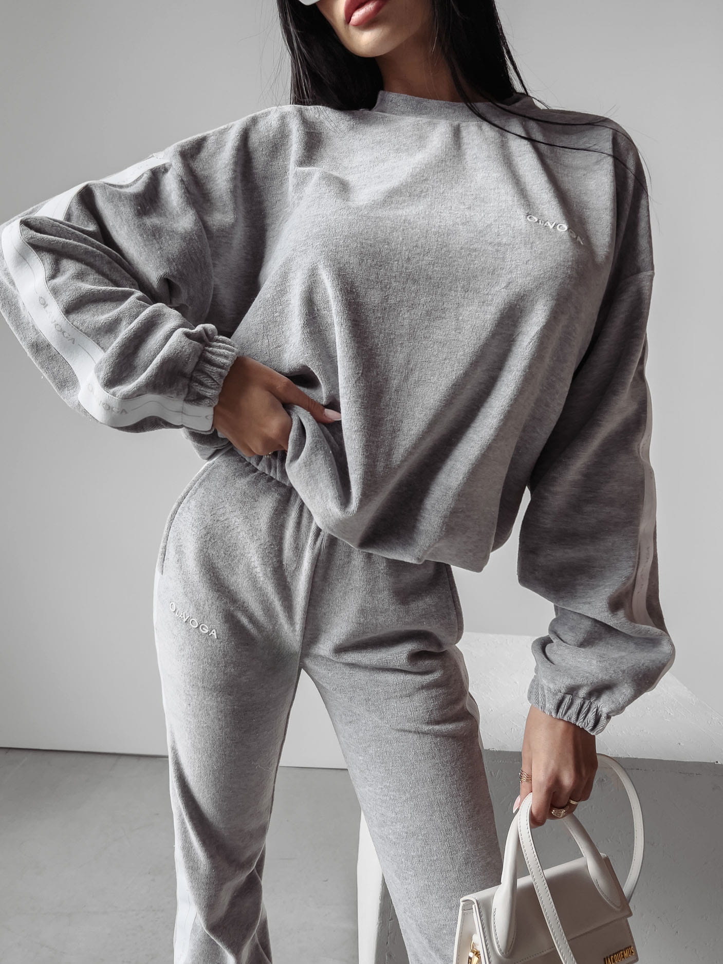Sportowy, welurowy komplet uszyty z miękkiego weluru. Po boku ozdobne białe taśmy z logo brandu. Na przodzie delikatny haft.