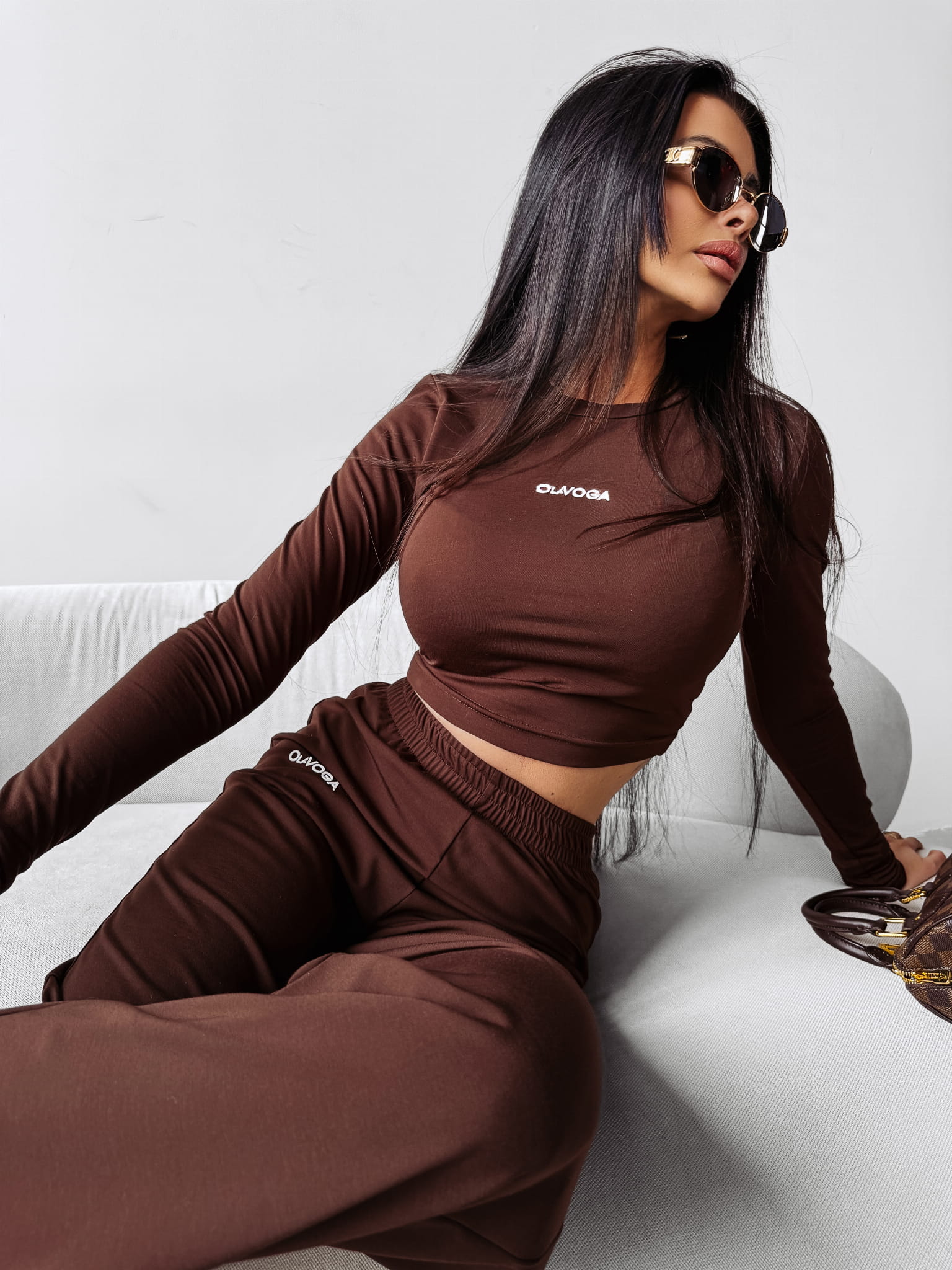 Komplet damski, wykonany z wysokiej jakości elastycznego, przewiewnego materiału. Góra - bluzka z długim rękawem, o delikatnie krótszym kroju. Na przodzie minimalistyczne logo marki OLAVOGA. Dół - spodnie z wysokim stanem. Nogawki rozszerzane ku dołowi. Guma w talii. Na przodzie minimalistyczne logo brandu.