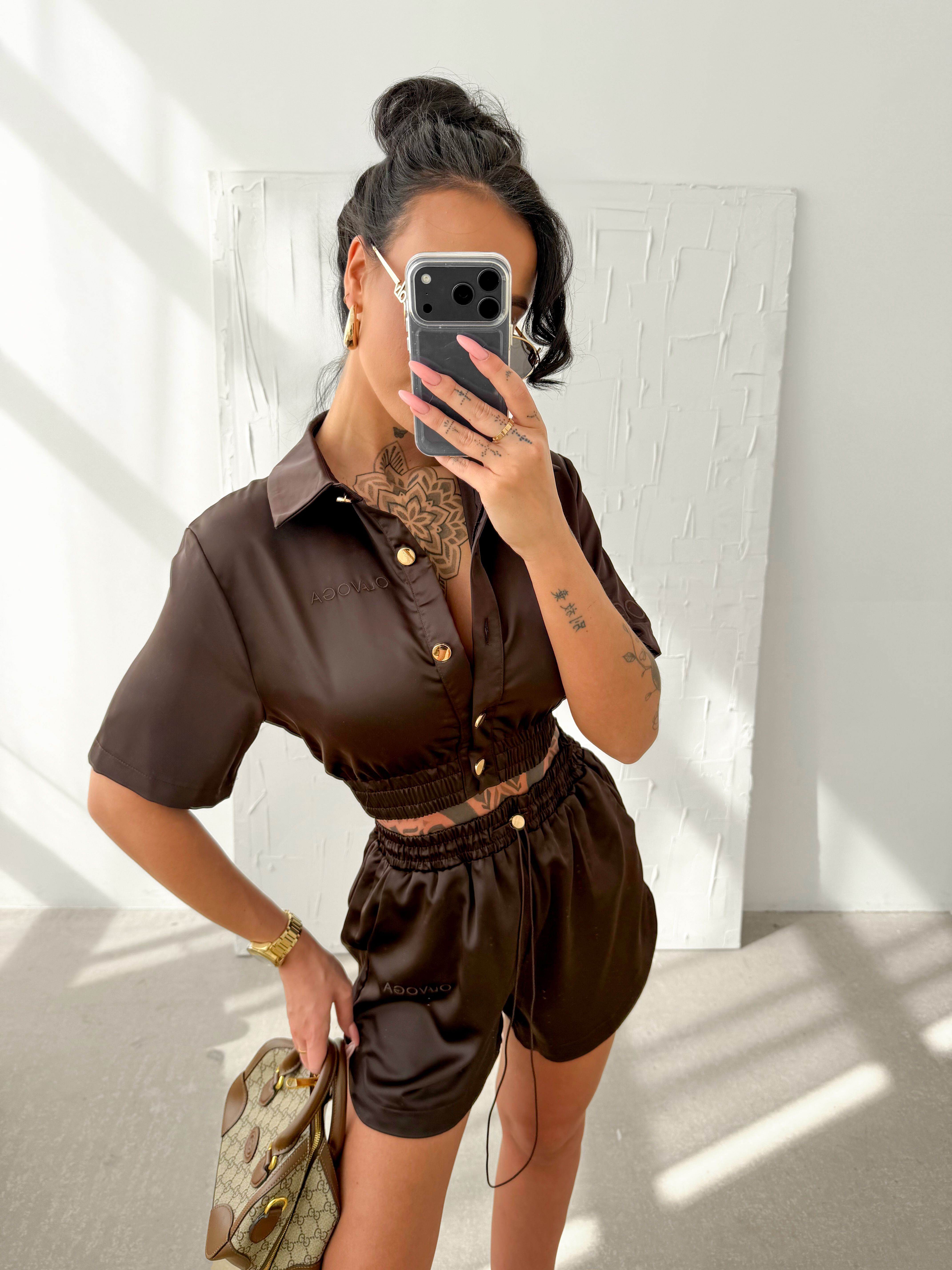 Komplet: koszula + szorty - koszula o skróconym kroju - klasyczny kołnierzyk - zapięcie na metaliczne logowane napy - satynowy połysk - dół koszuli wykończony elastycznym ściągaczem - haftowane logo brandu w dopasowanym kolorze - szorty o luźniejszym kroju - elastyczna talia z wiązaniem regulowanym na stoper - haftowane logo z kolorze tkaniny