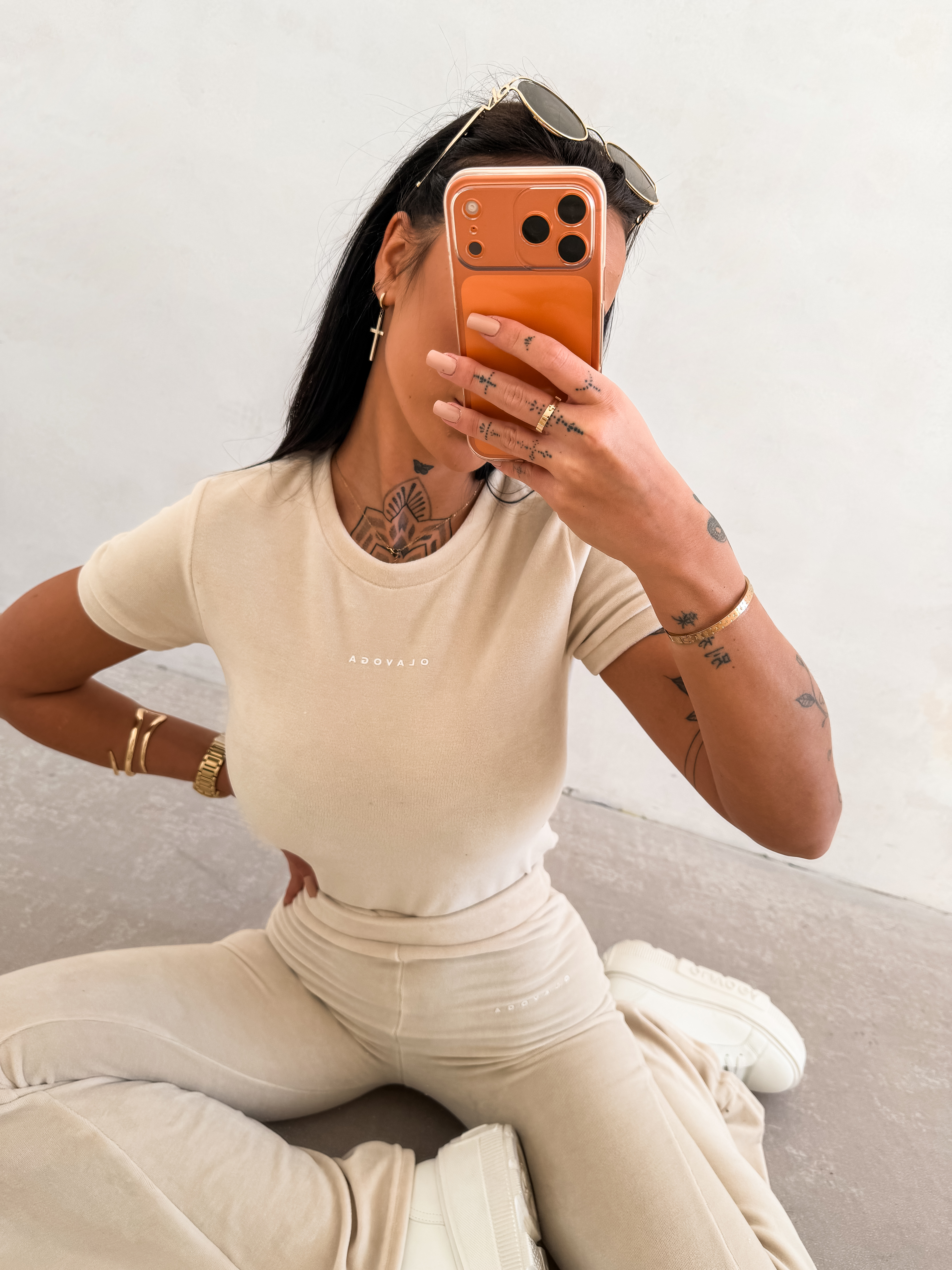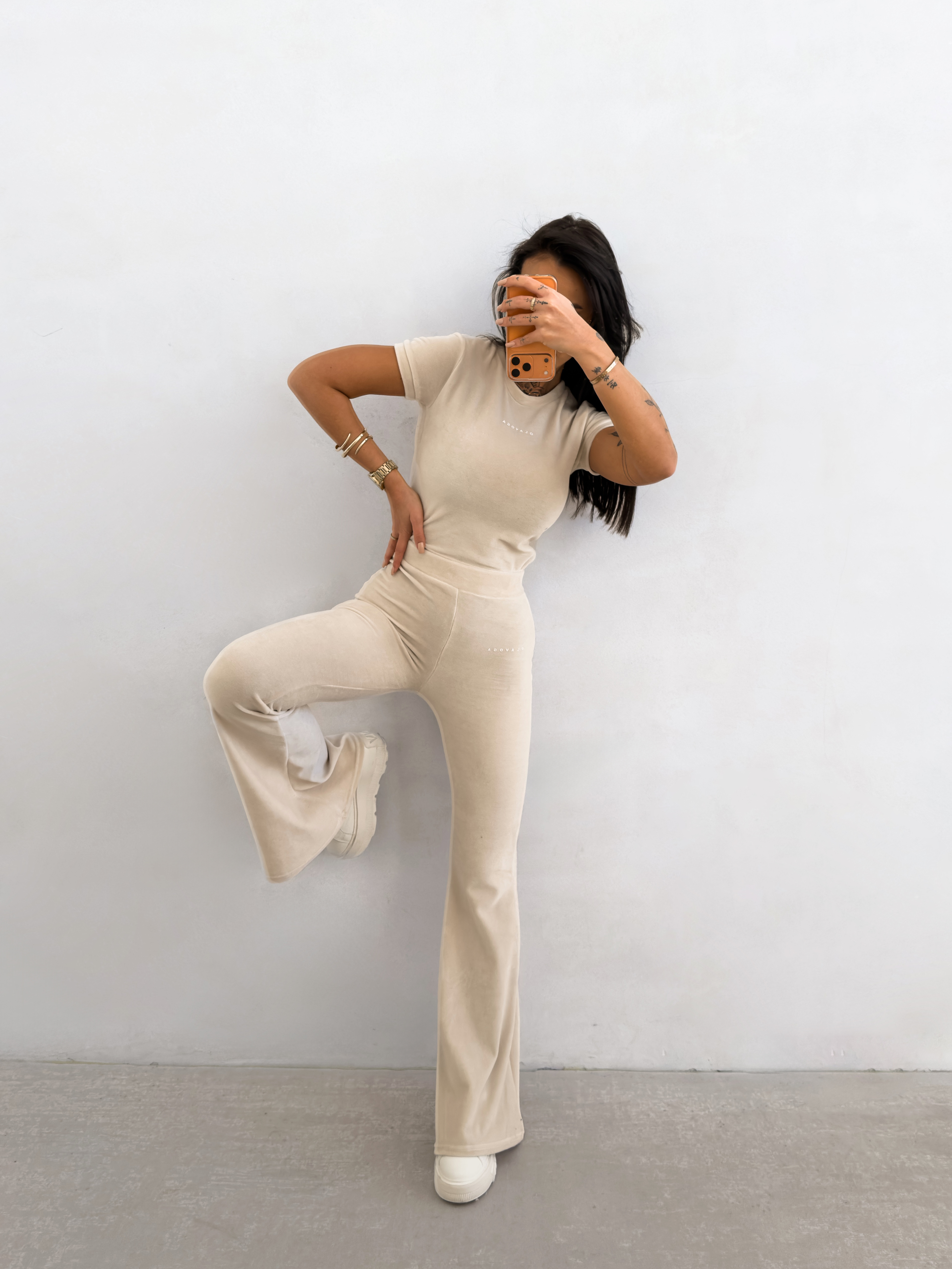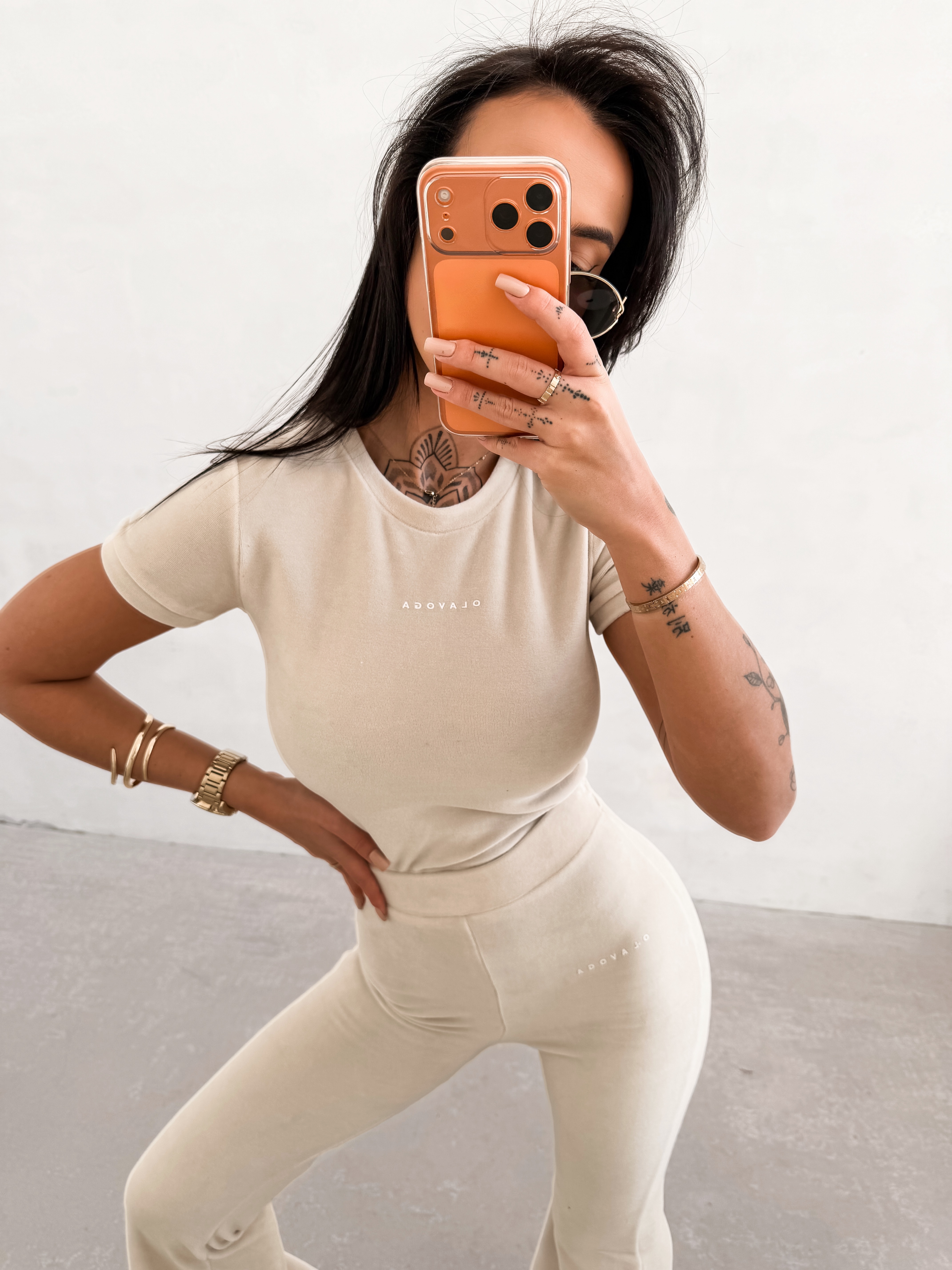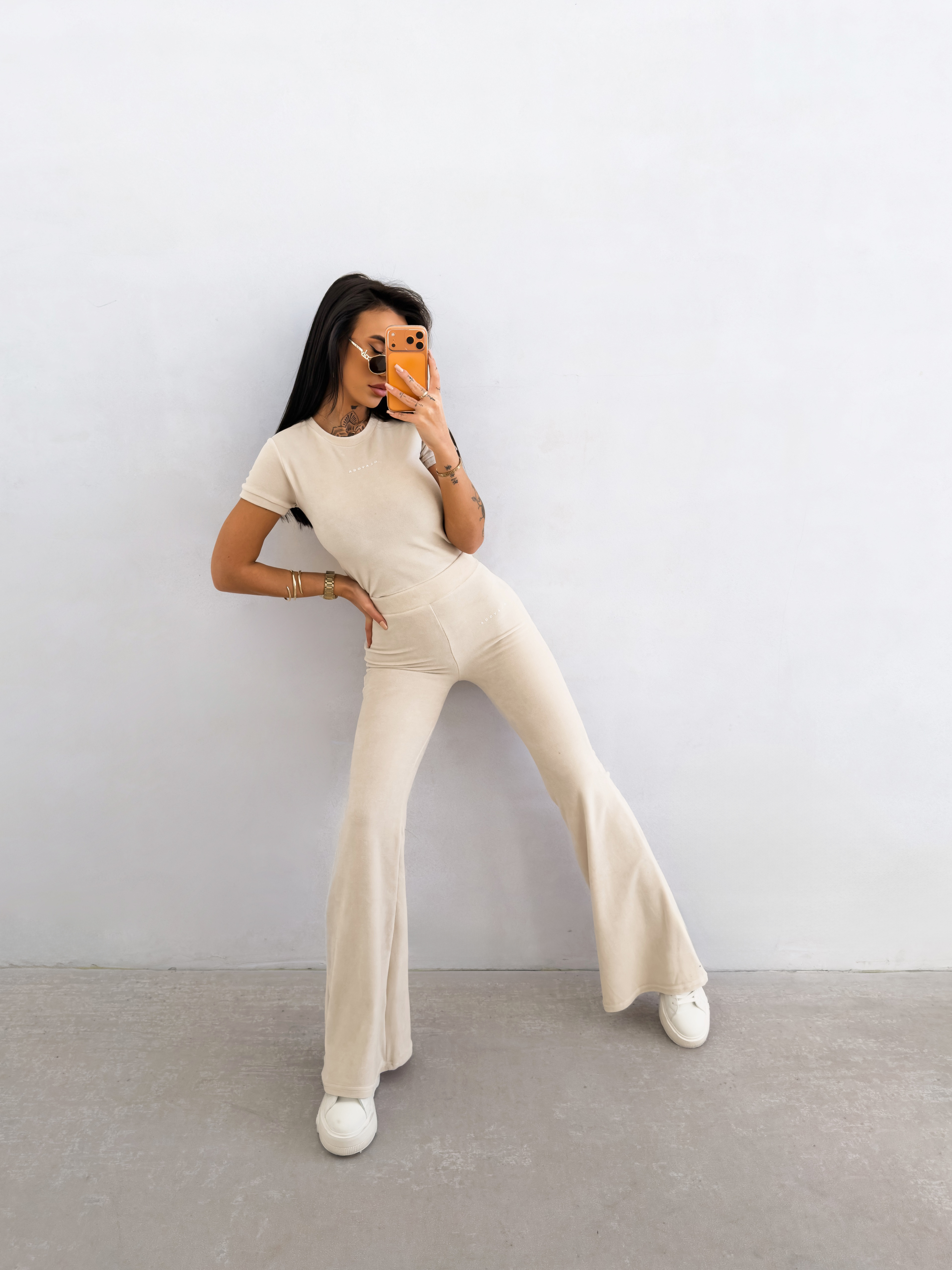 Casualowy komplet wykonany z miękkiego oraz przyjemnego w dotyku weluru. Góra – dopasowana koszulka o klasycznym kroju. Model z krótkim rękawem i okrągłym dekoltem. Na przodzie delikatne, minimalistyczne logo marki OLAVOGA. Dół – spodnie z wysokim stanem. Model o dopasowanym kroju w górnej części i lekko rozszerzanych nogawkach typu flare. Na nogawce umieszczone subtelne logo brandu.