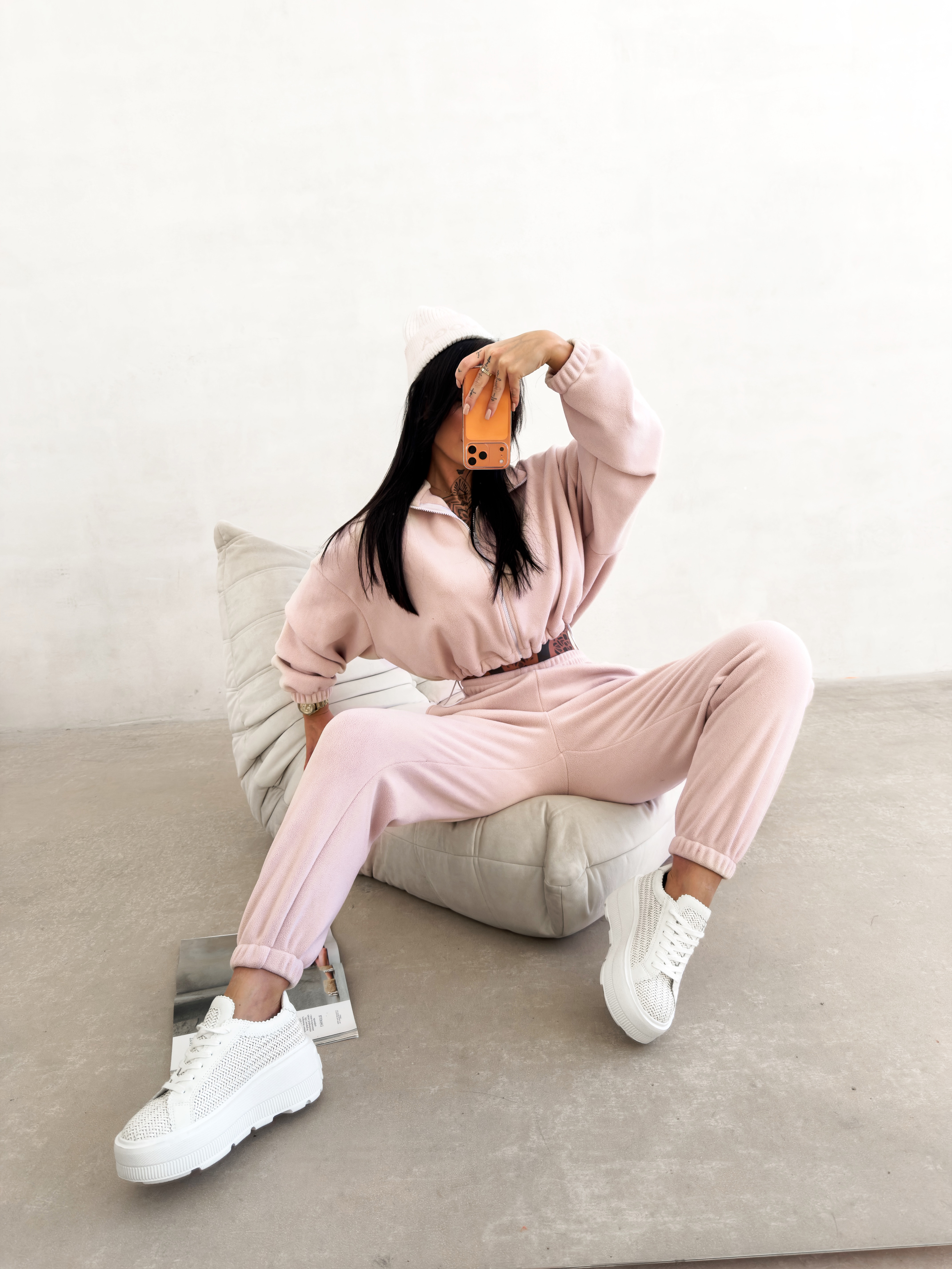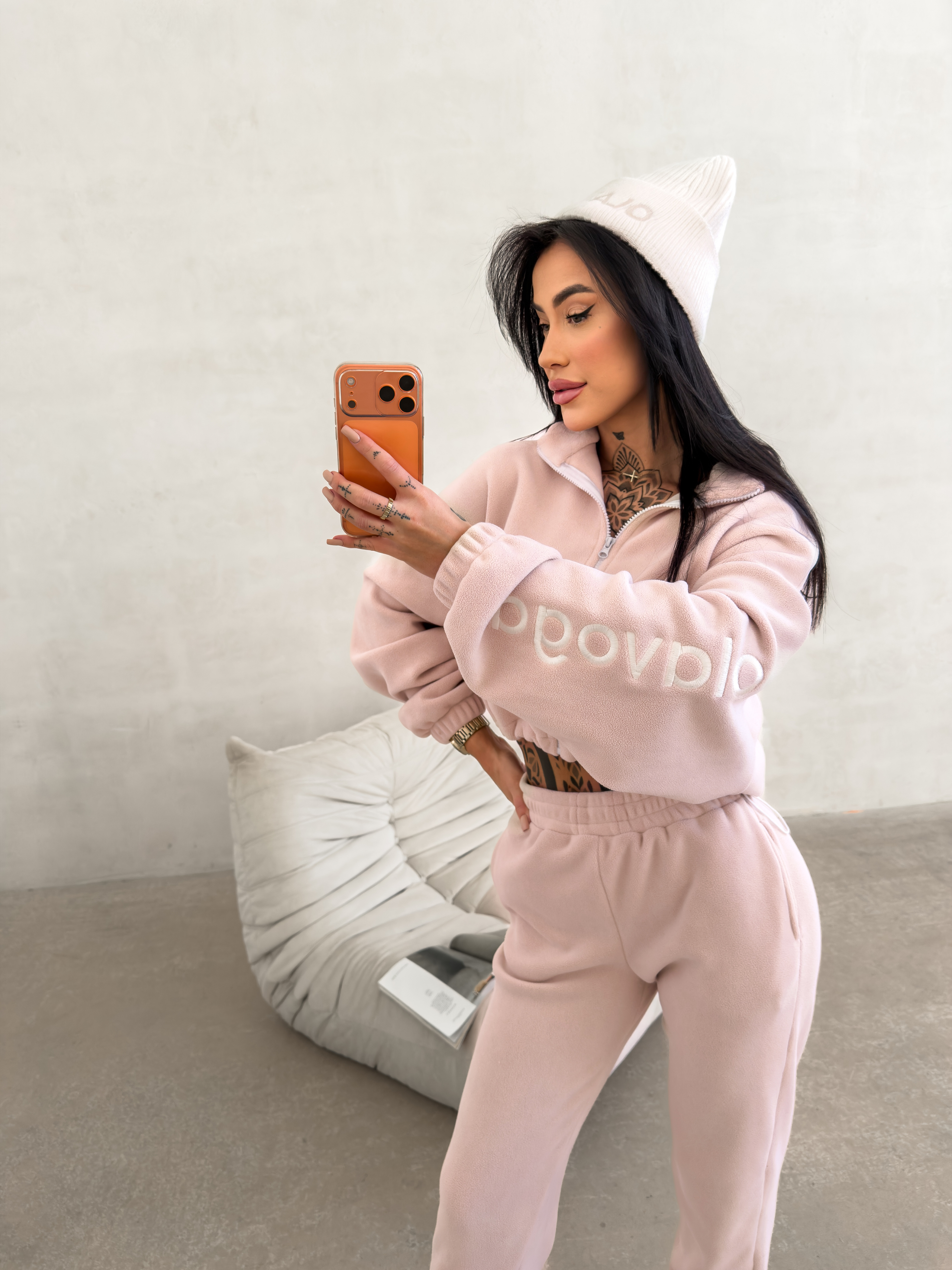 Casualowy komplet wykonany z miękkiej, przyjemnej w dotyku dzianiny polarowej o subtelnej, jednolitej strukturze. Góra - krótka bluza zapinana na suwak, o luźnym, lekko oversize’owym kroju. Model z długim rękawem, zakończonym elastycznym ściągaczem. Na rękawie umieszczone wyraziste, haftowane logo marki OLAVOGA. Dół - spodnie z wysokim stanem i elastyczną talią. Nogawki o prostym kroju, zwężane ku dołowi i wykończone ściągaczem.