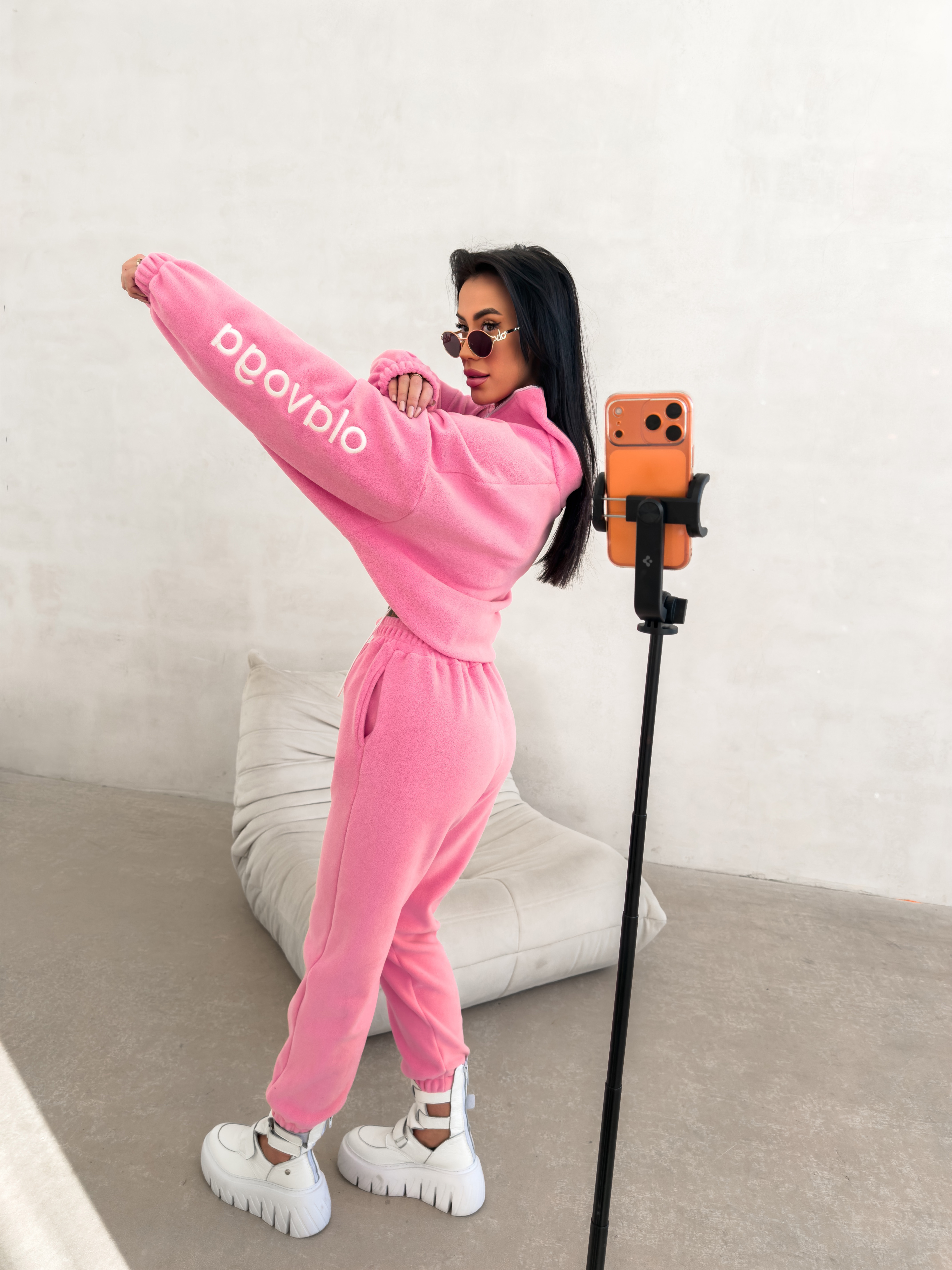 Casualowy komplet wykonany z miękkiej, przyjemnej w dotyku dzianiny polarowej o subtelnej, jednolitej strukturze. Góra - krótka bluza zapinana na suwak, o luźnym, lekko oversize’owym kroju. Model z długim rękawem, zakończonym elastycznym ściągaczem. Na rękawie umieszczone wyraziste, haftowane logo marki OLAVOGA. Dół - spodnie z wysokim stanem i elastyczną talią. Nogawki o prostym kroju, zwężane ku dołowi i wykończone ściągaczem.