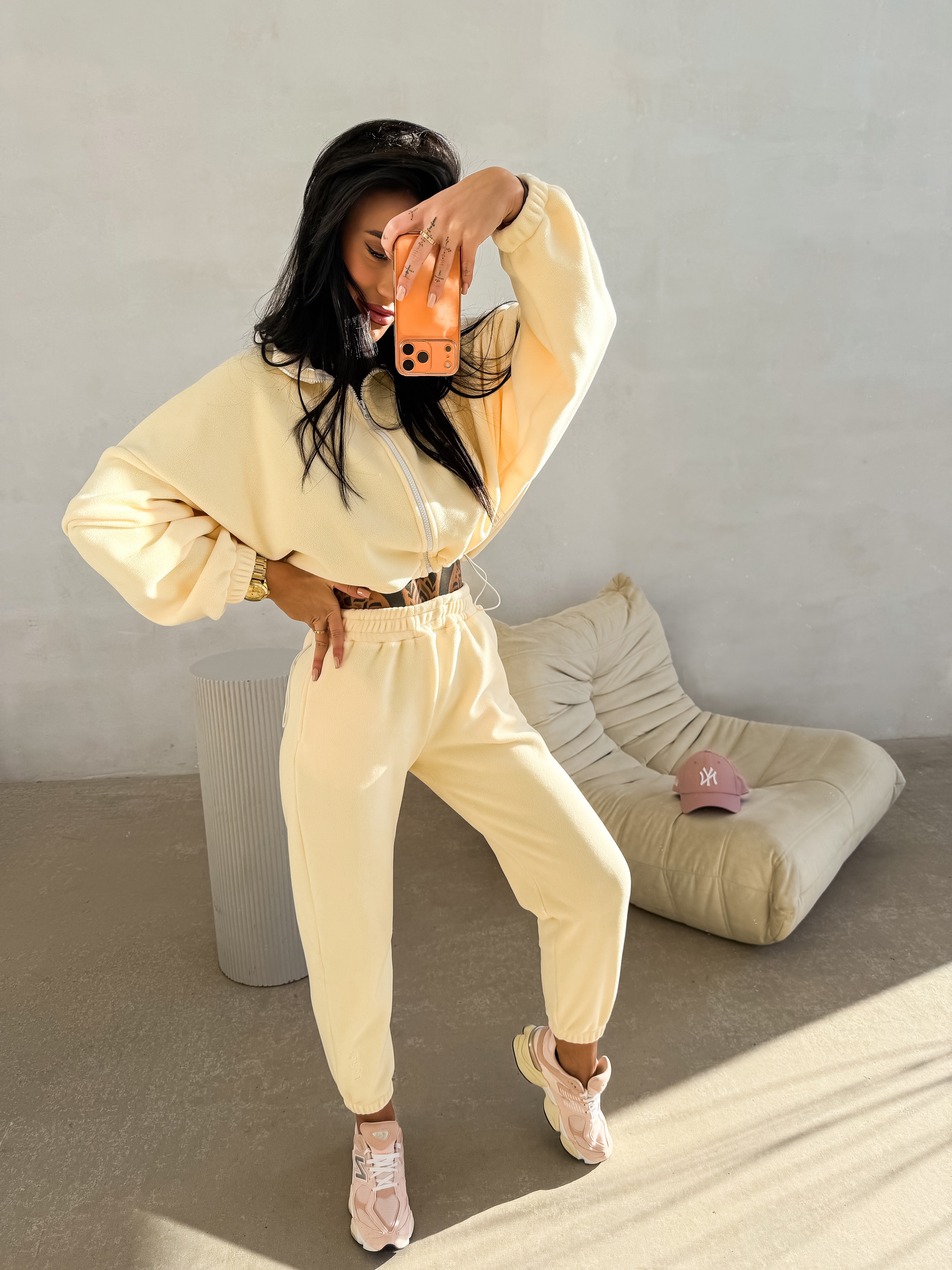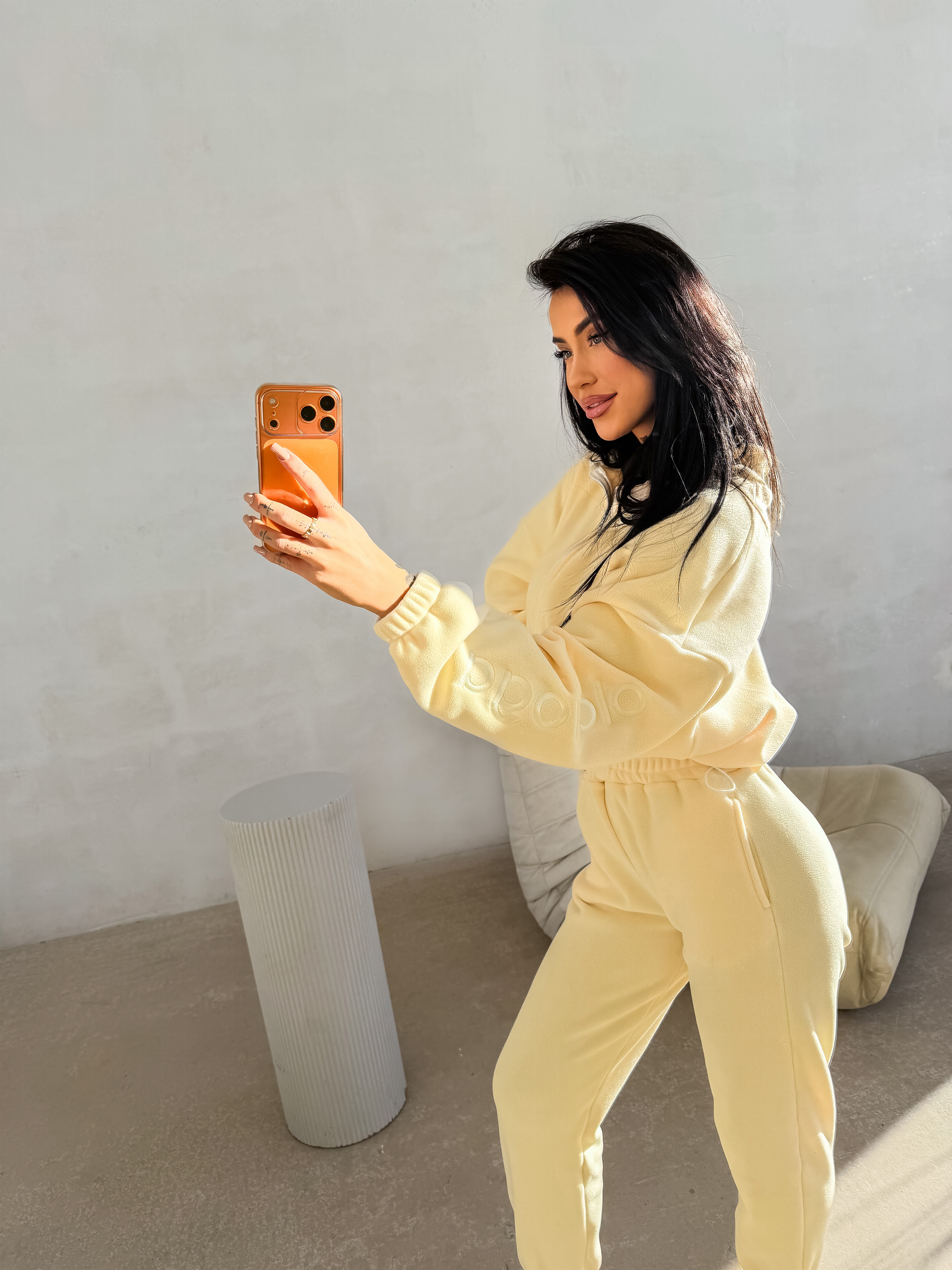 Casualowy komplet wykonany z miękkiej, przyjemnej w dotyku dzianiny polarowej o subtelnej, jednolitej strukturze. Góra - krótka bluza zapinana na suwak, o luźnym, lekko oversize’owym kroju. Model z długim rękawem, zakończonym elastycznym ściągaczem. Na rękawie umieszczone wyraziste, haftowane logo marki OLAVOGA. Dół - spodnie z wysokim stanem i elastyczną talią. Nogawki o prostym kroju, zwężane ku dołowi i wykończone ściągaczem.