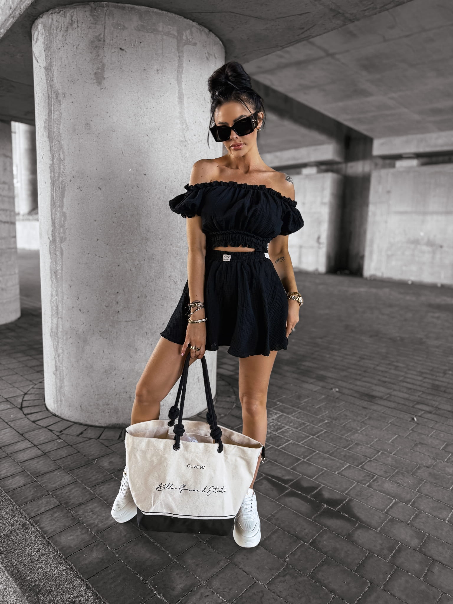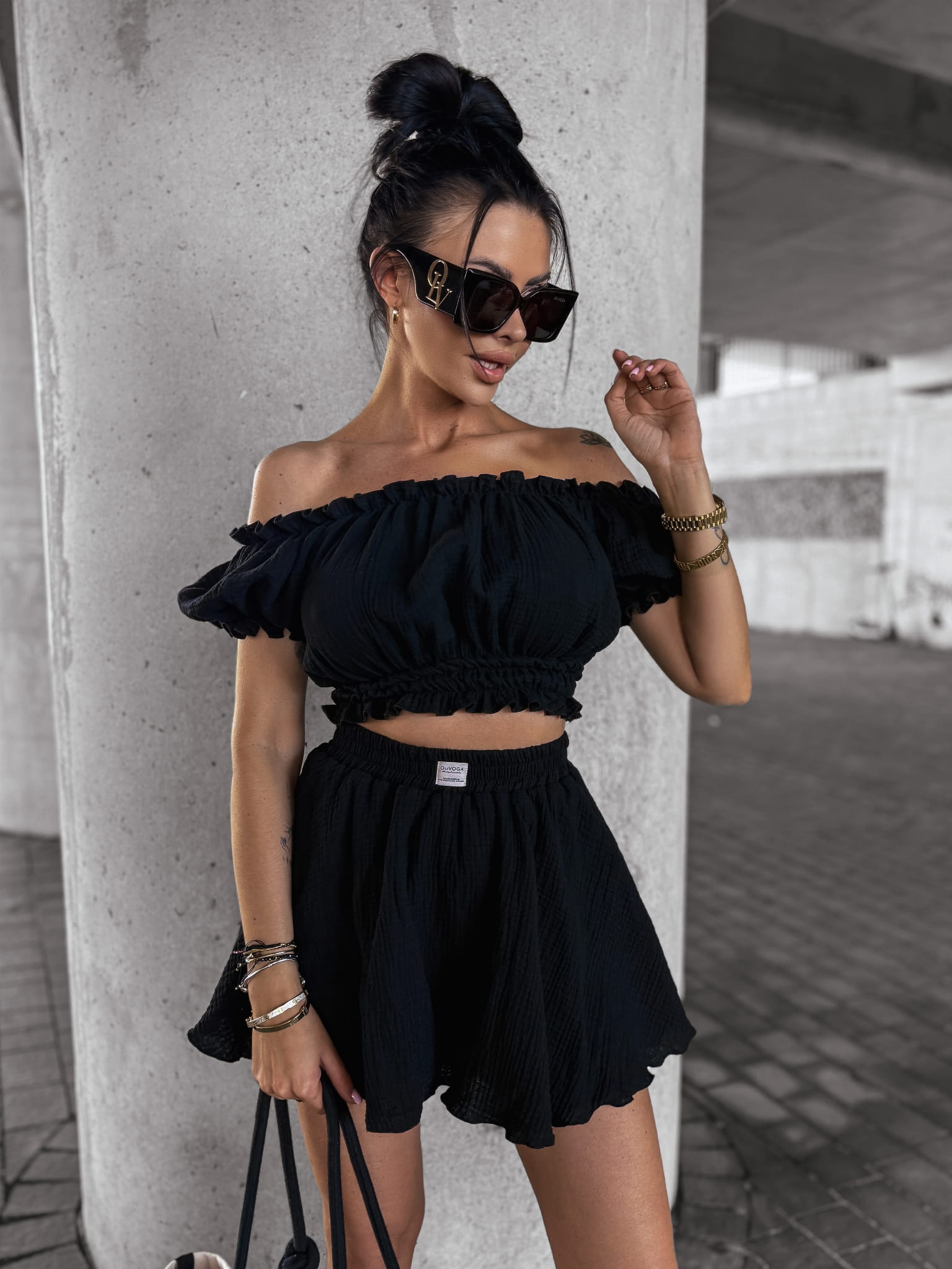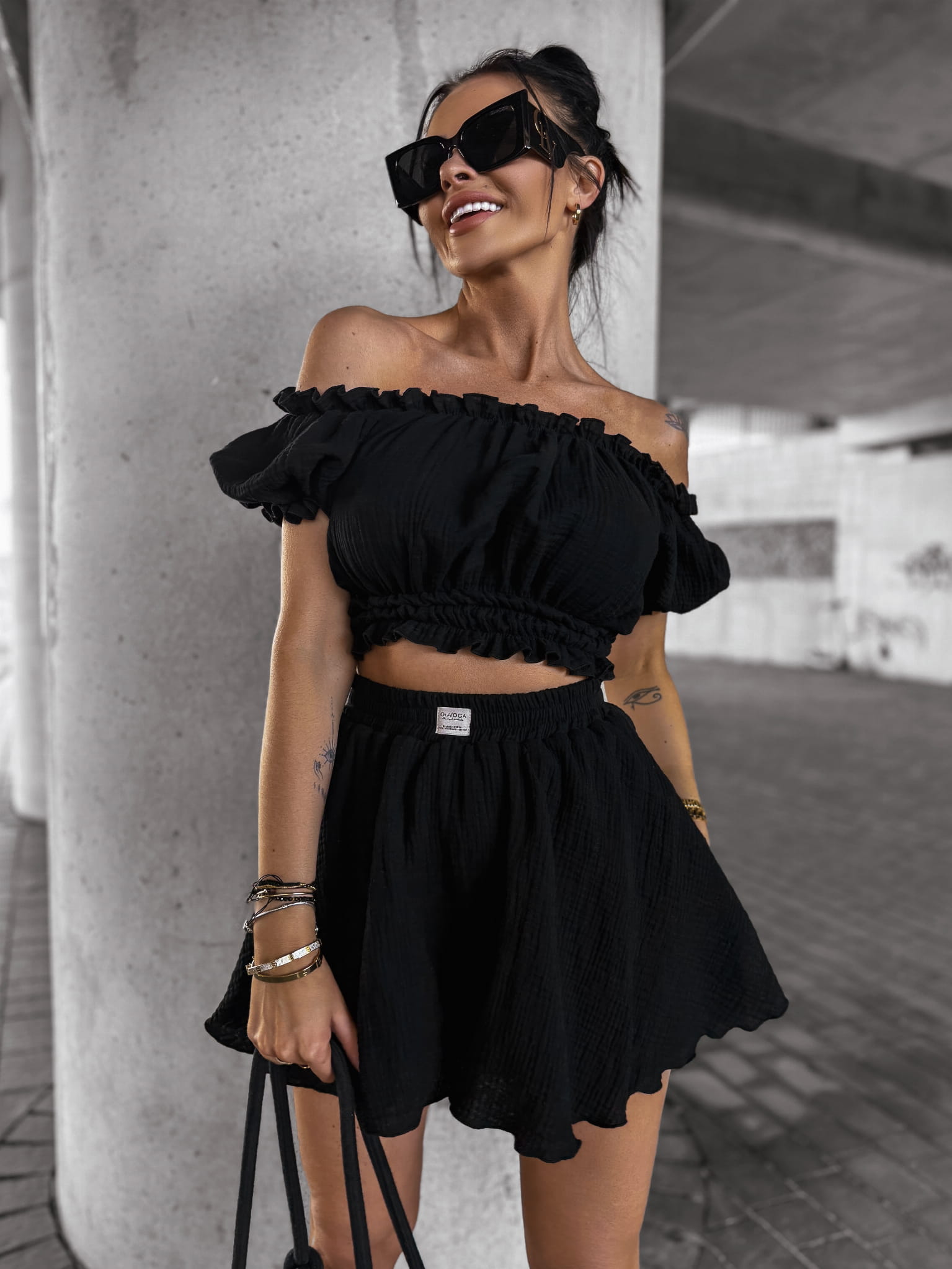 Komplet damski, wykonany z wysokiej jakości zwiewnego muślinu. Góra - bluzka, typu hiszpanka z krótkim rękawem. Bufiaste rękawy. W pasie guma. Dół - spódnico-spodnie z falbankami. Produkt posiada wysoki stan. W talii logowana metka.