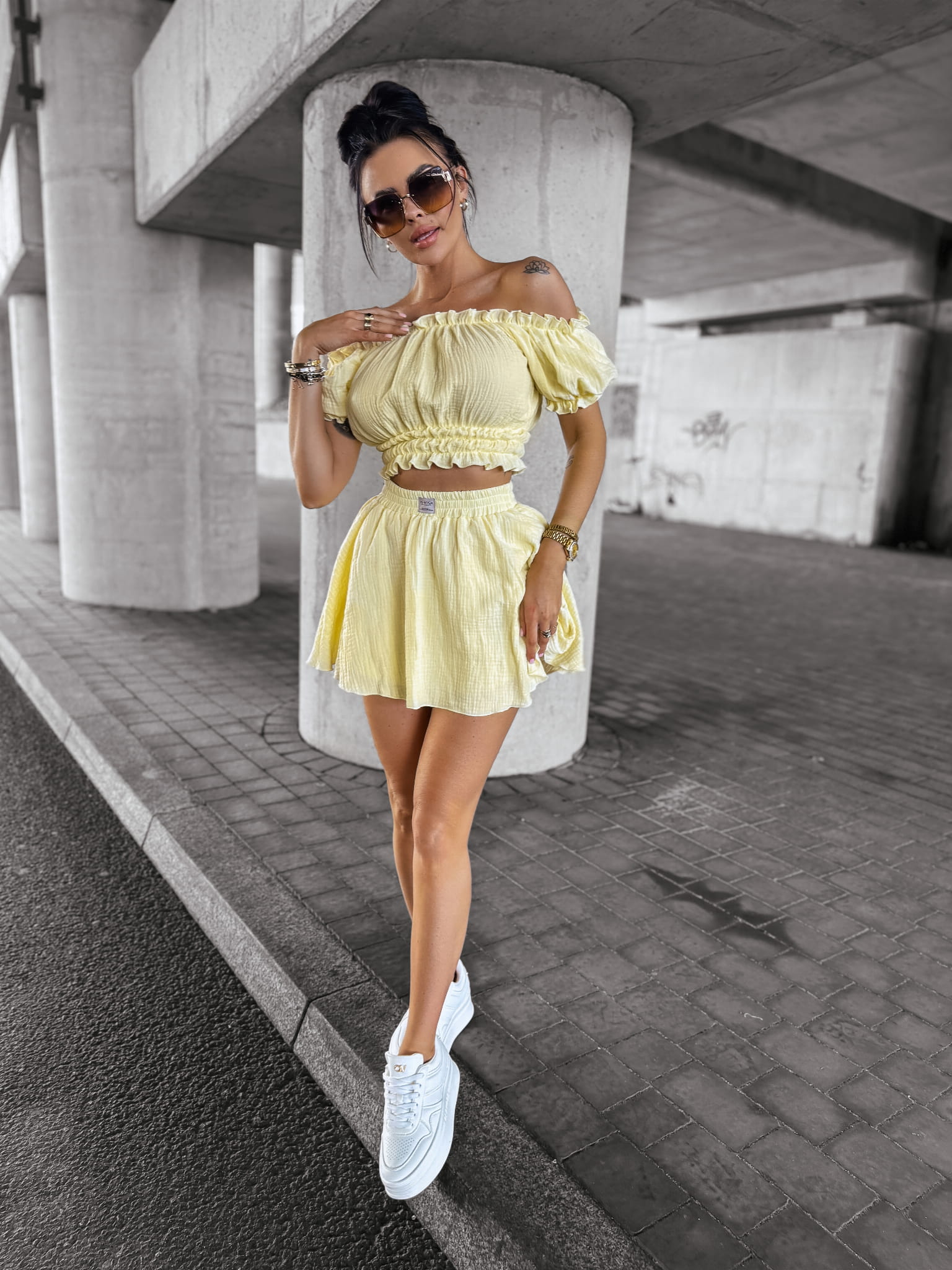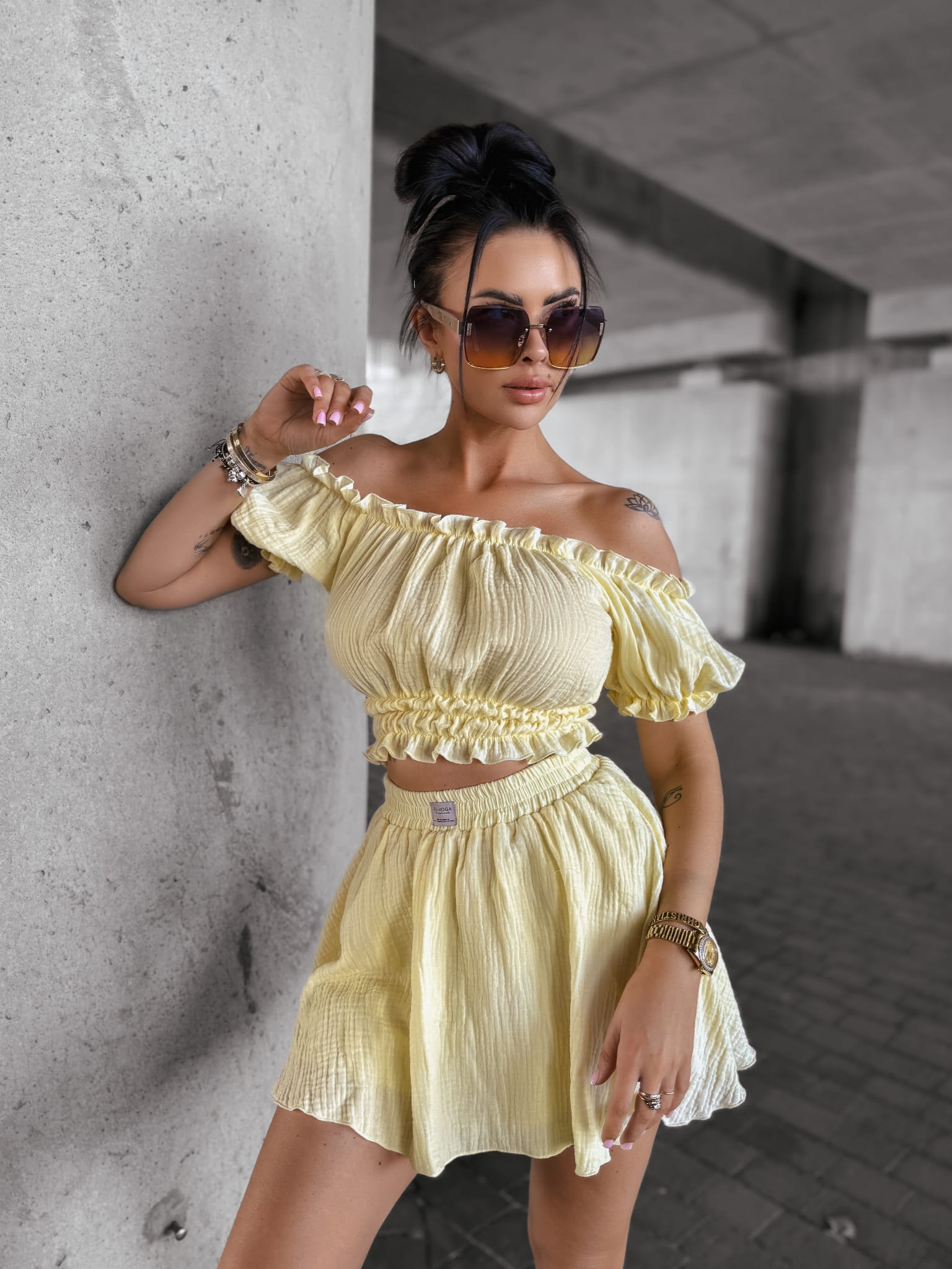 Komplet damski, wykonany z wysokiej jakości zwiewnego muślinu. Góra - bluzka, typu hiszpanka z krótkim rękawem. Bufiaste rękawy. W pasie guma. Dół - spódnico-spodnie z falbankami. Produkt posiada wysoki stan. W talii logowana metka.