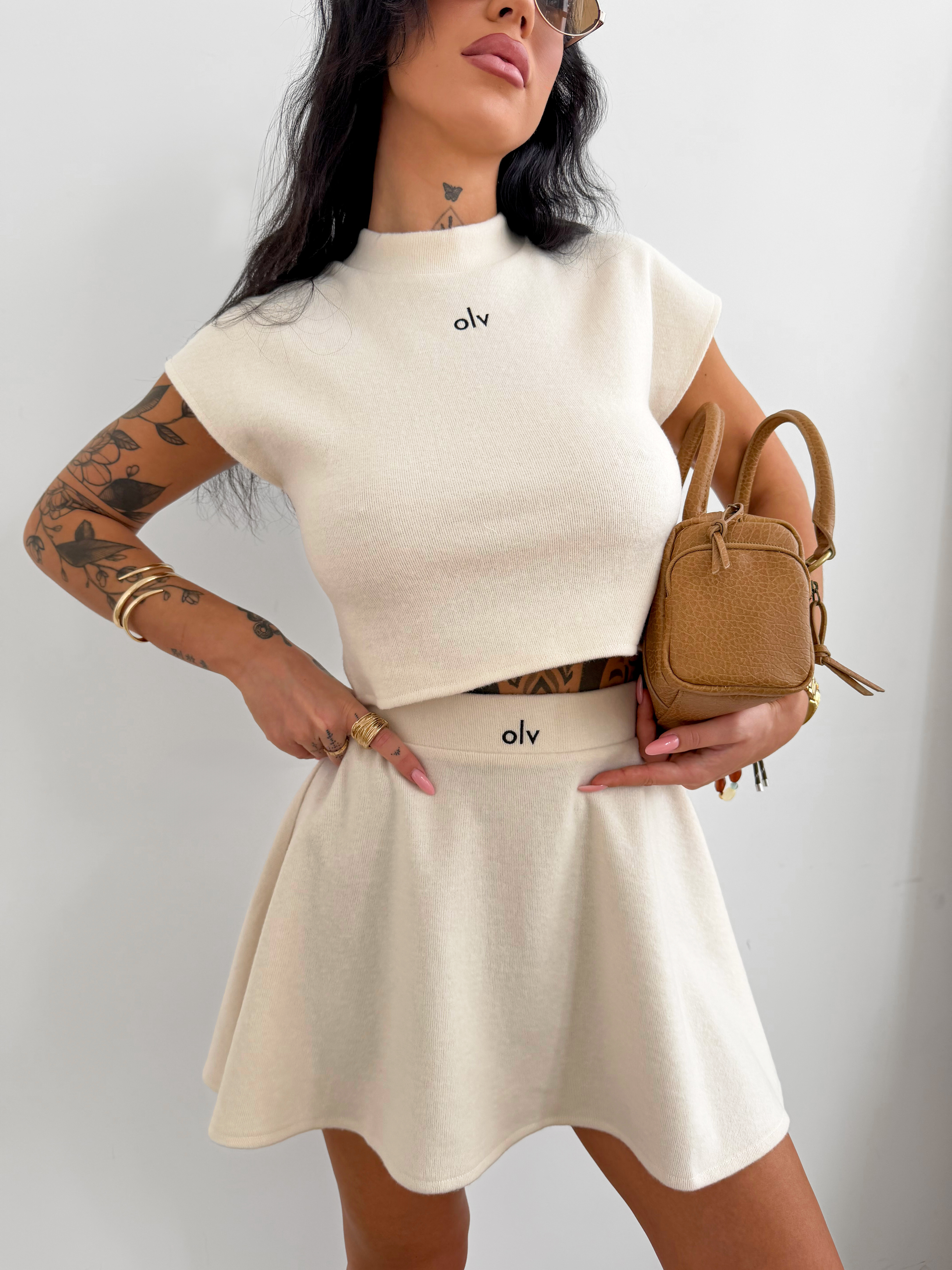 Top o skróconym kroju - krótki rękaw z wyraźnie zaznaczona linia ramion - dekolt ze stójką - na przodzie subtelne haftowane logo w kontrastowym kolorze - spódnica o lekko rozkloszowanym fasonie - długość mini - subtelny haft OLV w pasie - wysokogatunkowa dzianina