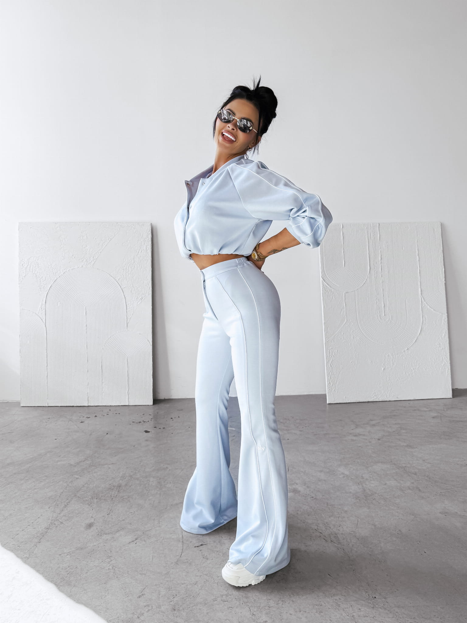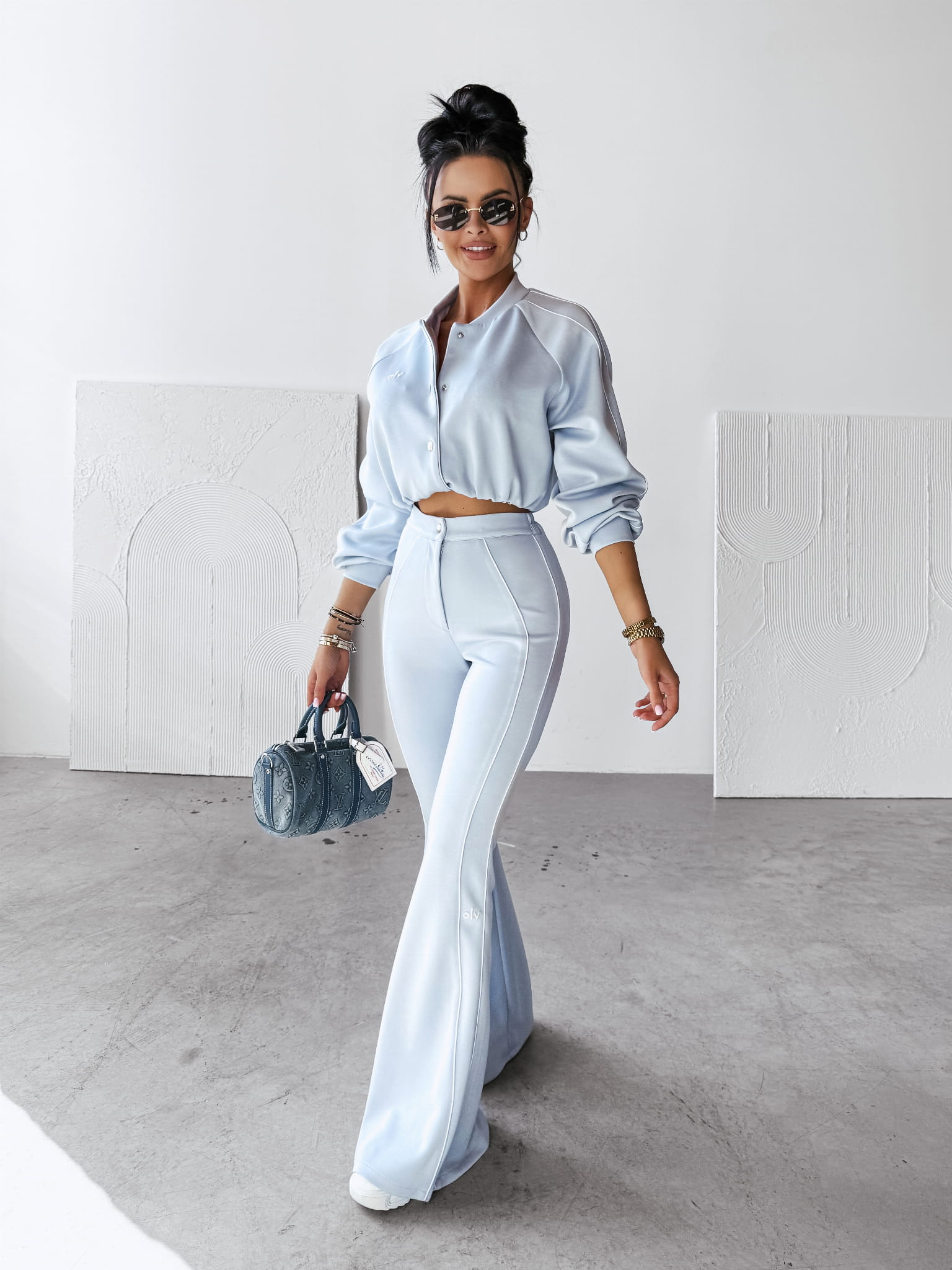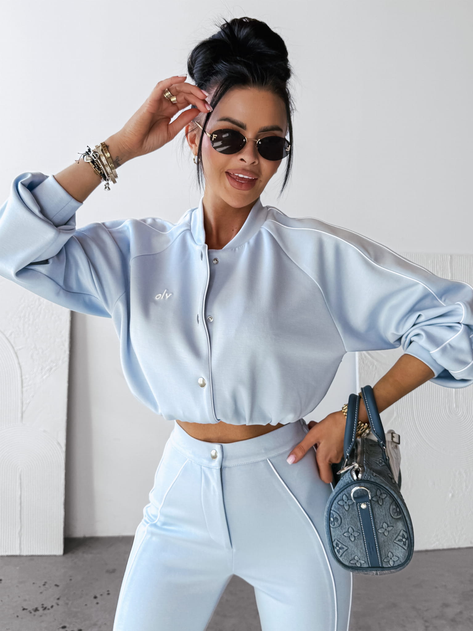 Casualowy komplet damski wykonany z wysokiej jakości oddychającego materiału. Góra - kurtka, typu bomberka. Po bokach lampasy. Na przodzie haft 3D OLV. Guma w talii. Dół - spodnie rozszerzane ku dołowi. Po bokach lampasy oraz haft OLV, po dwóch stronach. Nogawki rozszerzane ku dołowi.