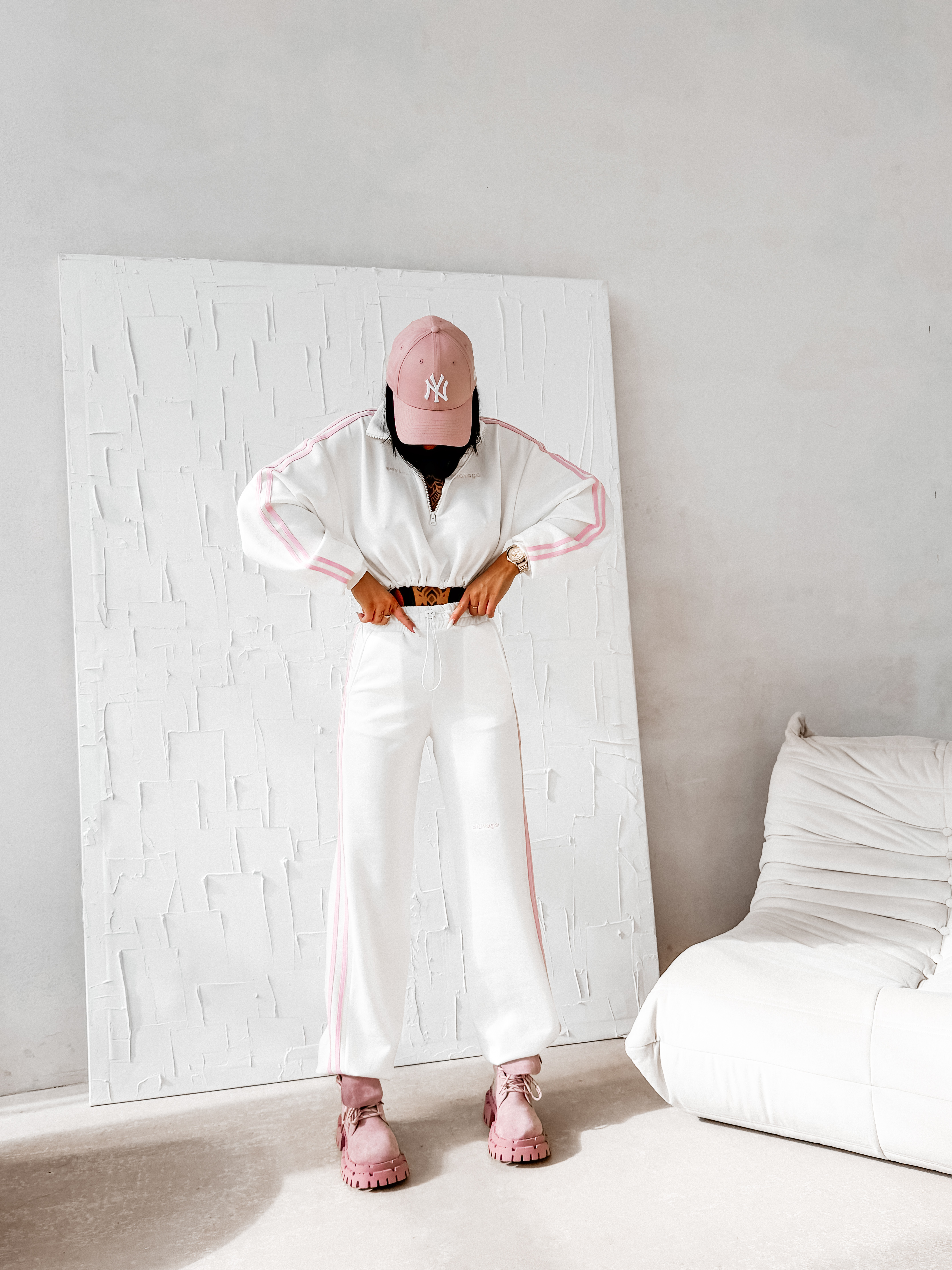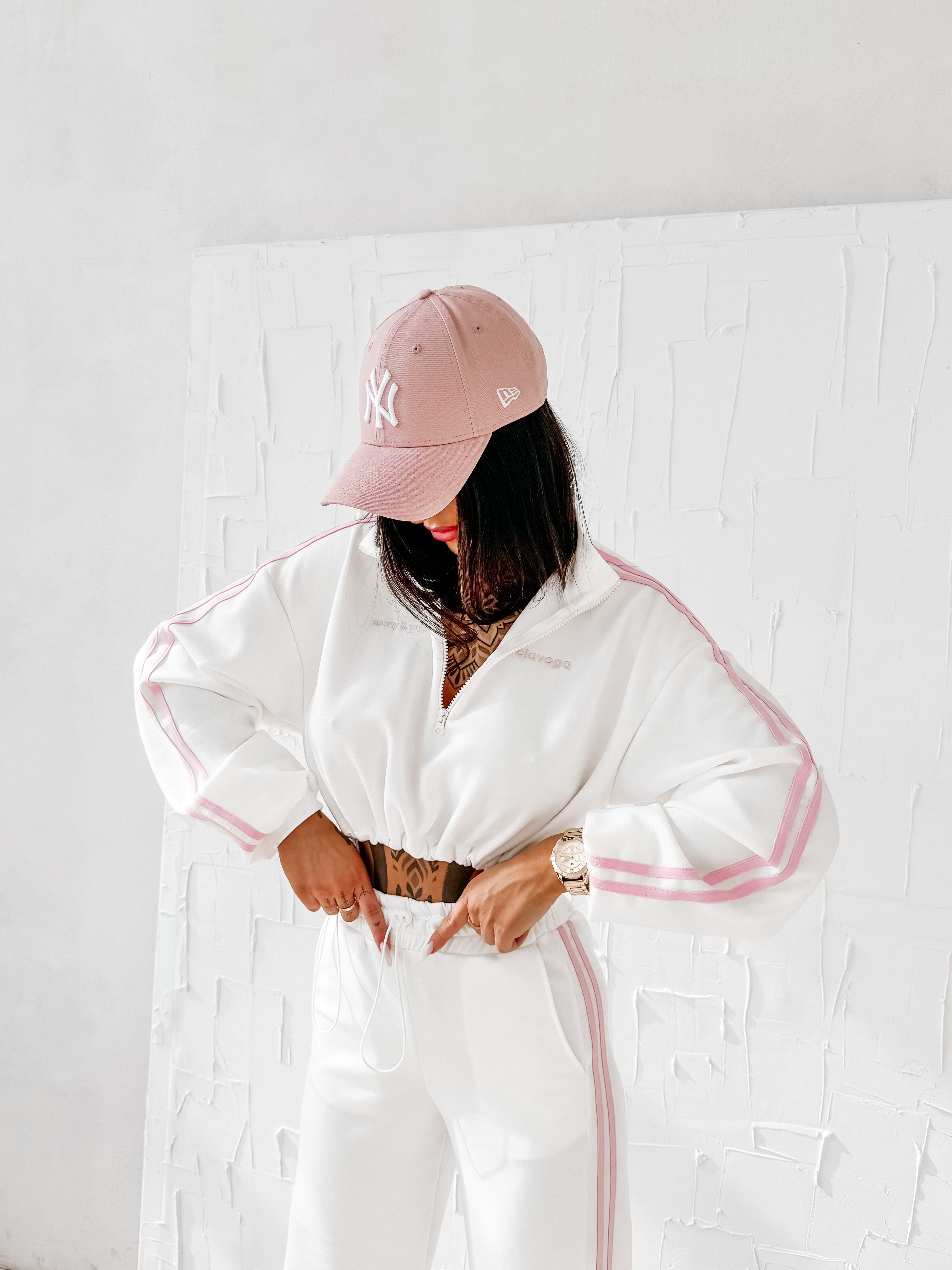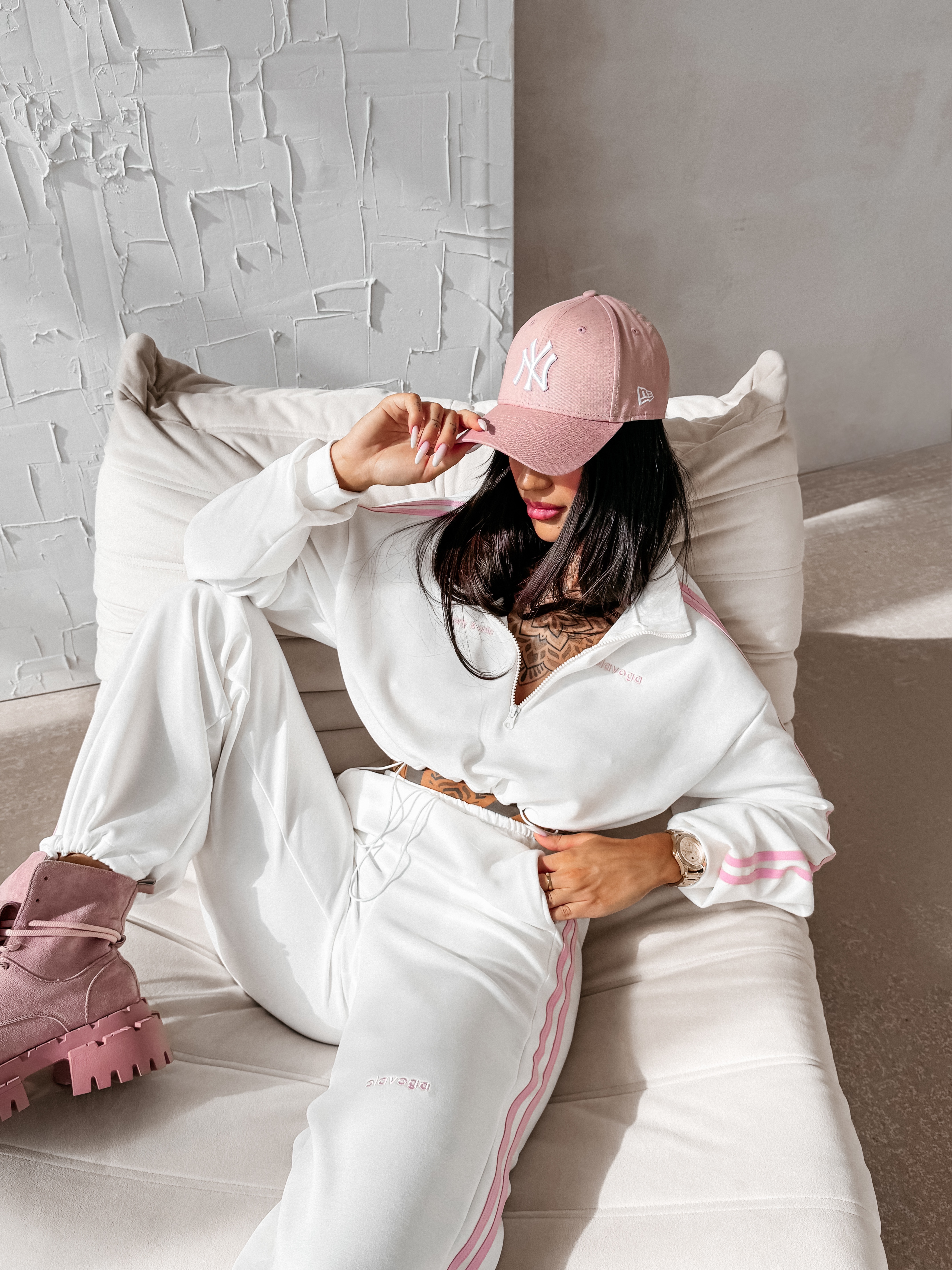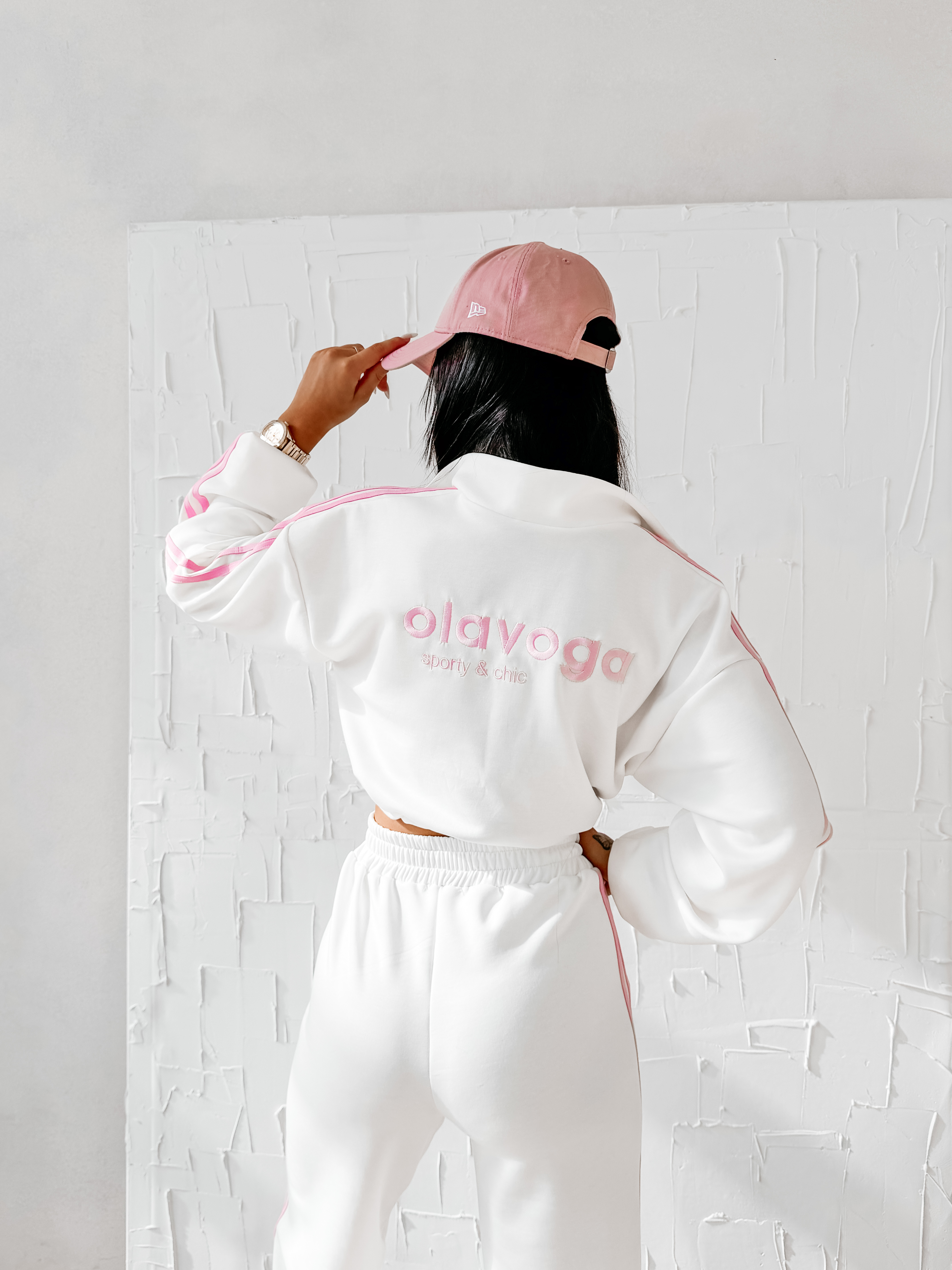 Bluza o skróconym kroju - model ze stójką - zapięcie na krótki suwak - długie rękawy zakończone ściągaczami - dół regulowany stoperami - na rękawach kontrastowe lampasy - subtelne logo na przodzie - na tyle logowanie z hasłem sporty&chic Spodnie loose/ wide leg - elastyczna talia z regulacją na stoper - kontrastowe lampasy - nogawki zakończone stoperami - kieszenie w szwie - delikatne logo OLAVOGA