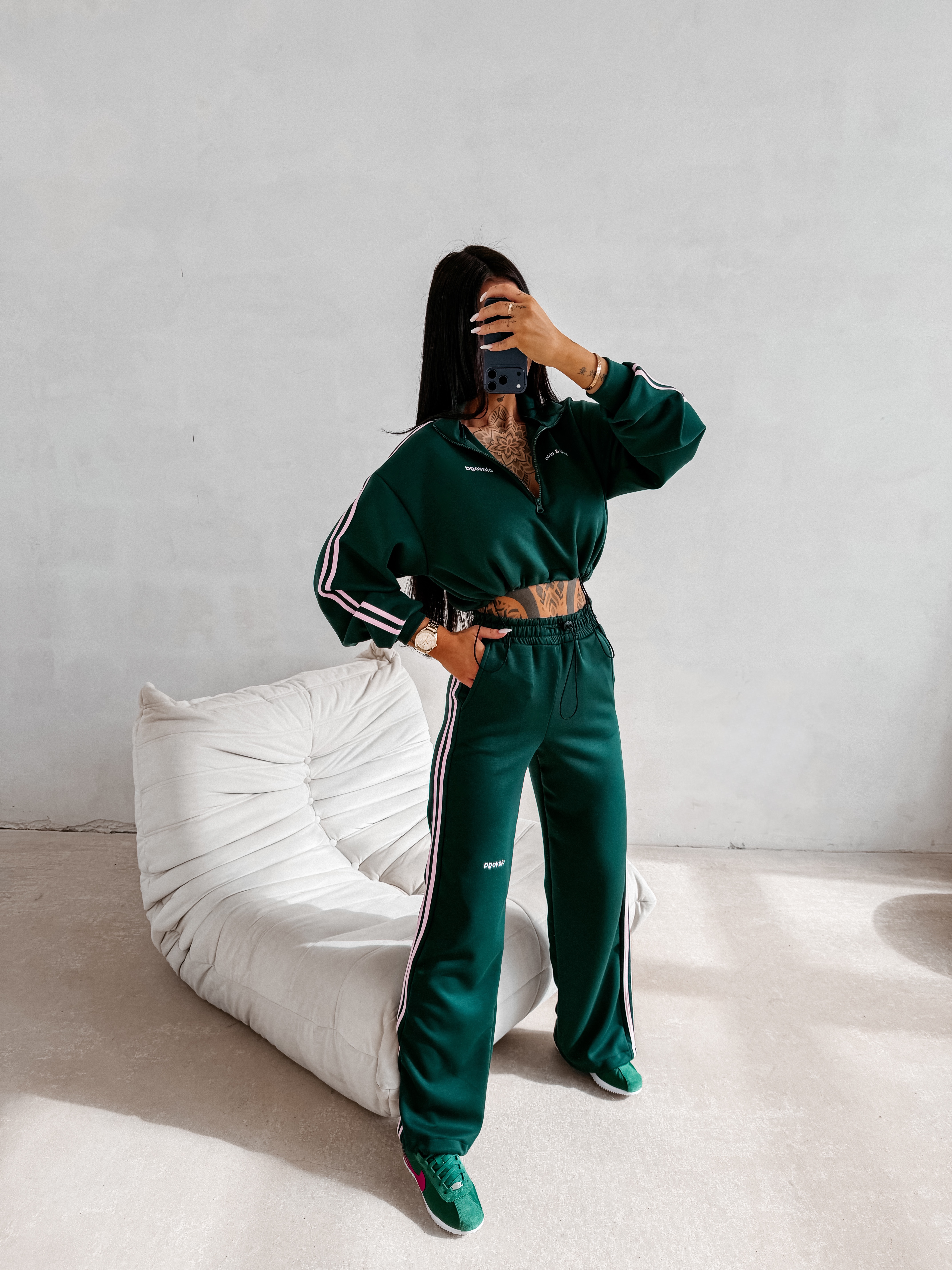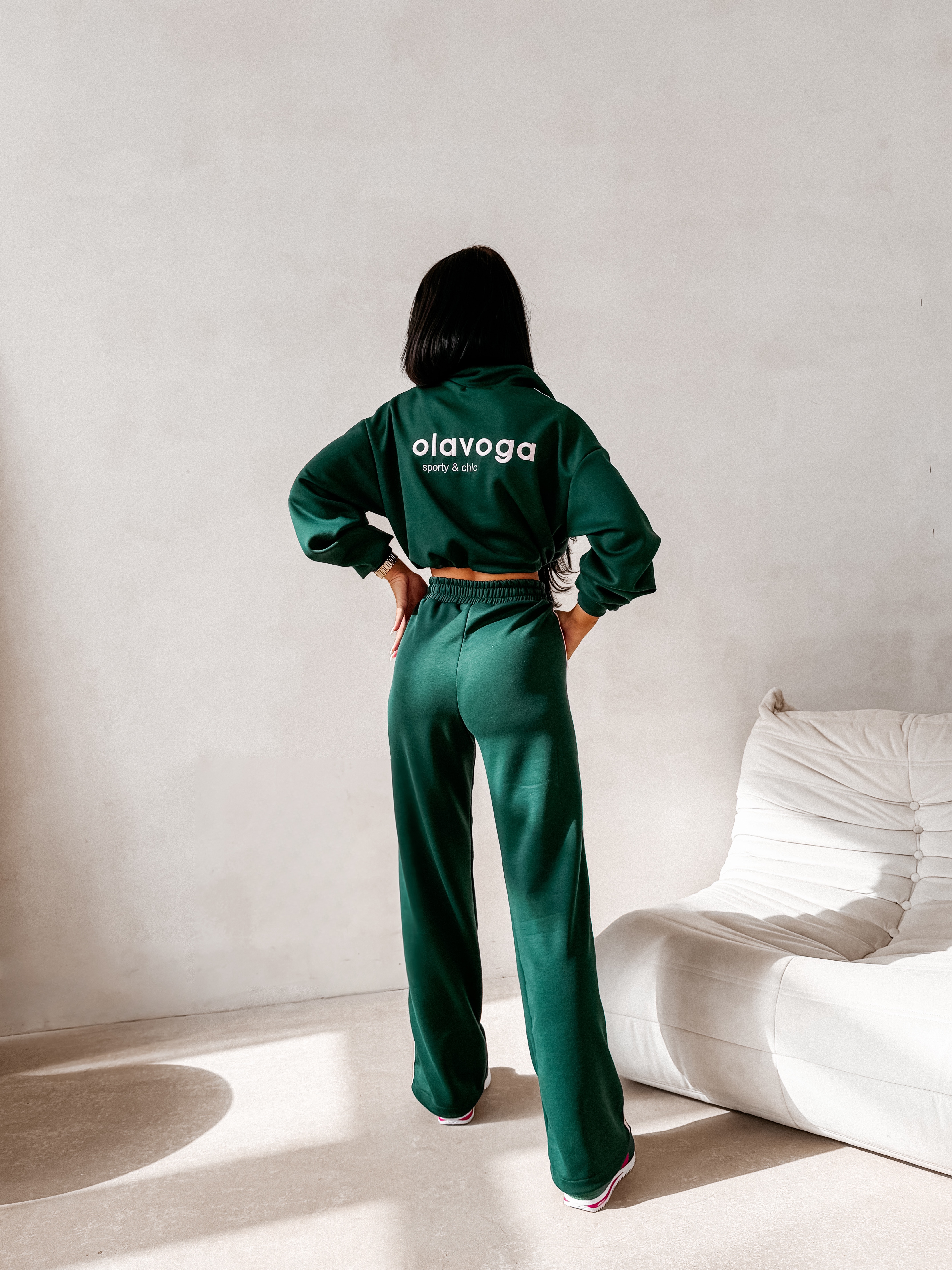 Bluza o skróconym kroju - model ze stójką - zapięcie na krótki suwak - długie rękawy zakończone ściągaczami - dół regulowany stoperami - na rękawach kontrastowe lampasy - subtelne logo na przodzie - na tyle logowanie z hasłem sporty&chic Spodnie loose/ wide leg - elastyczna talia z regulacją na stoper - kontrastowe lampasy - nogawki zakończone stoperami - kieszenie w szwie - delikatne logo OLAVOGA