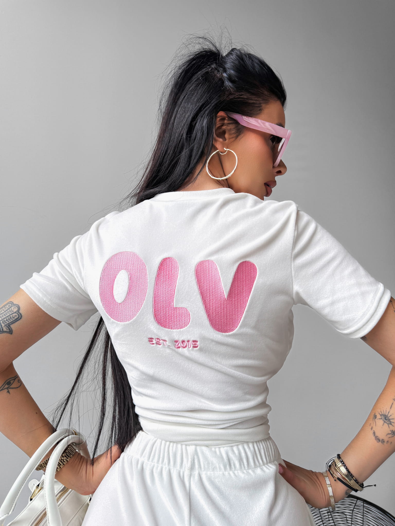 Sportowy komplet, wykonany z miękkiego w dotyku weluru. Góra - bluza z długim rękawem, o dłuższym kroju. Na przodzie haft z napisem OLV. Na tyle obszerny napis OLV z EST 2015. Dół - sportowe spodnie z wysokim stanem. Po bokach kieszenie. Wysoki stan. Na brzegach ściągacze. Na przodzie haft z napisem OLV.