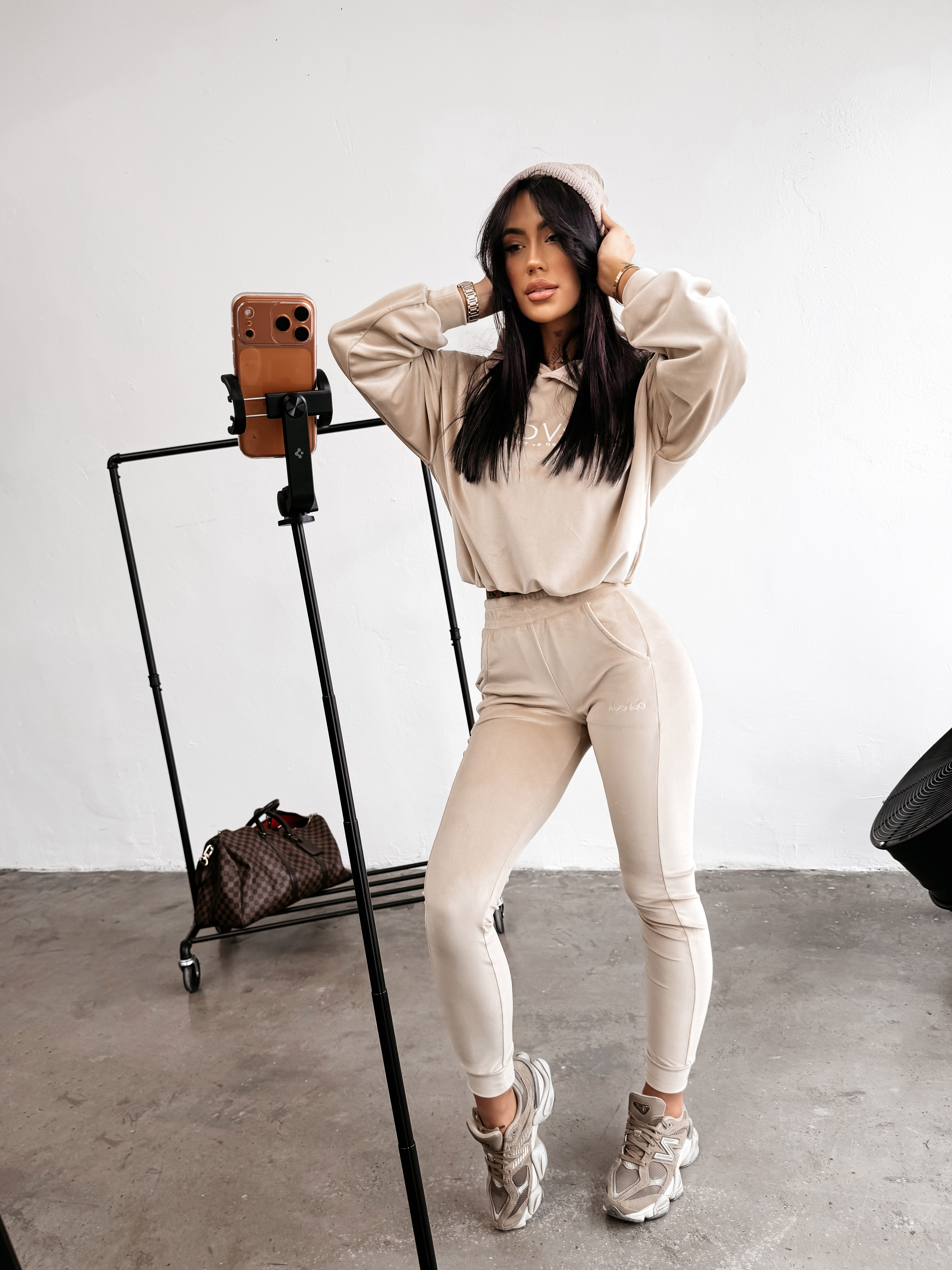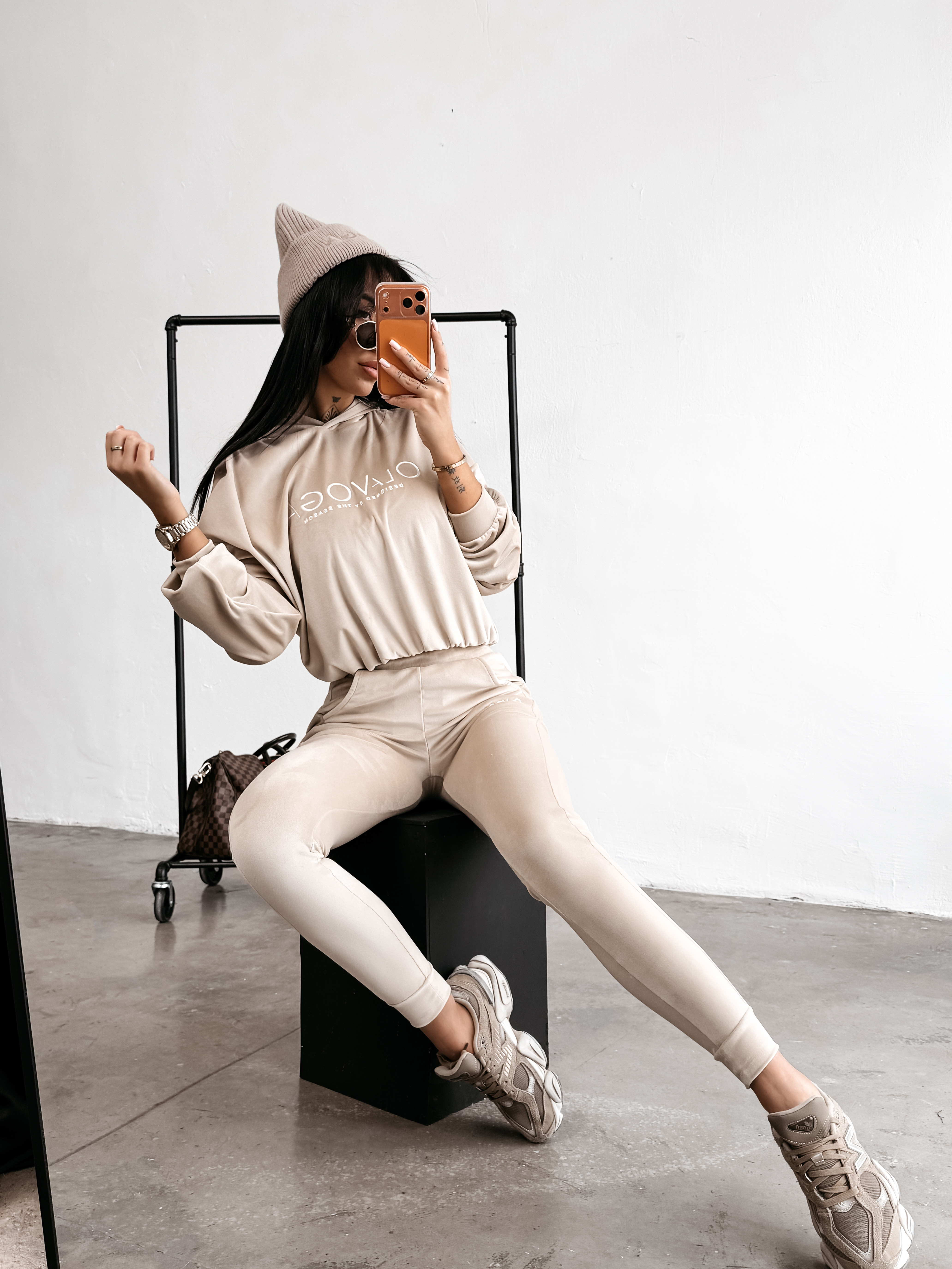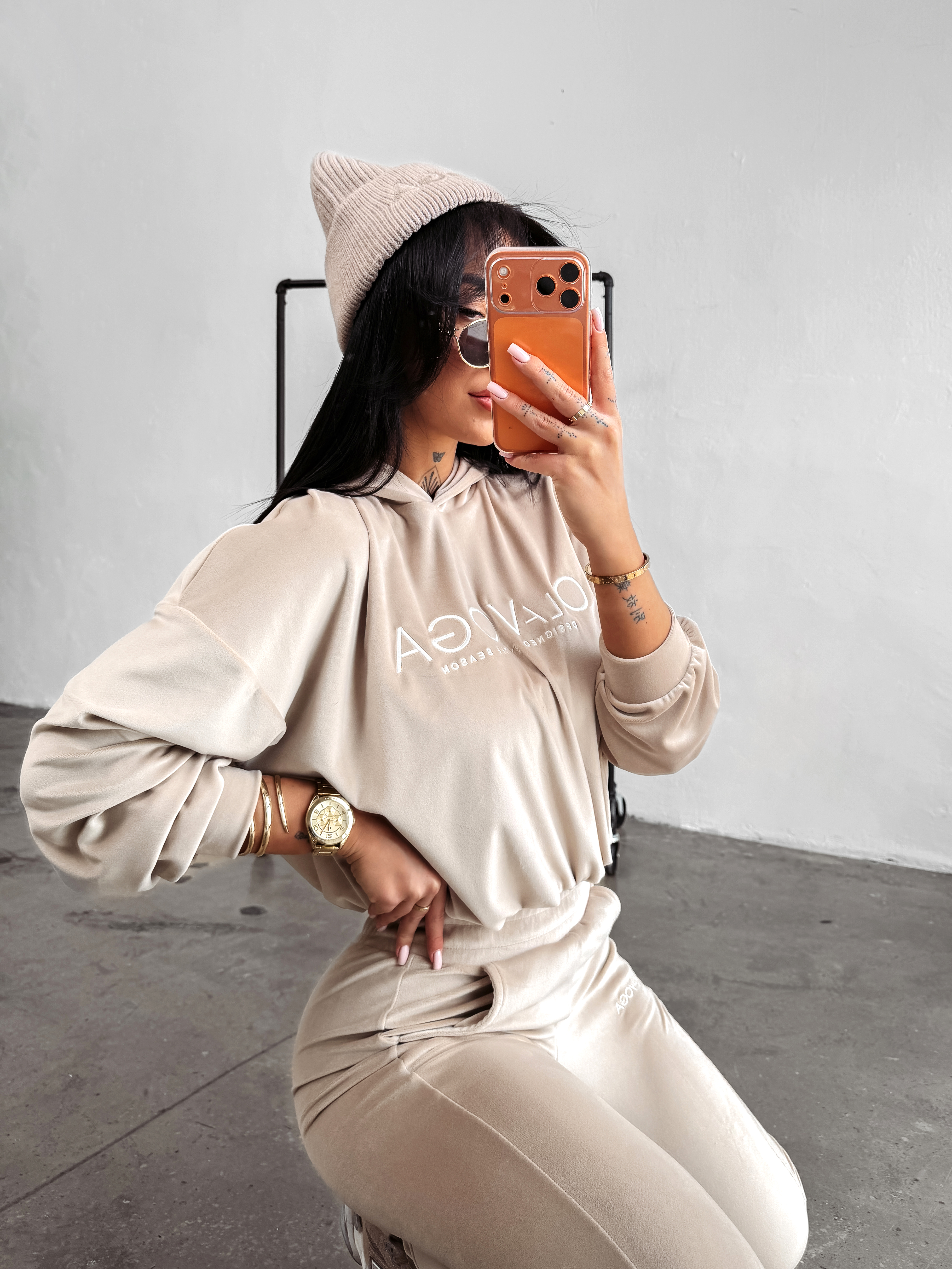 Miękki, welurowy komplet o casualowym charakterze. Wykonany z przyjemnego w dotyku materiału o delikatnym połysku. Góra - bluza z kapturem o luźnym kroju, z lekko obniżoną linią ramion oraz elastycznym wykończeniem u dołu i przy mankietach. Na przodzie minimalistyczny haft z logo marki OLAVOGA. Dół - spodnie o dopasowanym kroju, z elastyczną talią i praktycznymi kieszeniami. Nogawki zakończone ściągaczami delikatnie podkreślają sylwetkę oraz subtelny haft z logo marki OLAVOGA na nogawce