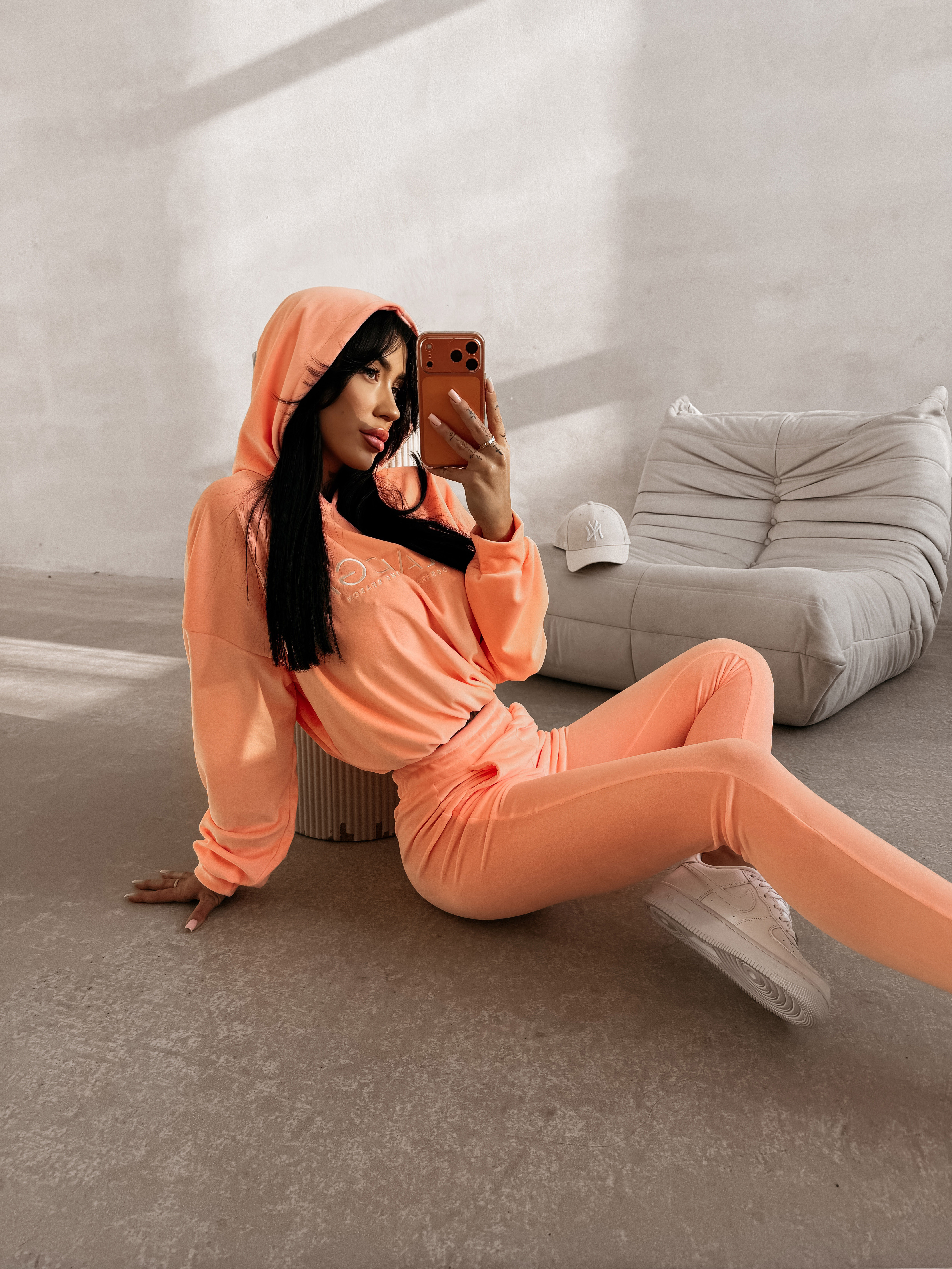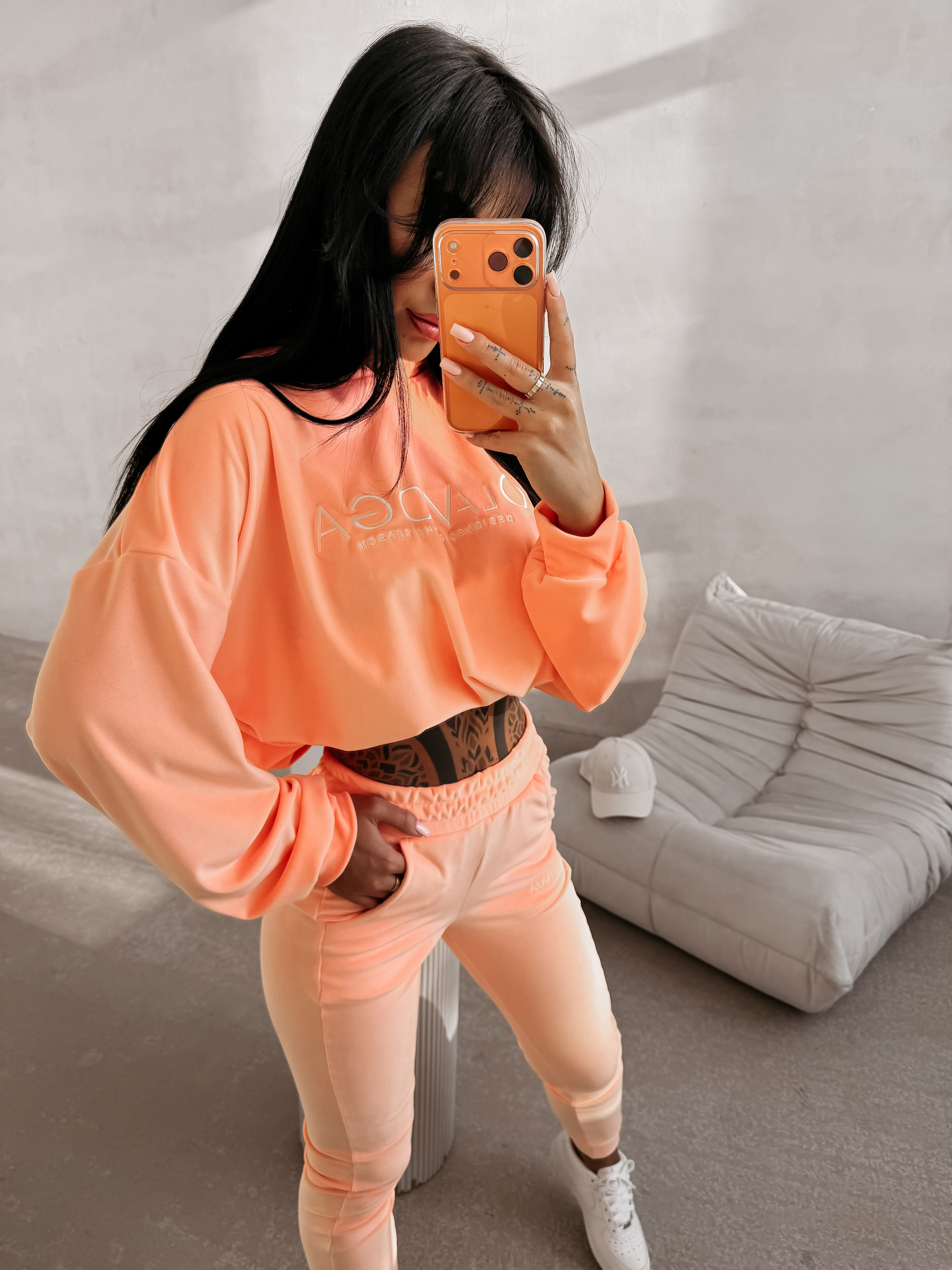 Miękki, welurowy komplet o casualowym charakterze. Wykonany z przyjemnego w dotyku materiału o delikatnym połysku. Góra - bluza z kapturem o luźnym kroju, z lekko obniżoną linią ramion oraz elastycznym wykończeniem u dołu i przy mankietach. Na przodzie minimalistyczny haft z logo marki OLAVOGA. Dół - spodnie o dopasowanym kroju, z elastyczną talią i praktycznymi kieszeniami. Nogawki zakończone ściągaczami delikatnie podkreślają sylwetkę oraz subtelny haft z logo marki OLAVOGA na nogawce