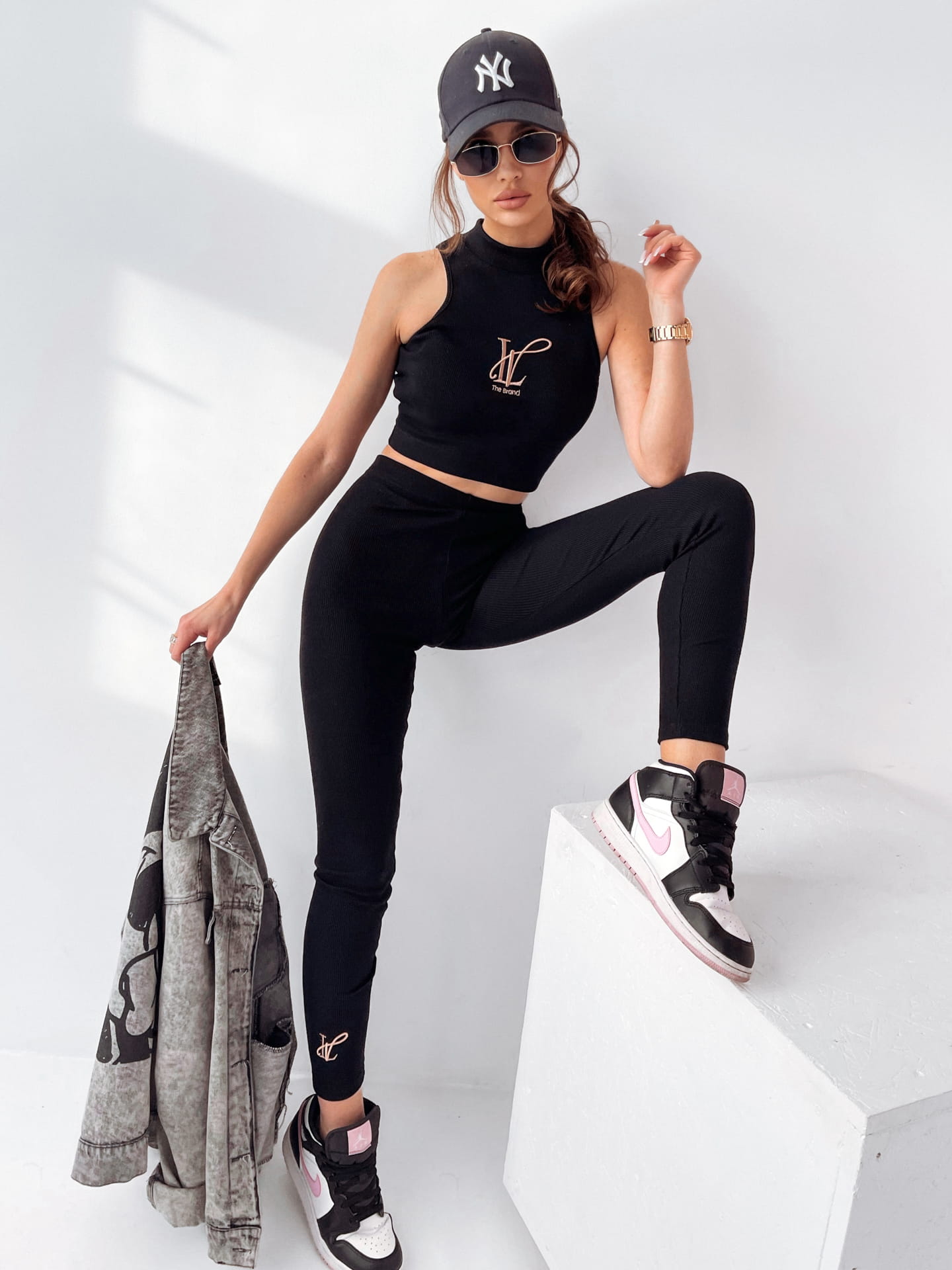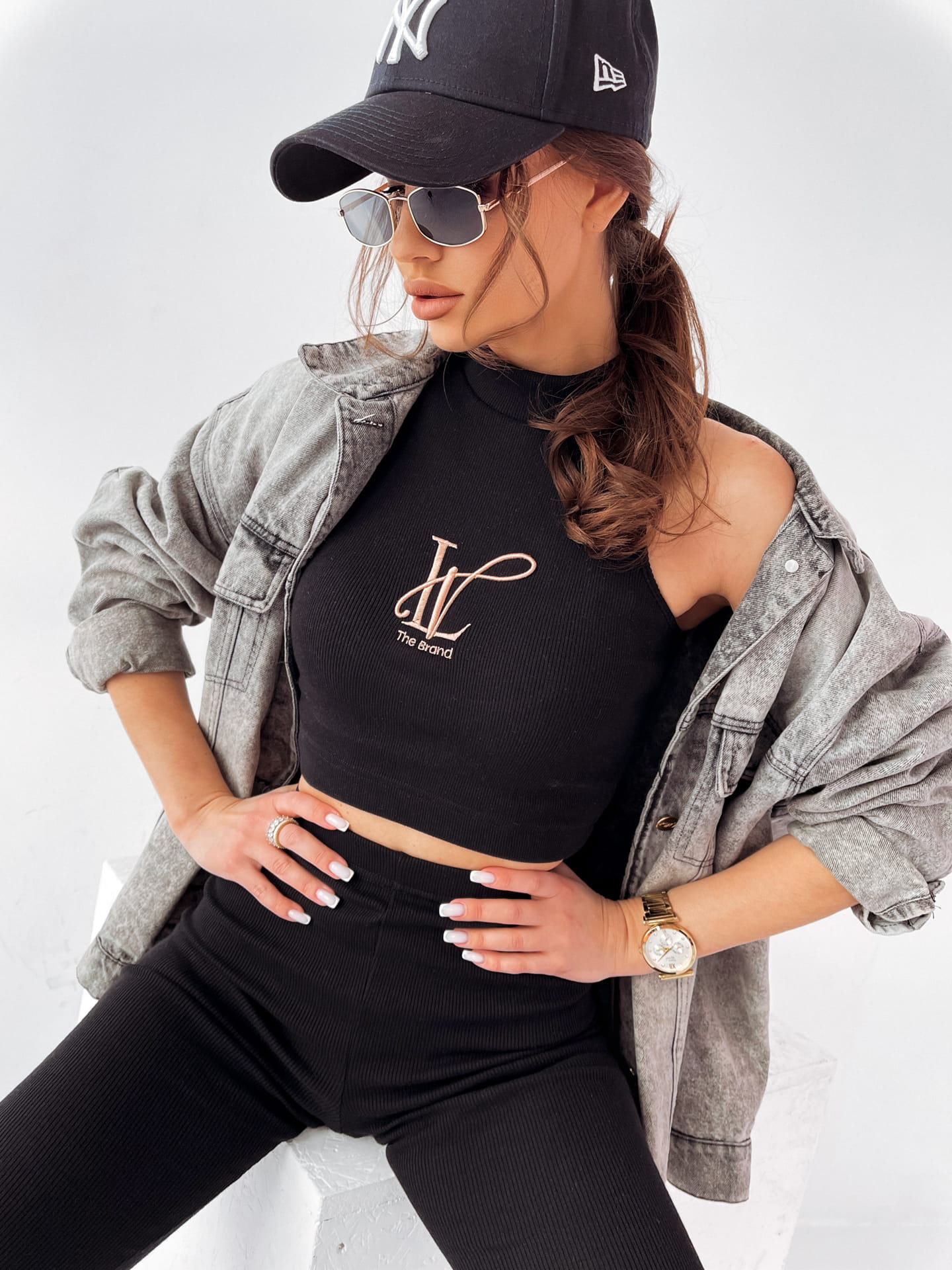 Komplet damski „JENNY” . Góra z półgolfem i odkrytymi ramionami oraz delikatnym logo na przodzie. Dopasowany krój podkreśla kobiecą sylwetkę.