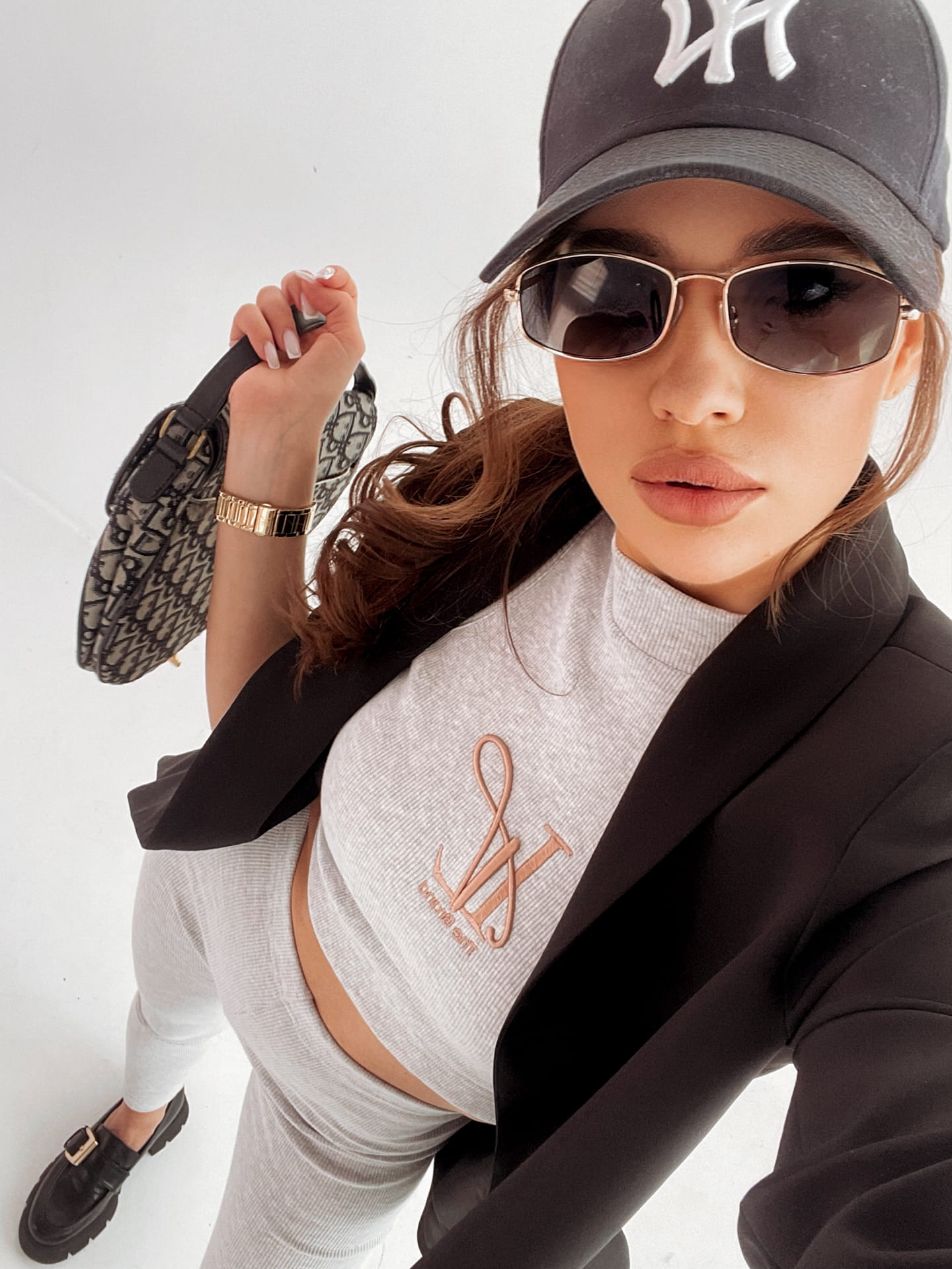 Komplet damski „JENNY” . Góra z półgolfem i odkrytymi ramionami oraz delikatnym logo na przodzie. Dopasowany krój podkreśla kobiecą sylwetkę.