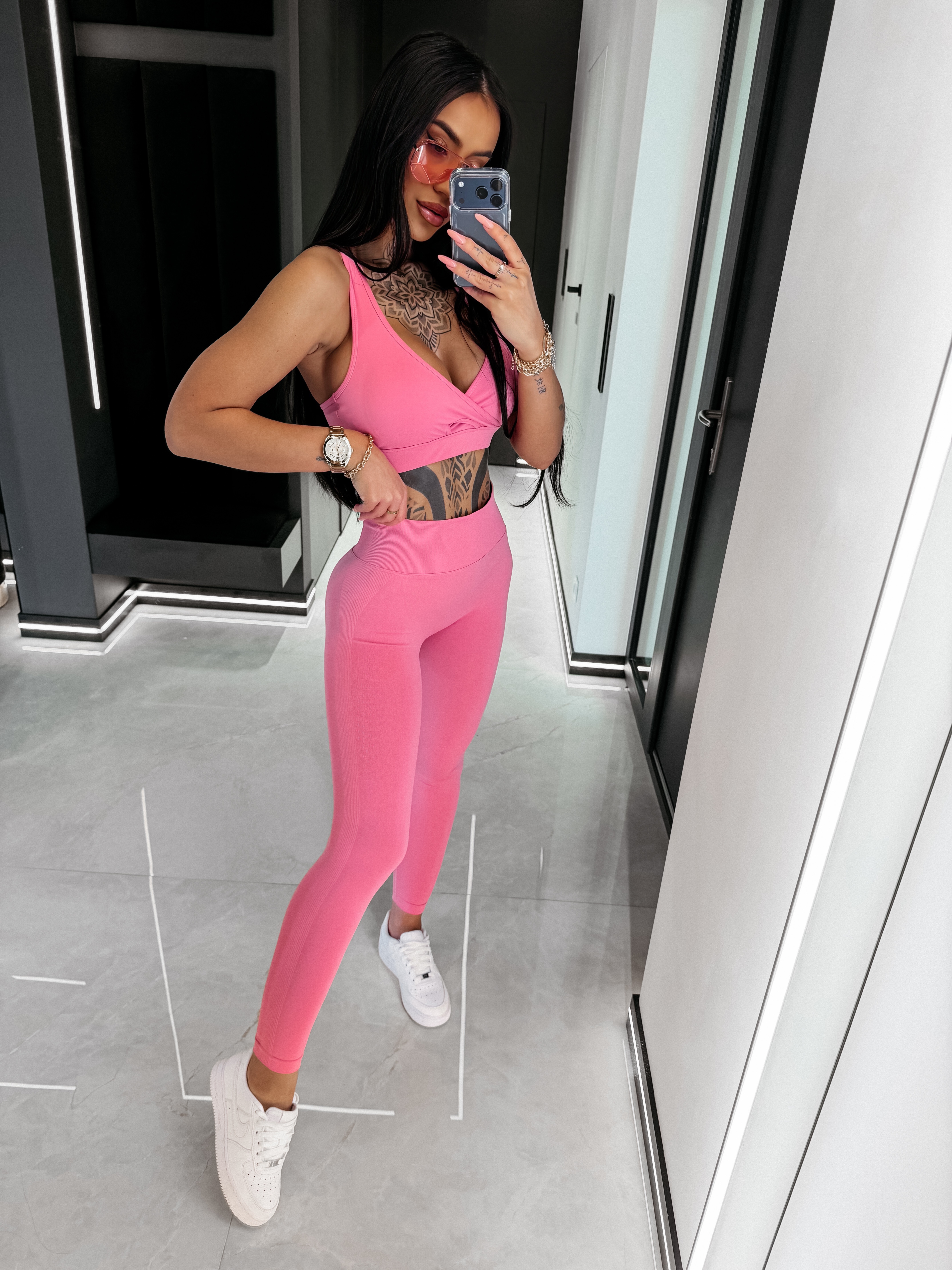 Komplet sportowy składający się z topu oraz legginsów - top z szerokimi ramiączkami i efektownym, krzyżowanym przodem modelującym biust - tył o sportowej konstrukcji typu racerback - legginsy z wysokim stanem - modelującym pasem - z tyłu modelujące marszczenie typu scrunch - na legginsach oddychająca, strukturalna faktura - na komplecie delikatne logowanie wykonane metodą 3D