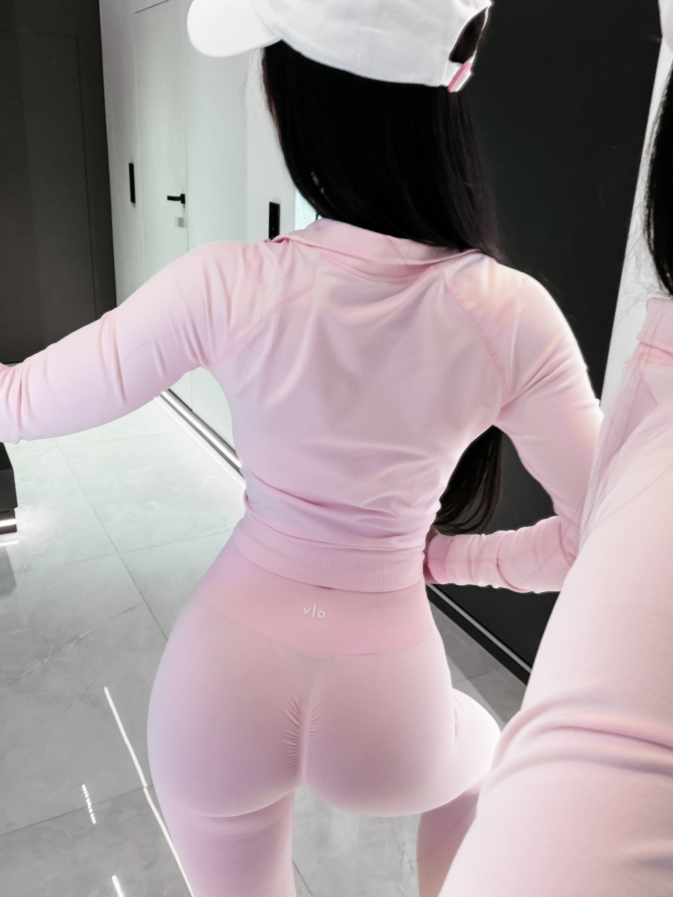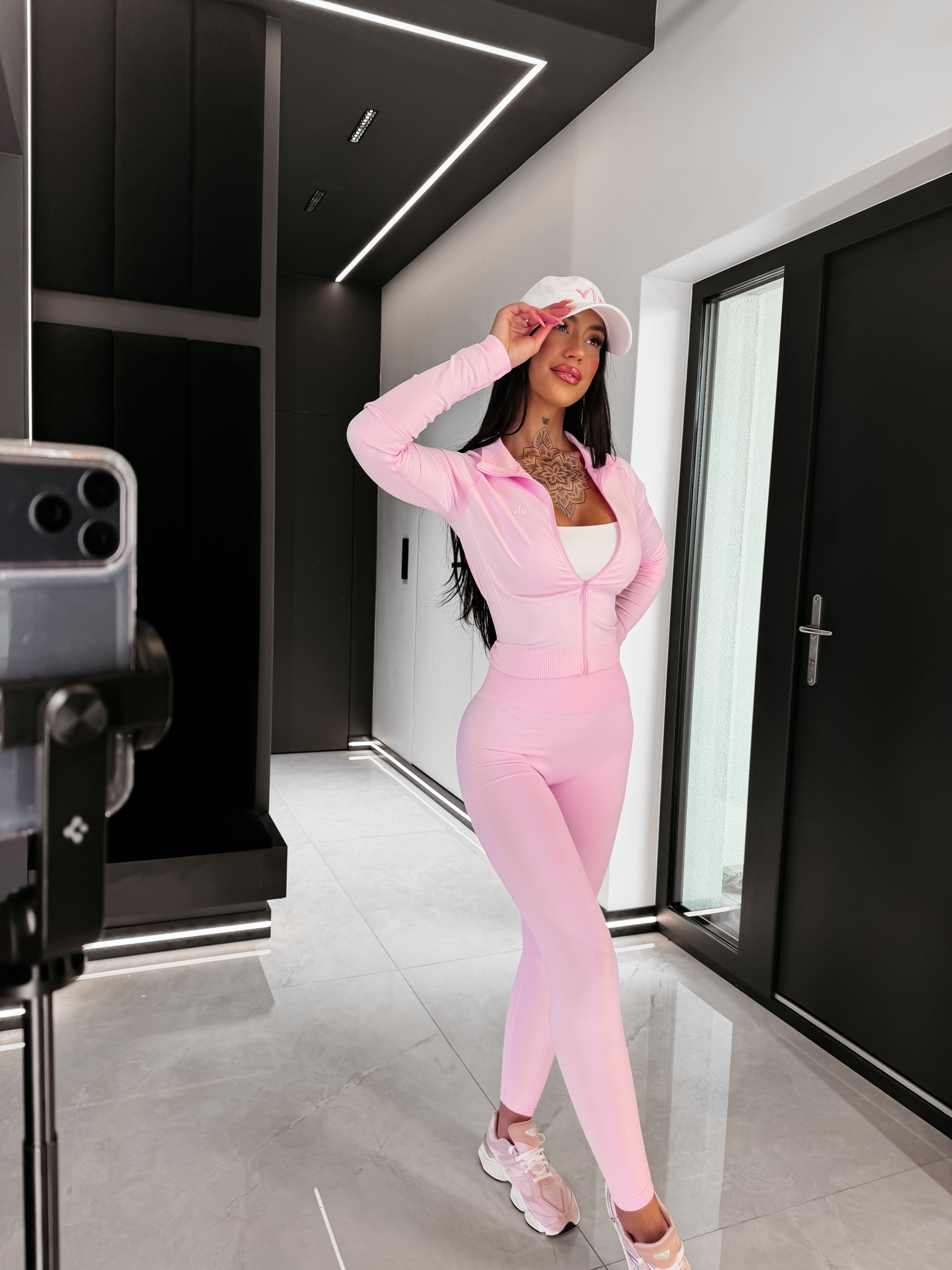 Komplet składający się z bluzy i legginsów - bluza o dopasowanym kroju - model zapinany na zamek w kolorze kompletu - wysoka stójka - raglanowa konstrukcja rękawów zapewniająca swobodę ruchu - po bokach wstawki z perforowanej, strukturalnej tkaniny - przeszycia optycznie modelujące sylwetkę - legginsy z wysokim stanem - modelującym pasem - z tyłu modelujące marszczenie typu scrunch - na legginsach oddychająca, strukturalna faktura - na komplecie delikatne logowanie wykonane metodą 3D