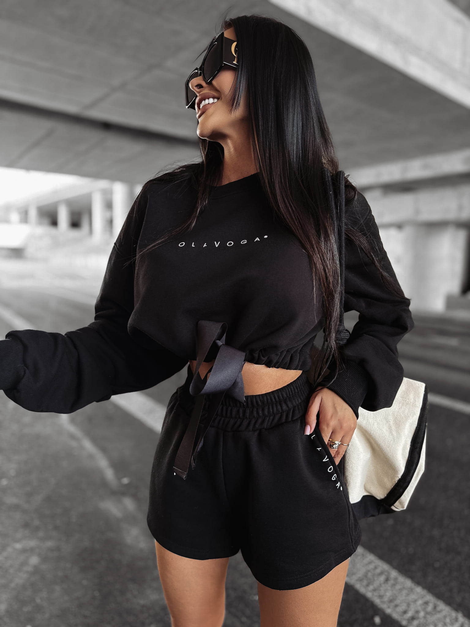 Casualowy komplet damski wykonany z wysokiej jakości materiału bawełnianego. Góra - bluza bez kaptura. Na brzegach prążkowane ściągacze. Na przodzie logo marki OLAVOGA. Regulacja w talii poprzez sznurek. Dół - szorty z wysokim stanem. Po bokach kieszenie. Guma w talii. Logo brandu na przodzie produktu.