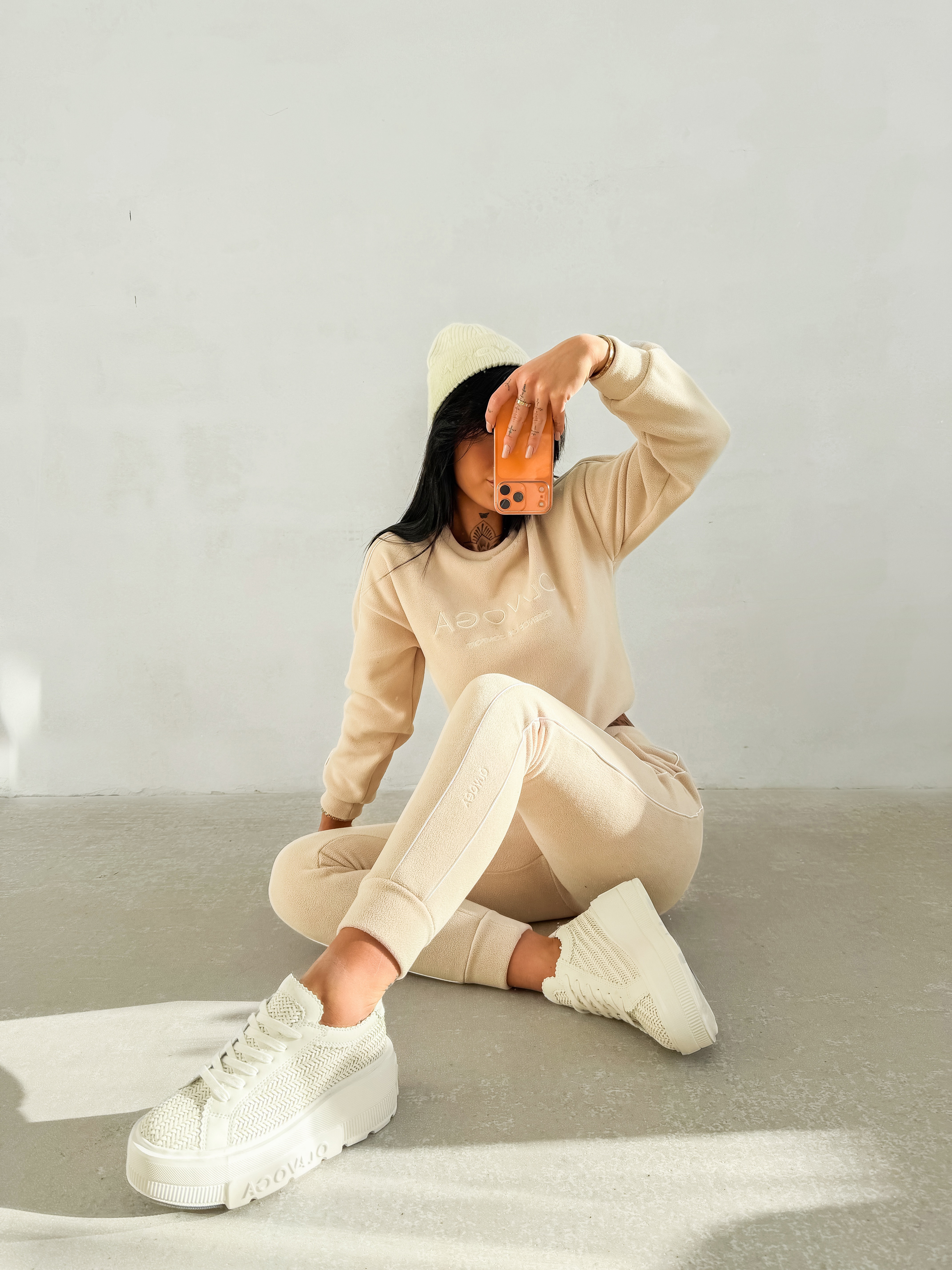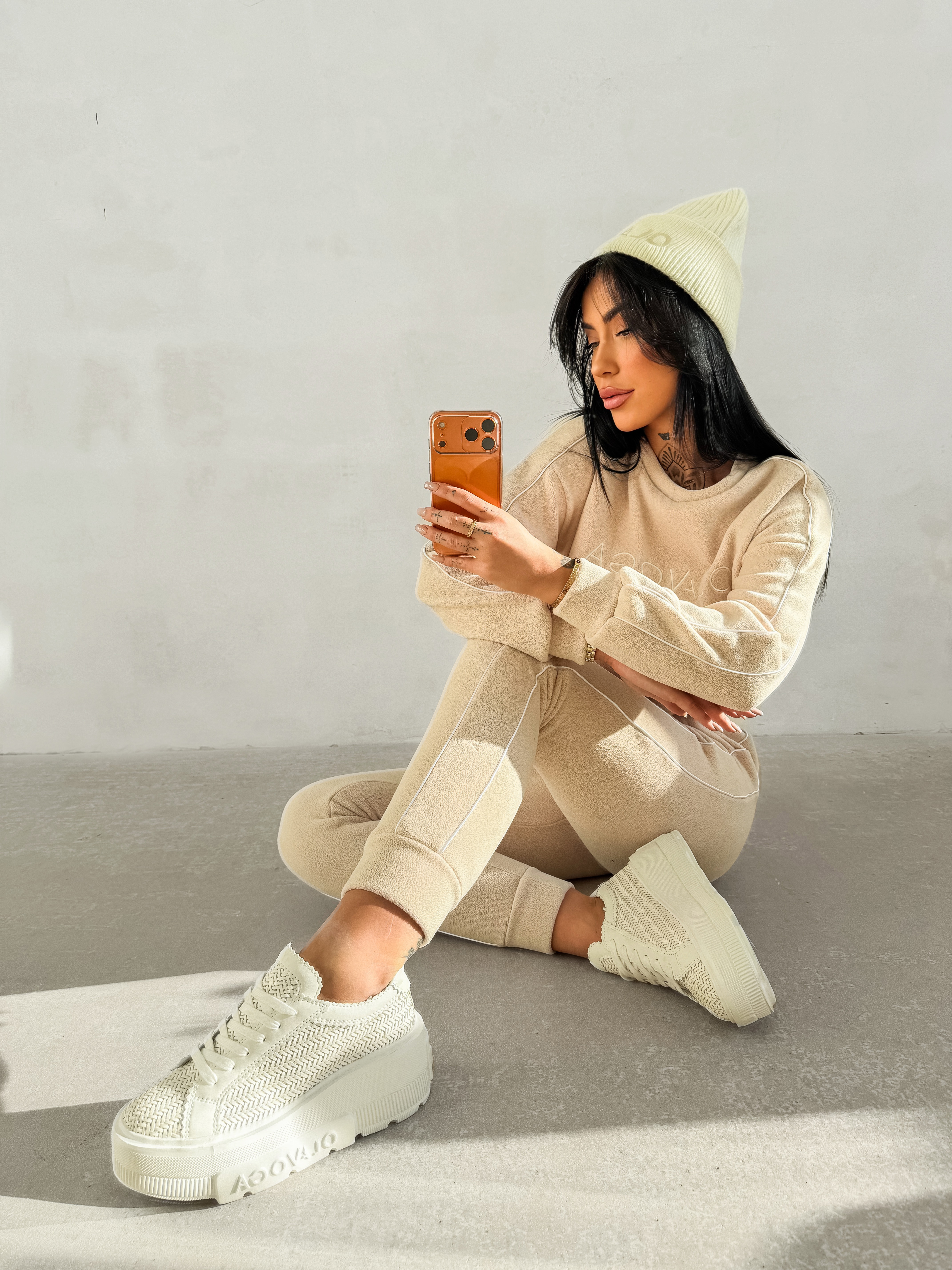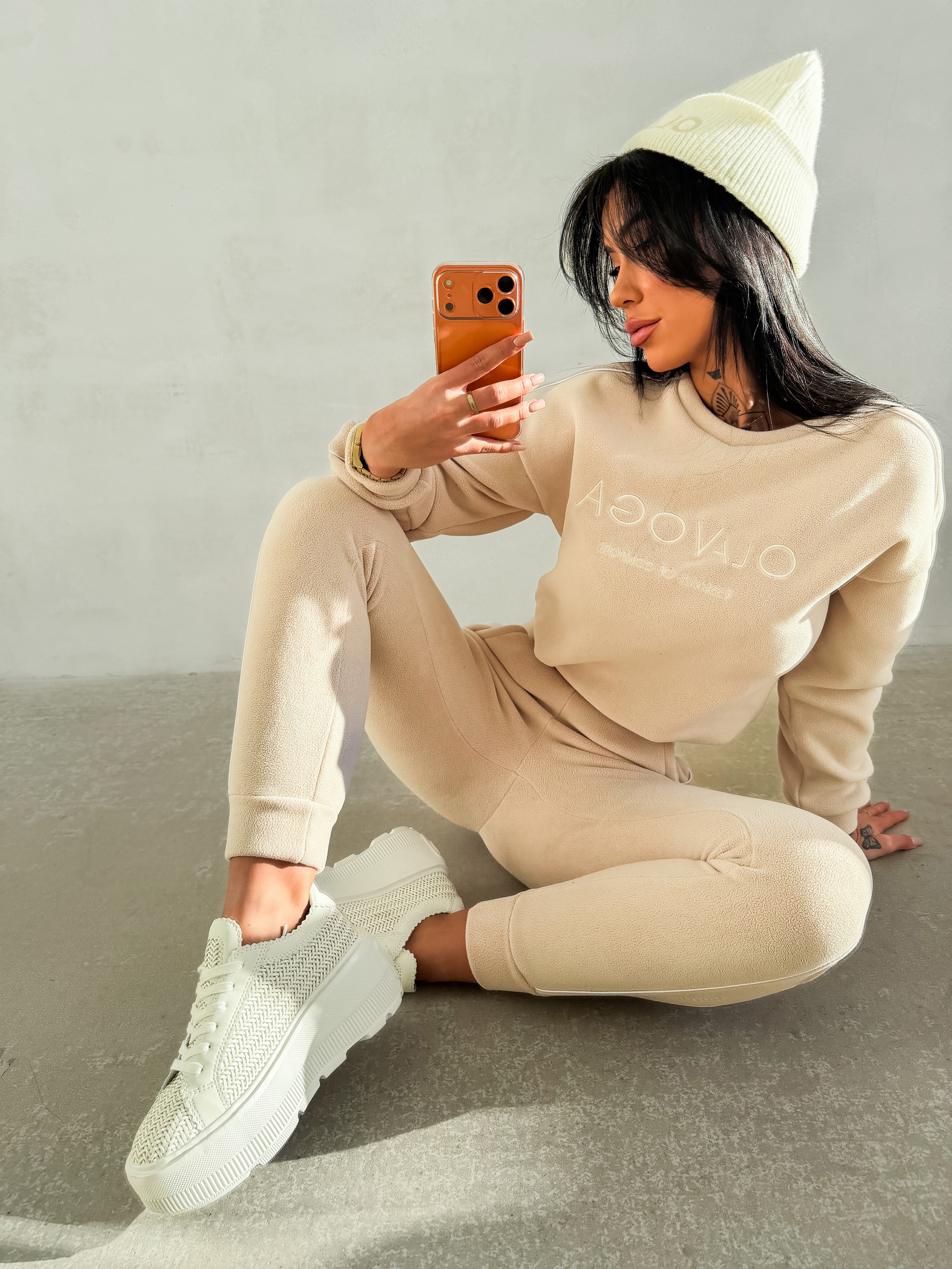 Casualowy komplet wykonany z miękkiego, przyjemnego w dotyku materiału typu polar, o delikatnej, jednolitej strukturze. Góra – bluza o klasycznym kroju z okrągłym dekoltem. Model z długim rękawem, wykończonym elastycznymi ściągaczami. Na przodzie subtelny, tłoczony haft z logo marki OLAVOGA oraz hasłem ,,ESSENCE OF COMFORT”. Wzdłuż rękawów delikatne kontrastowe lampasy. Dół – spodnie z elastycznym pasem, o prostych nogawkach zakończonych ściągaczami. Model wyposażony w boczne kieszenie. Na nogawce umieszczone subtelny haft z logo brandu. Na tyle znajduje się przeszycie. Produkt stworzony z myślą dla Niej i dla Niego.