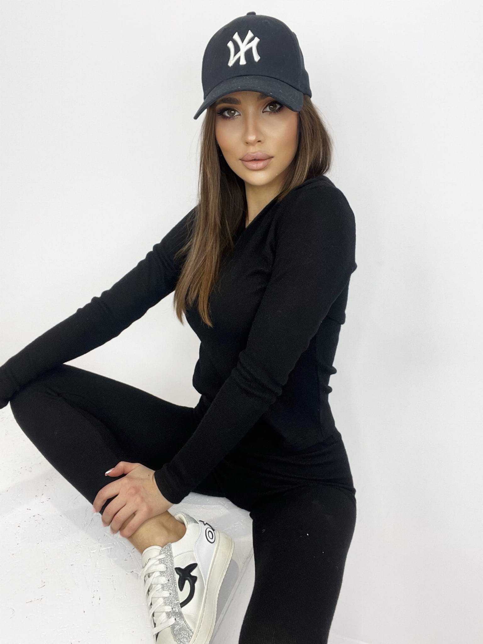 Wygodny zestaw, który warto mieć w szafie! Komplet LINDA wykonany z przyjemnego w dotyku, prążkowanego materiału. Bluzka posiada funkcjonalny kaptur, a legginsy z wyższym stanem kamuflują niedoskonałości.
