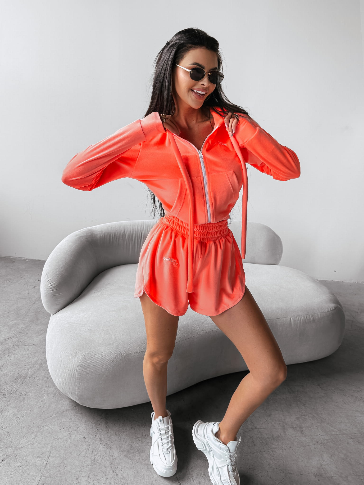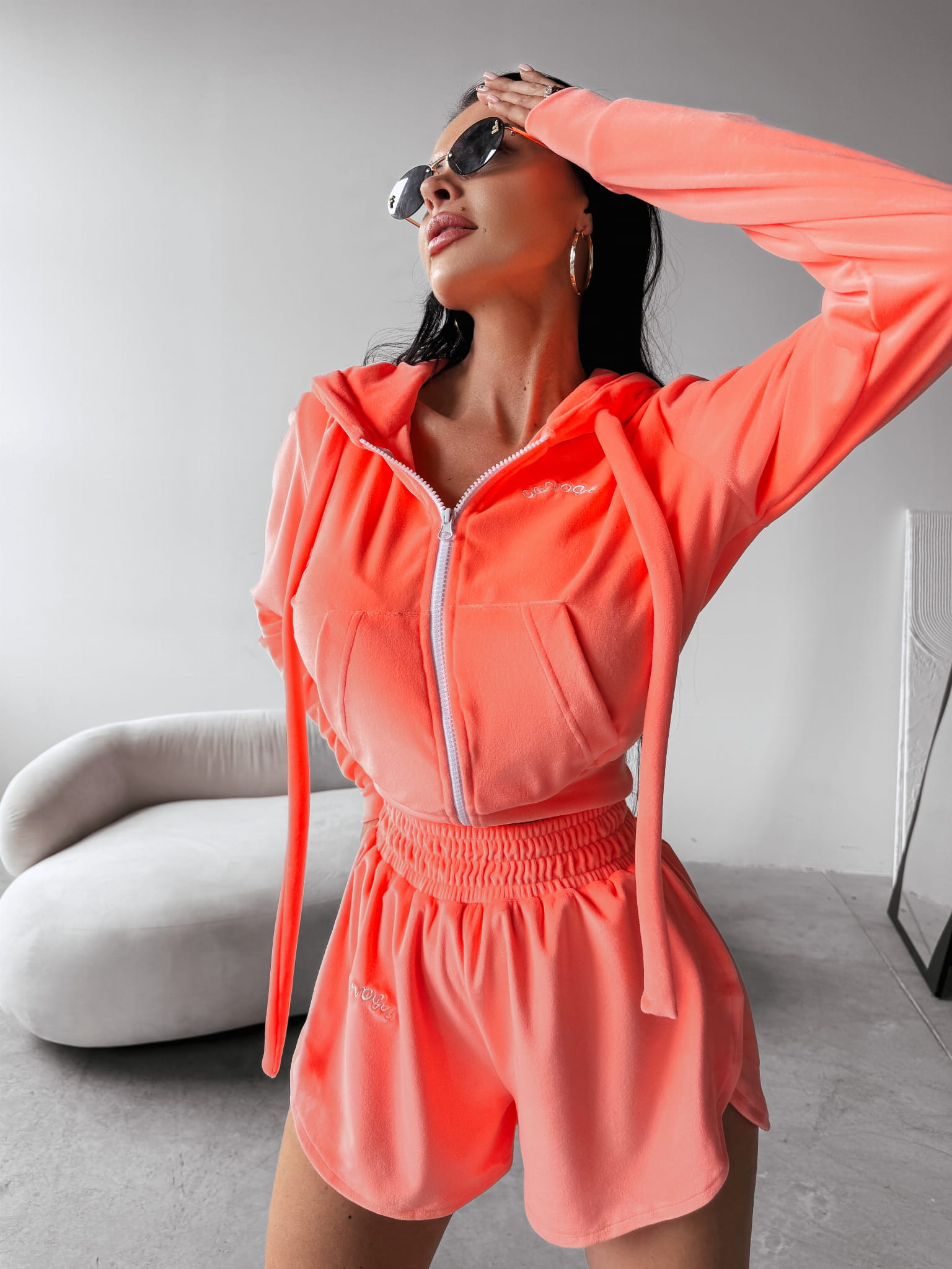Sportowy komplet, wykonany z miękkiego w dotyku weluru. Góra - rozpinana bluza z kapturem. Kaptur regulowany poprzez sznurek. Po bokach kieszenie. Na przodzie pisany, minimalistyczny haft z logo marki OLAVOGA. Dół - spodenki z rozcięciem po bokach. Wysoki stan. Guma w talii. Na przodzie haft z logo brandu.