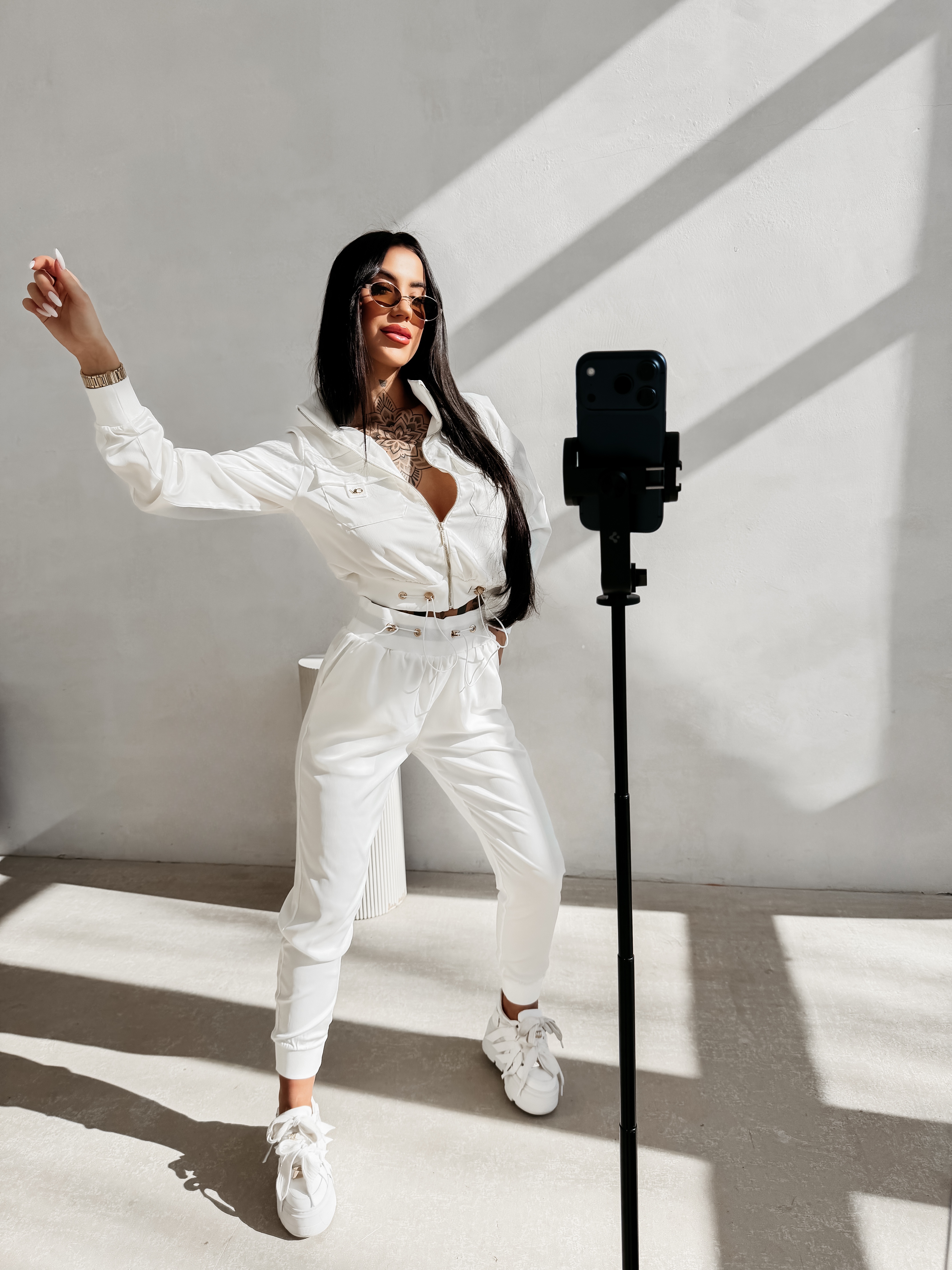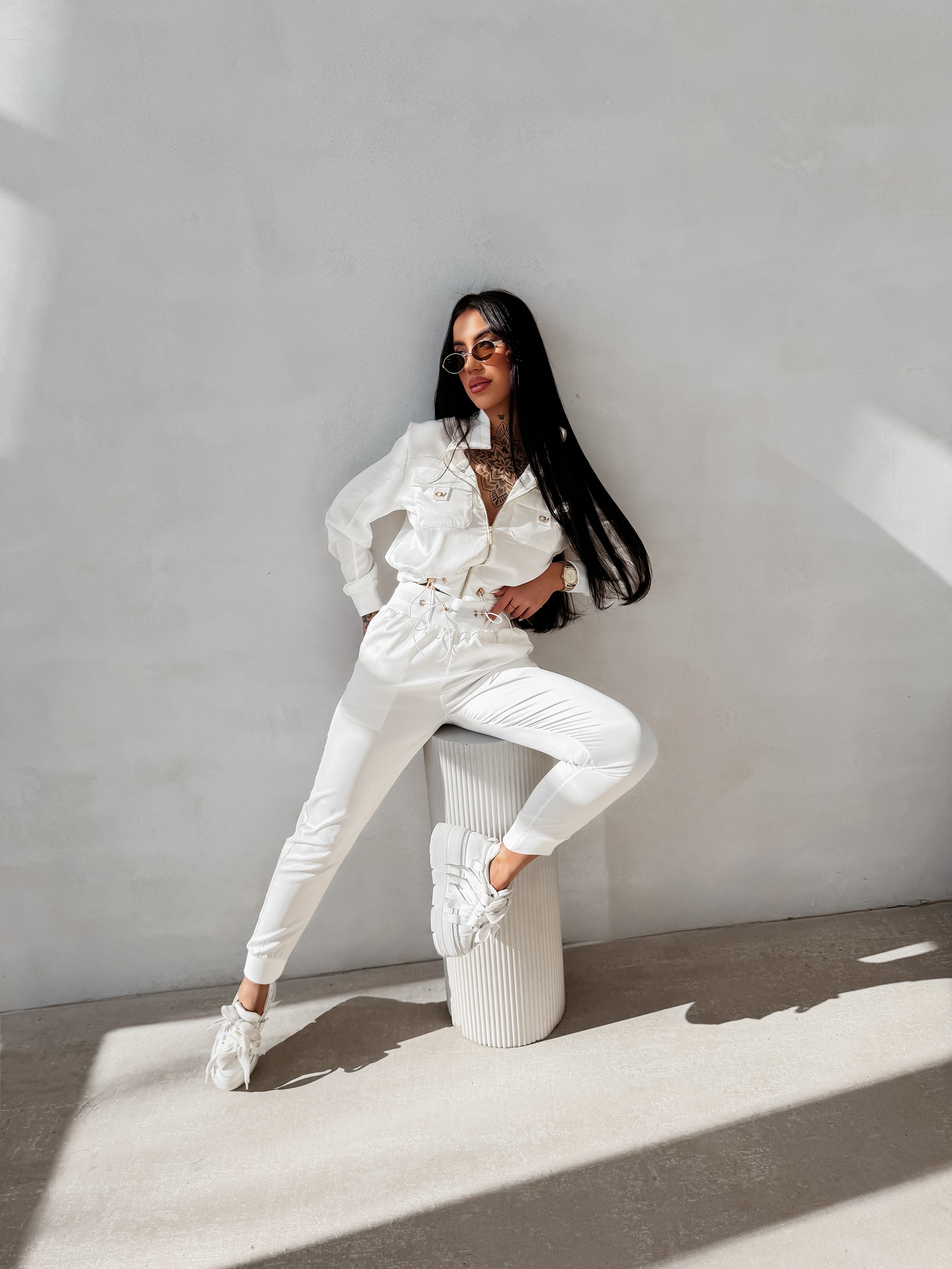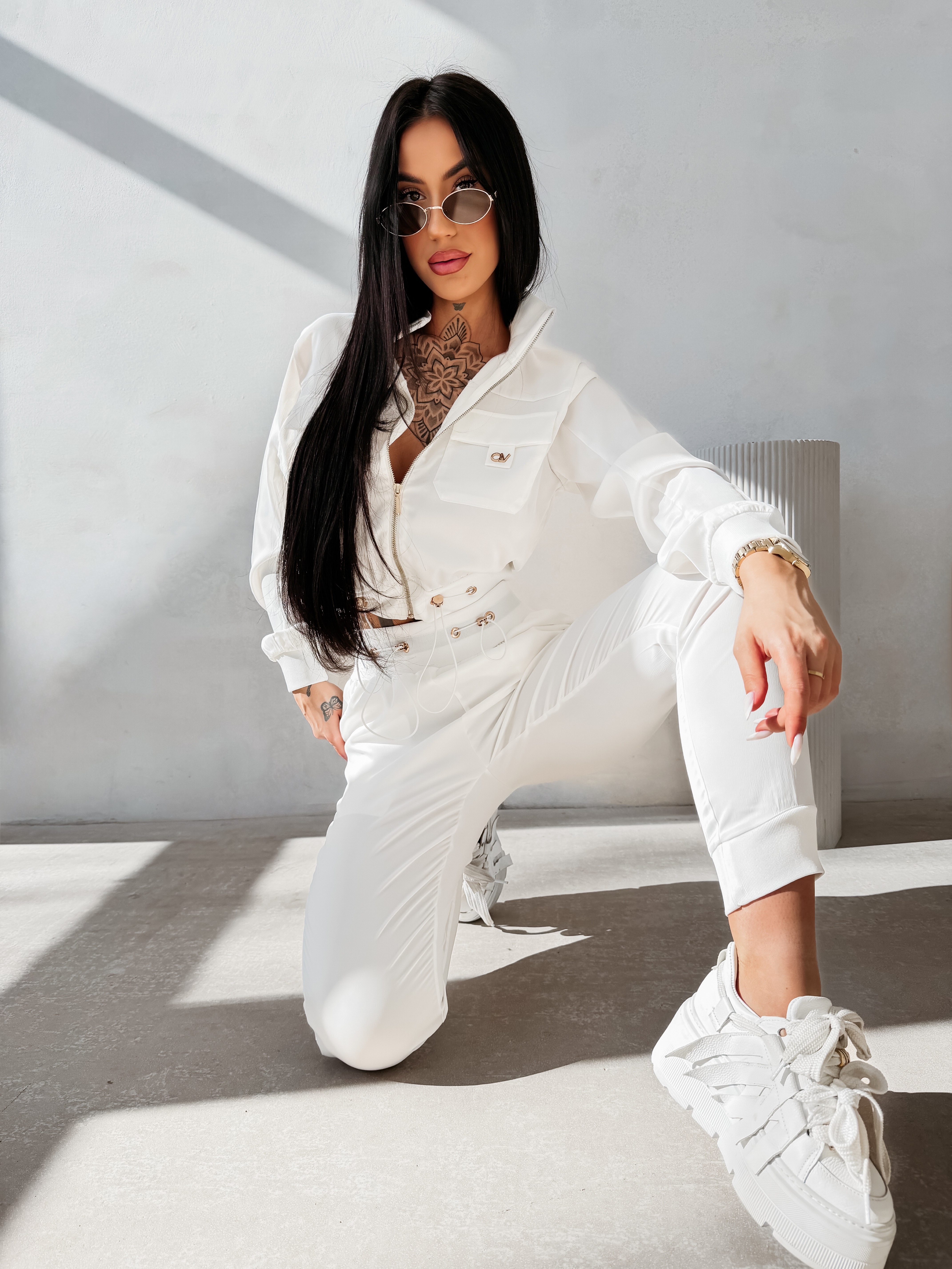 Dopasowany fason - satynowe wykończenie - wysoki elastyczny pas z logo OLAVOGA - złote stopery do regulacji w pasie - ściągacze przy nogawkach - bluza ze stójką ze ściągacza z logo - skrócony fason bluzy - zapięcie na zamek z logowaniem - kieszenie z przodu z ozdobnym złotym OLV - bluza zakończona pasem ze regulowanymi złotymi stoperami