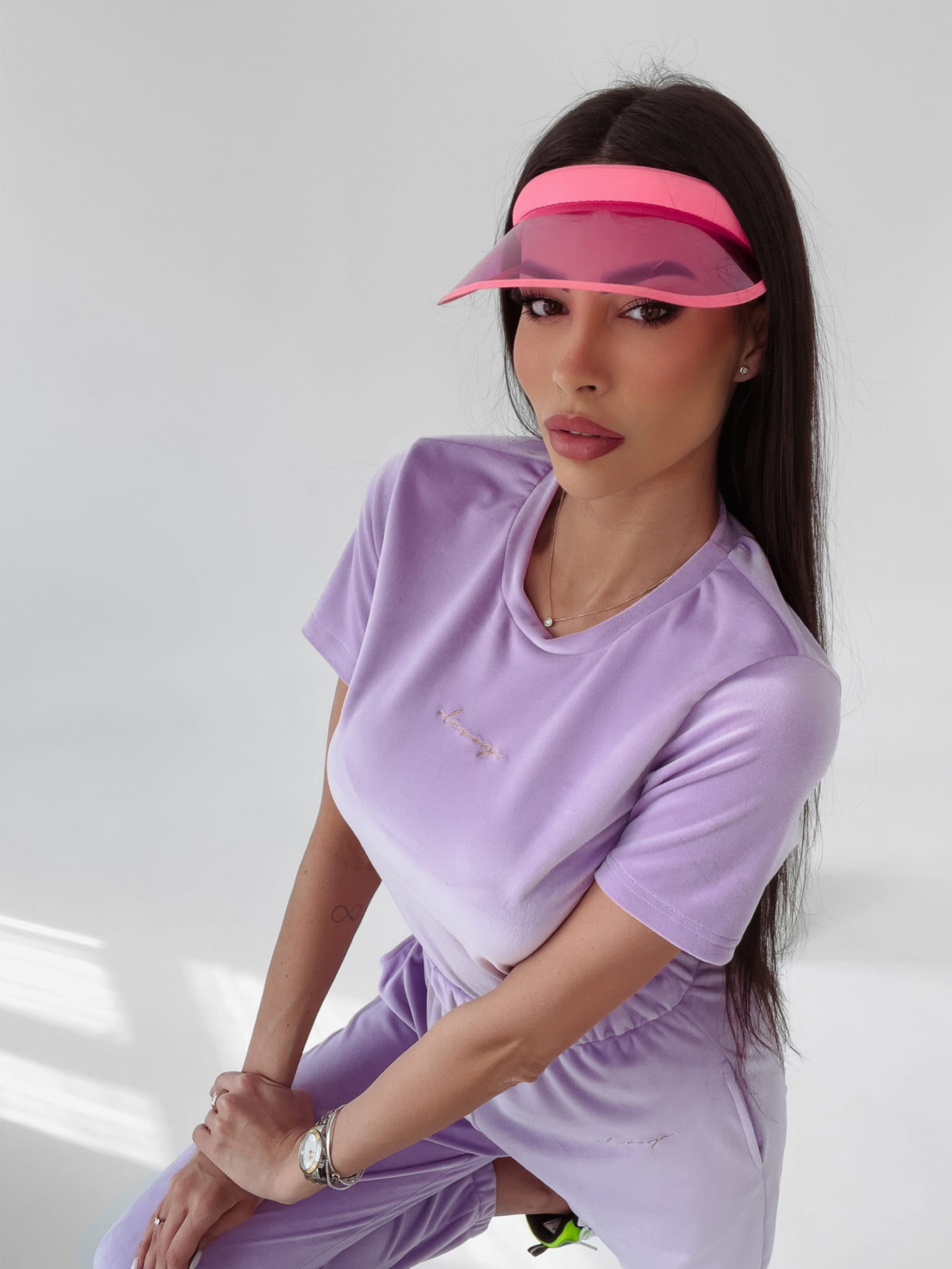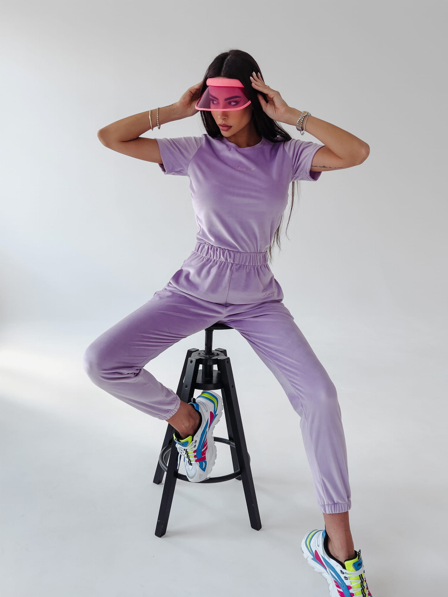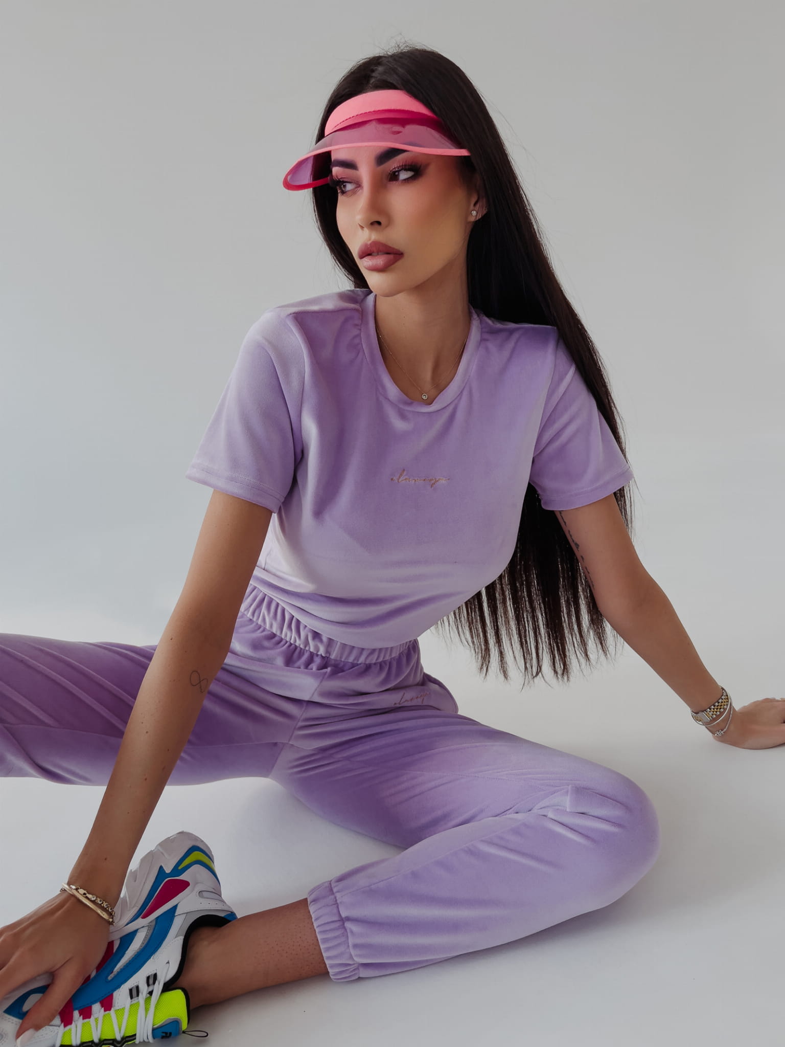 Casualowy komplet uszyty z wysokiej jakości, przyjemnego w dotyku weluru. Komplet składa się z topu z krótkim rękawem i nieco luźniejszych, dresowych spodni, zakończonych ściągaczem w pasie i w nogawkach. Na przodzie topu i spodni delikatny haft. Komplet tworzy zestaw z męską wersją – kompletem LUCA.