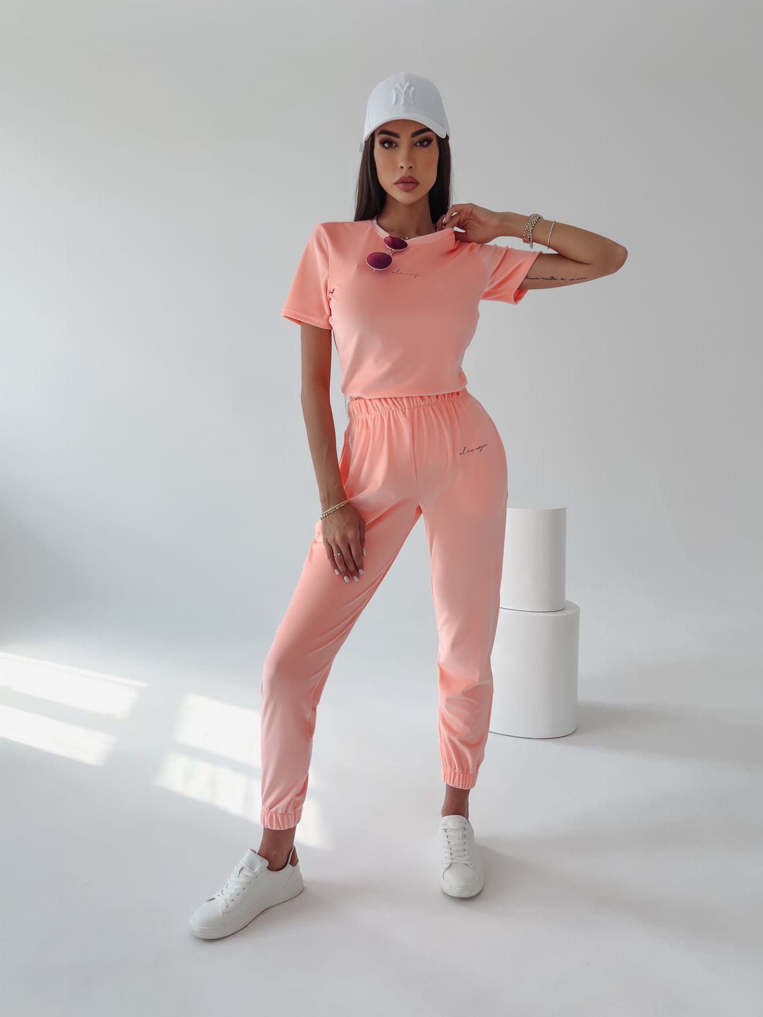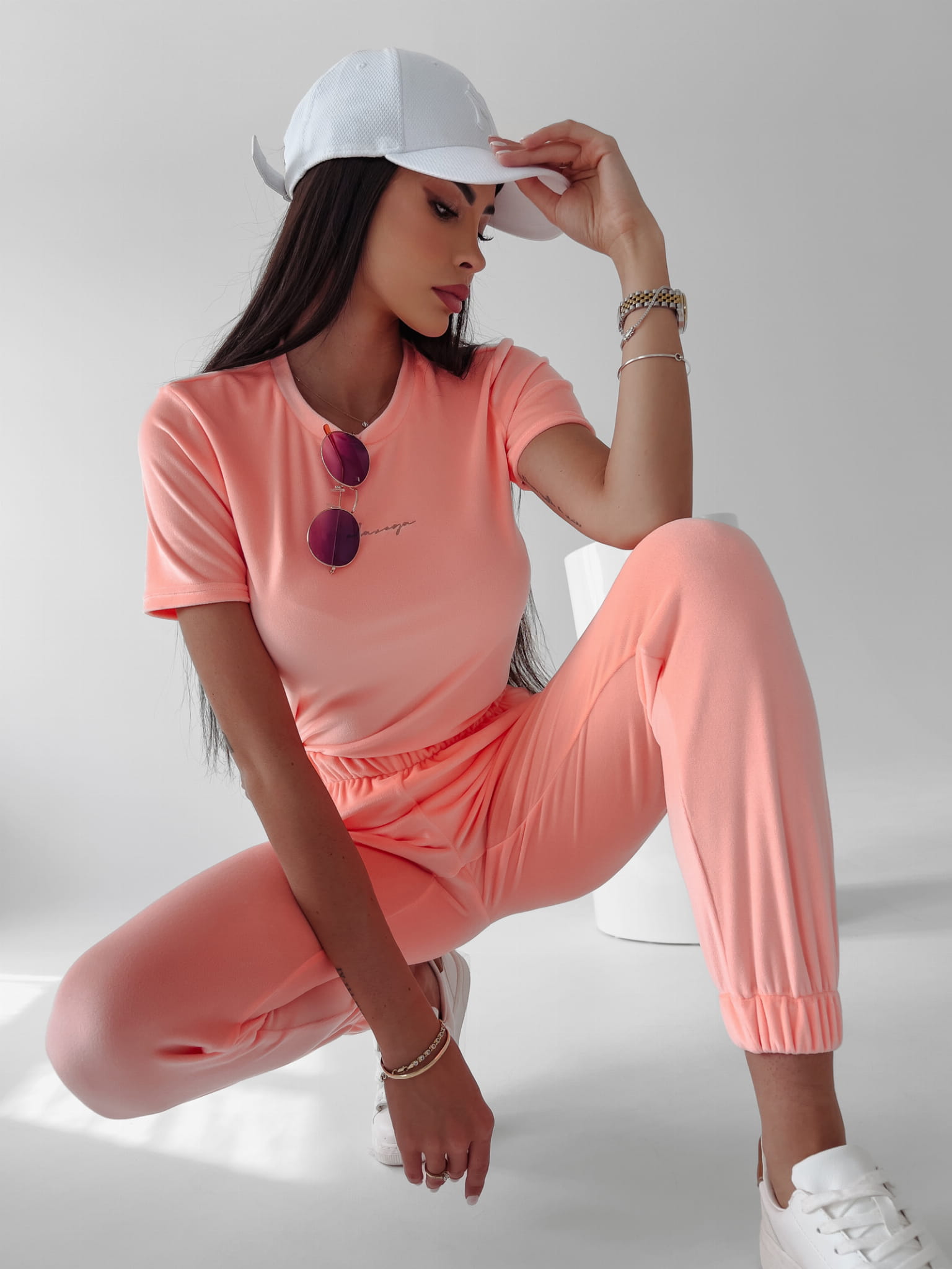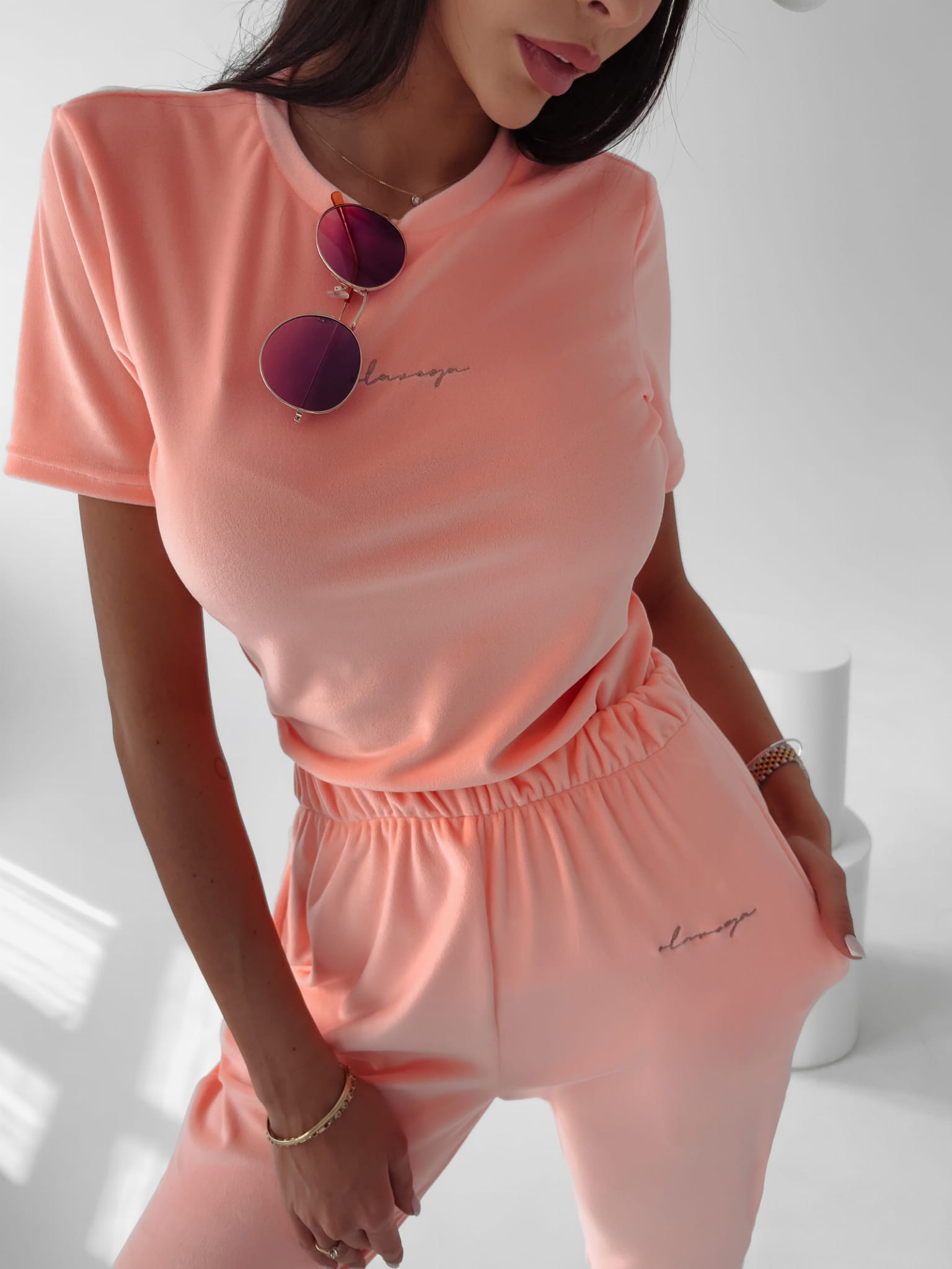 Casualowy komplet uszyty z wysokiej jakości, przyjemnego w dotyku weluru. Komplet składa się z topu z krótkim rękawem i nieco luźniejszych, dresowych spodni, zakończonych ściągaczem w pasie i w nogawkach. Na przodzie topu i spodni delikatny haft. Komplet tworzy zestaw z męską wersją – kompletem LUCA.