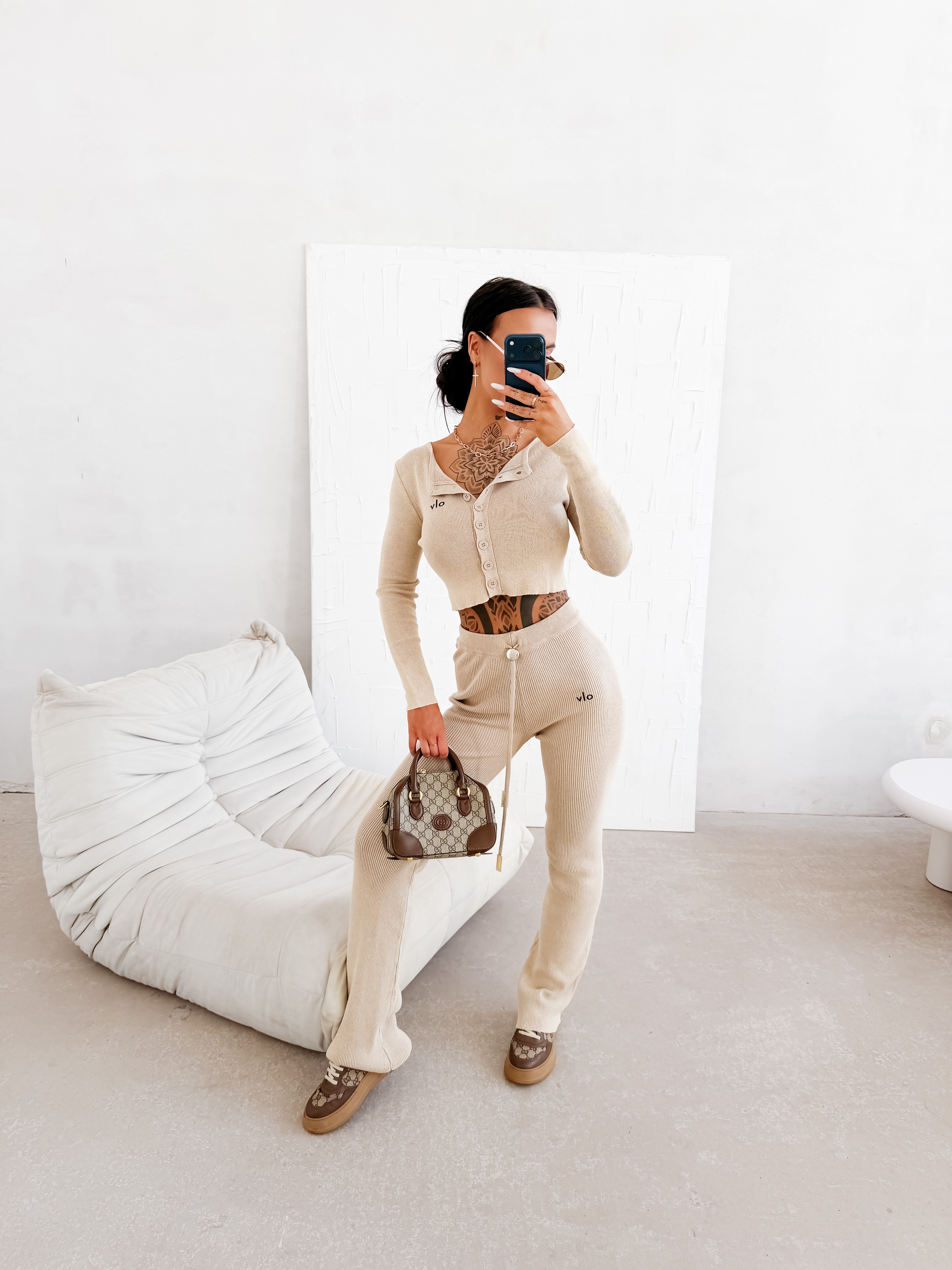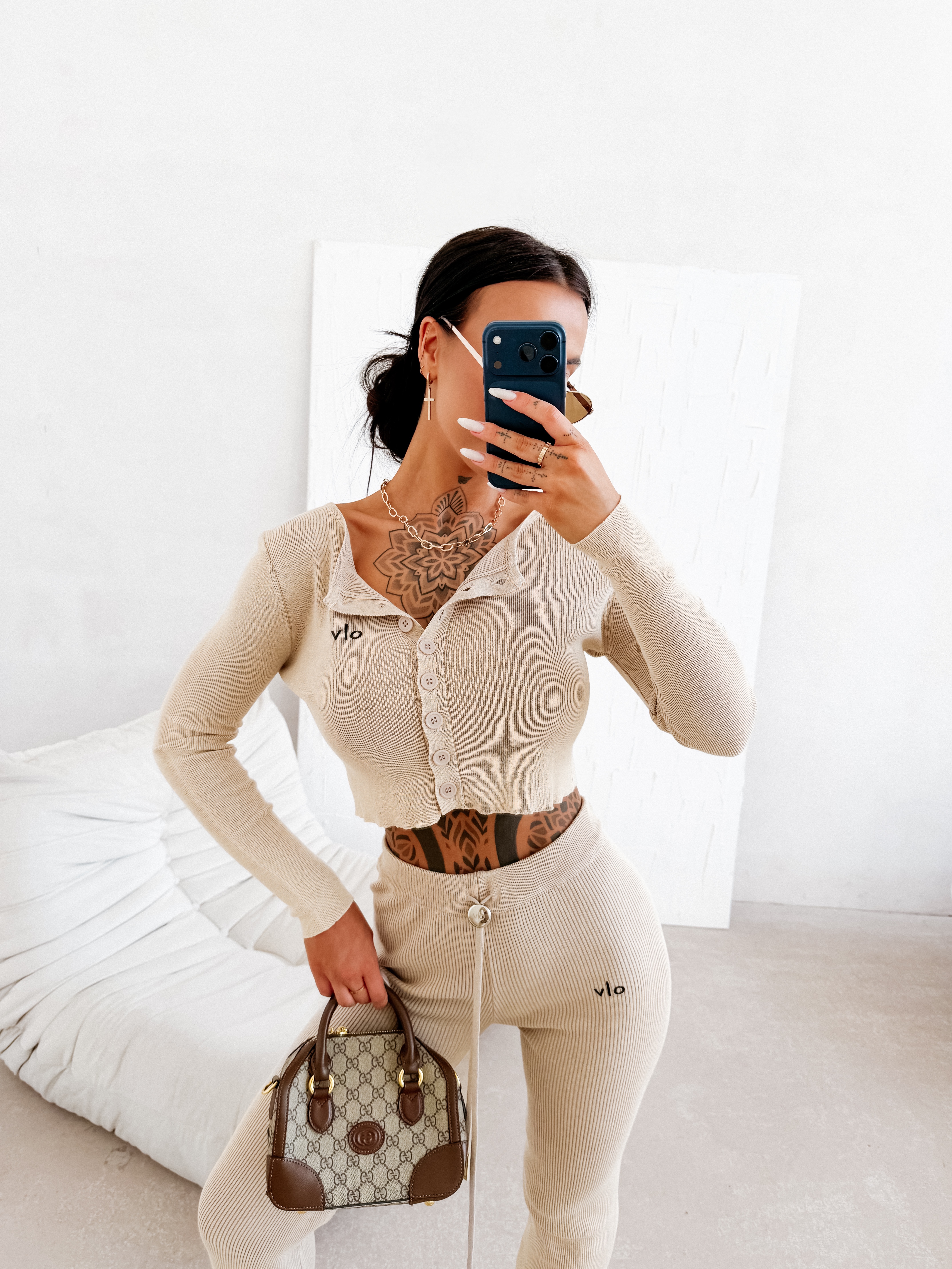 Top o skróconym kroju - zapinany na guziki - prążkowana sweterkowa dzianina - długi rękaw - zaokrąglony dekolt - subtelne logo OLV na przodzie Spodnie o dopasowanym kroju - wyższy stan - regulacja w pasie - ozdobny metalowy stoper z logo OLV - sznureczki zakończone skórzanymi logowanymi agletami