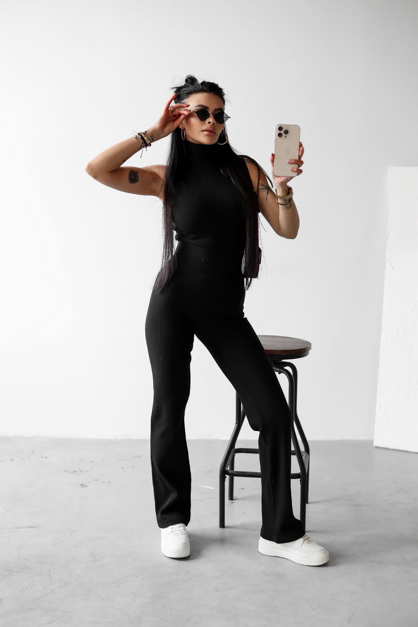 Komplet wykonany z wysokiej jakości prążkowanego materiału. Góra - golf, bez rękawów, o delikatnie krótszym kroju. Na tyle odpowiadający mu wariantem kolorystycznym suwak. Przód posiada minimalistyczny haft z logo marki OLAVOGA. Dół - przylegające spodnie rozszerzane ku dołowi. Logowana guma w pasie.