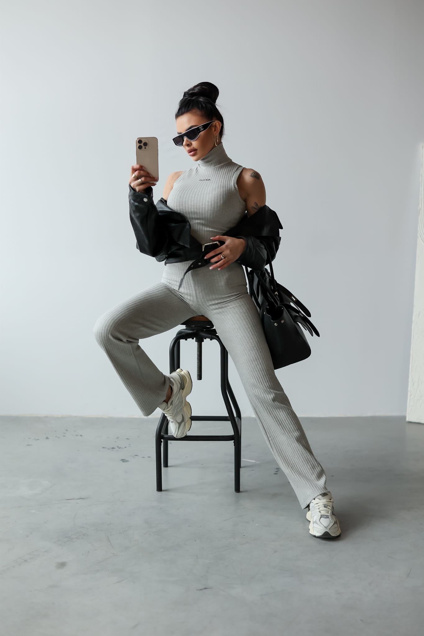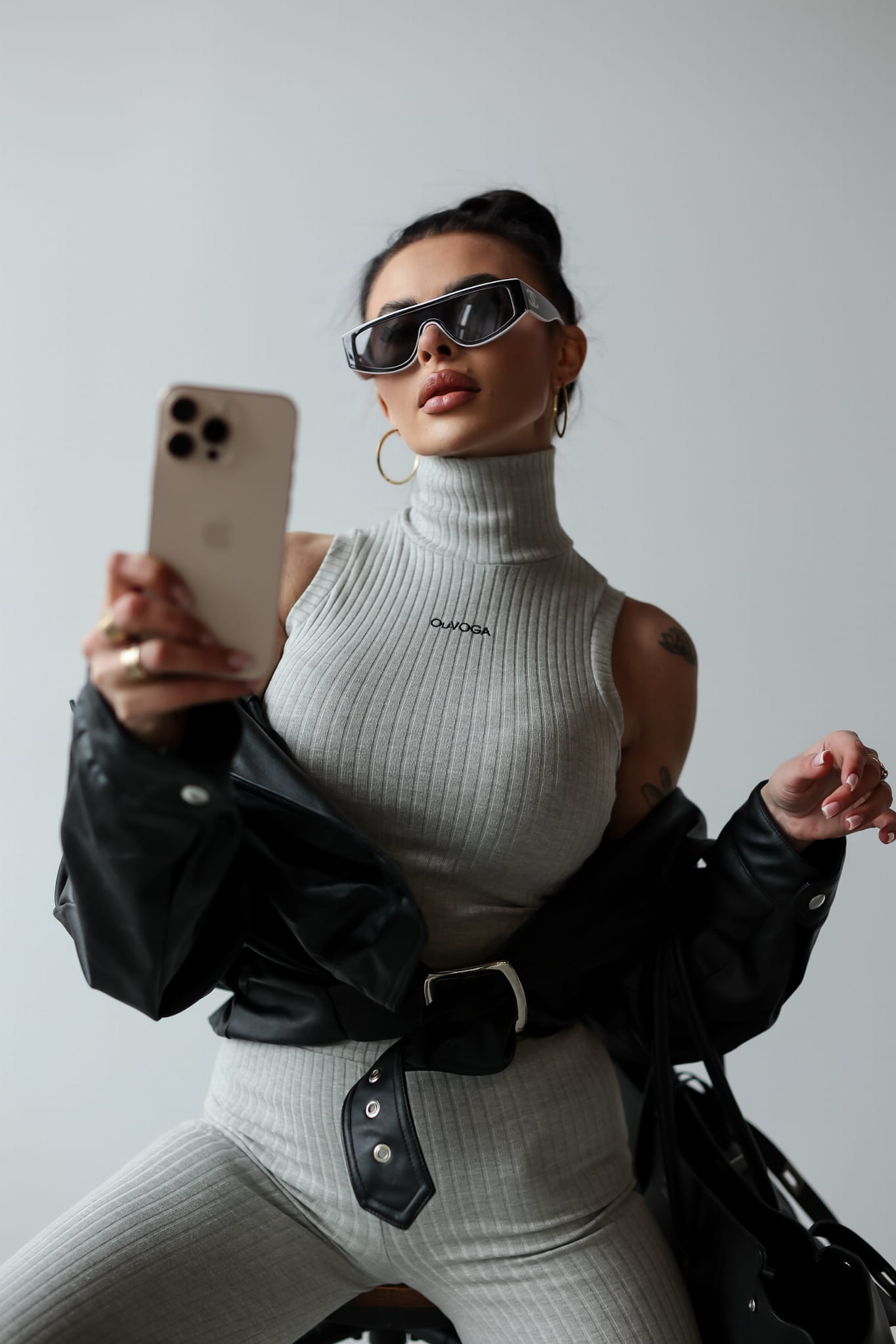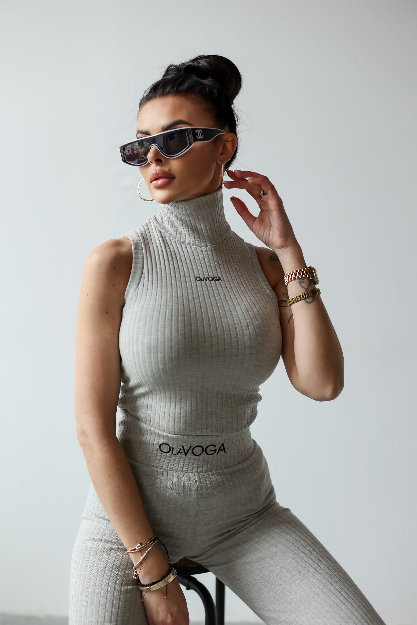 Komplet wykonany z wysokiej jakości prążkowanego materiału. Góra - golf, bez rękawów, o delikatnie krótszym kroju. Na tyle odpowiadający mu wariantem kolorystycznym suwak. Przód posiada minimalistyczny haft z logo marki OLAVOGA. Dół - przylegające spodnie rozszerzane ku dołowi. Logowana guma w pasie.