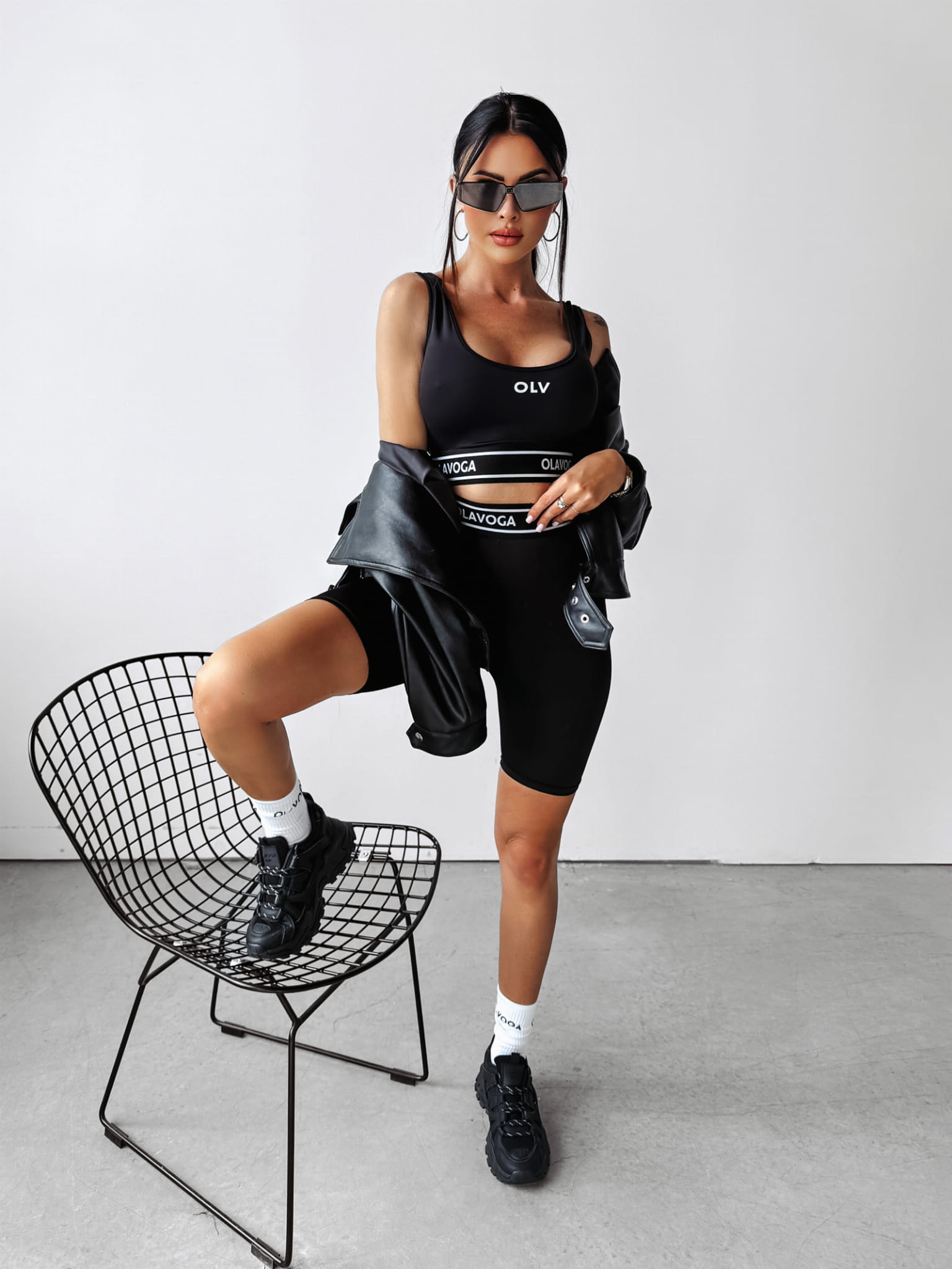 Komplet sportowy wykonany z wysokiej jakości elastycznego materiału. Góra - crop top, bez rękawów, o krótszym kroju. Logowana guma oraz minimalistyczny napis OLV. Dół - spodnie typu kolarki z logowaną gumą. Posiada wyższy stan oraz minimalistyczny napis OLV.